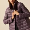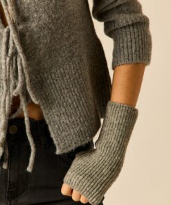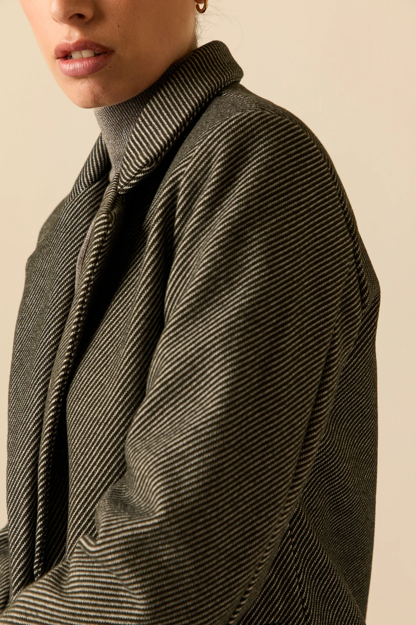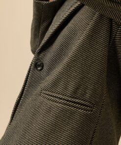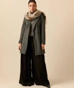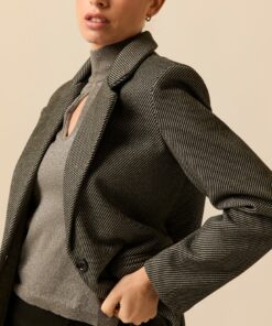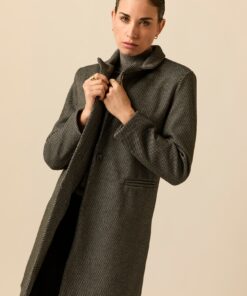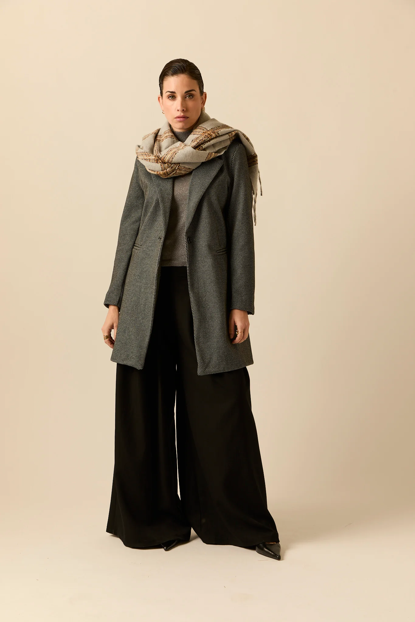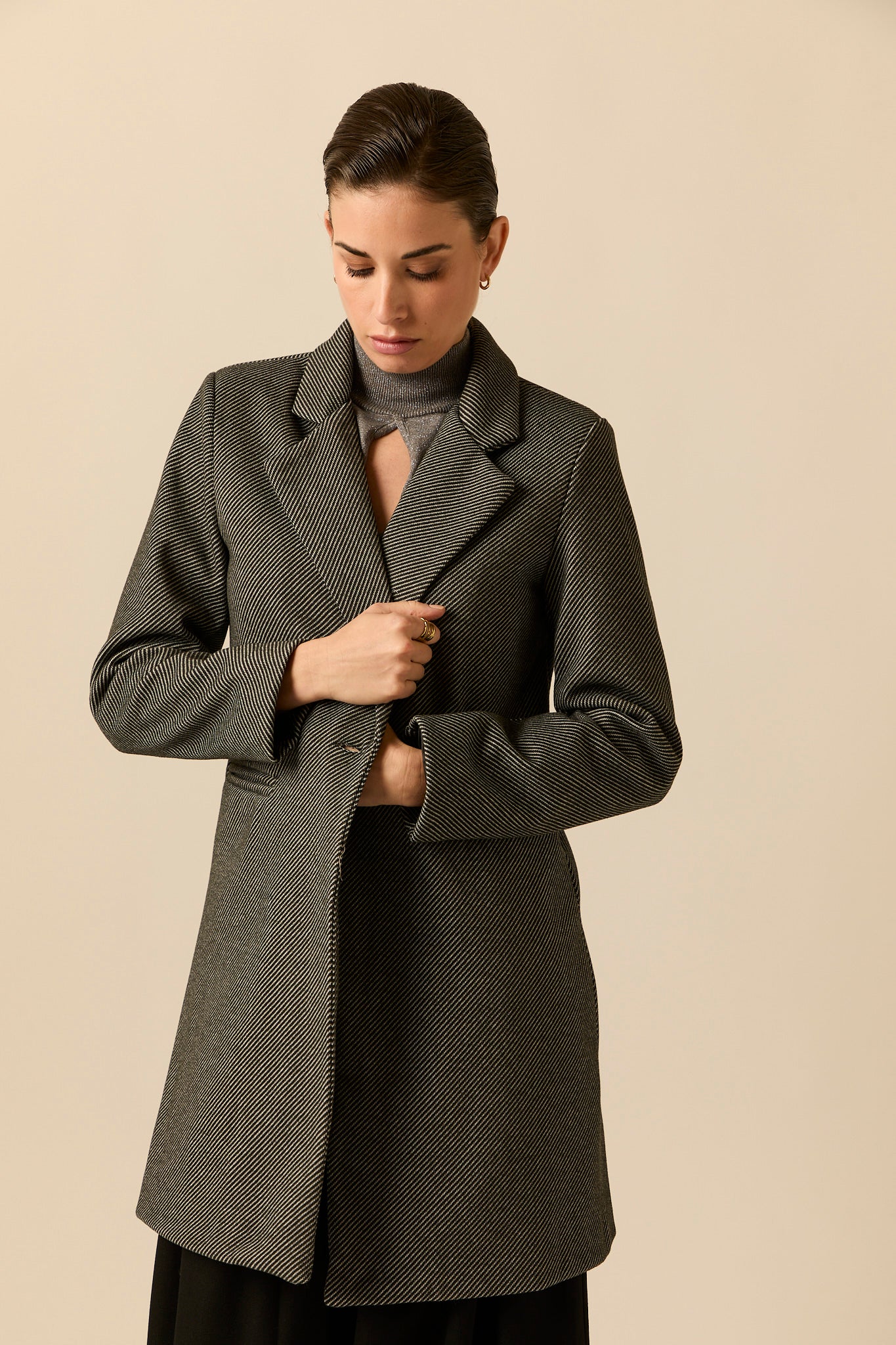 Abrigo clásico de estampado espiga en color gris. Cuello de solapa, manga larga, cierre de un botón y detalle de falsos bolsillos laterales.