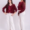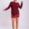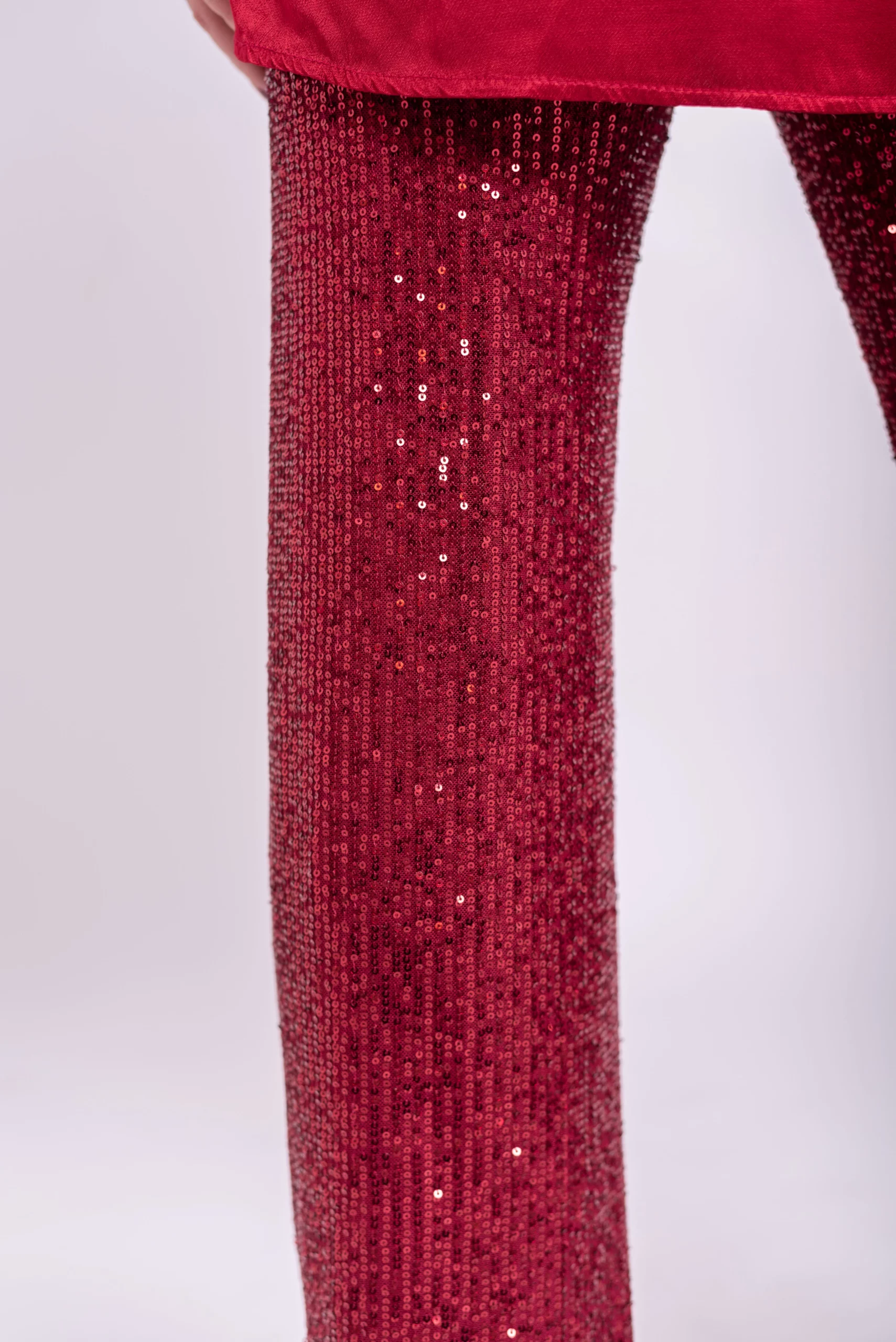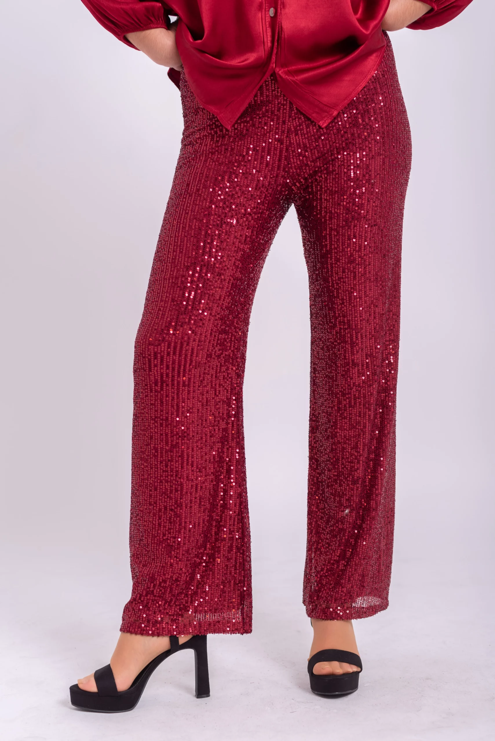 Pantalón lentejuelas en tono burdeos. Goma en cintura. Una prenda perfecta para las fiestas de la temporada. Combinalo con la blusa Mariana para un total look ideal.