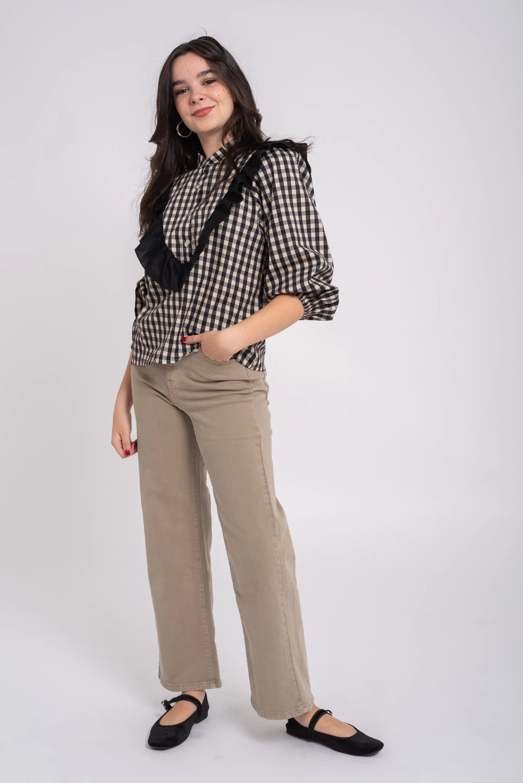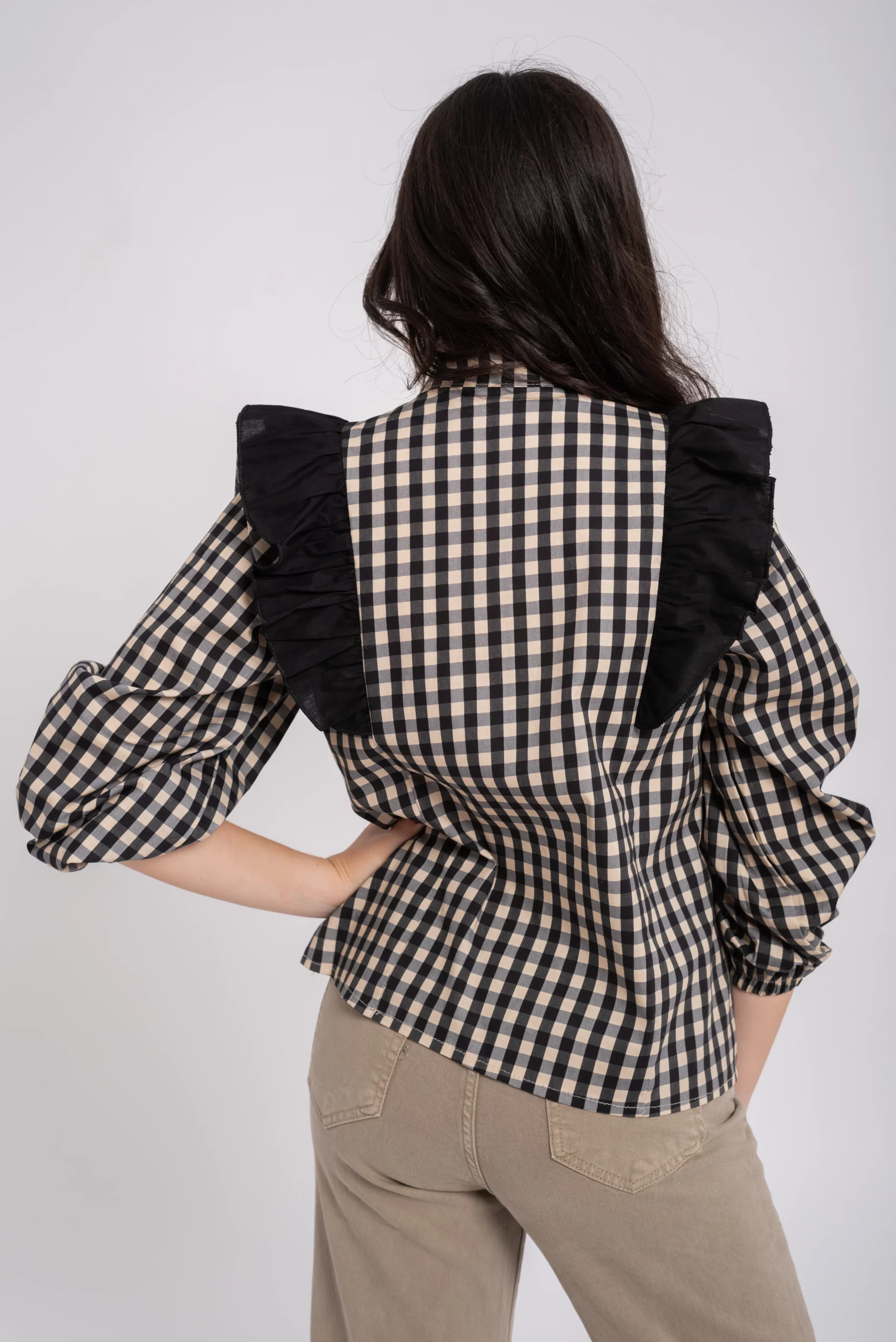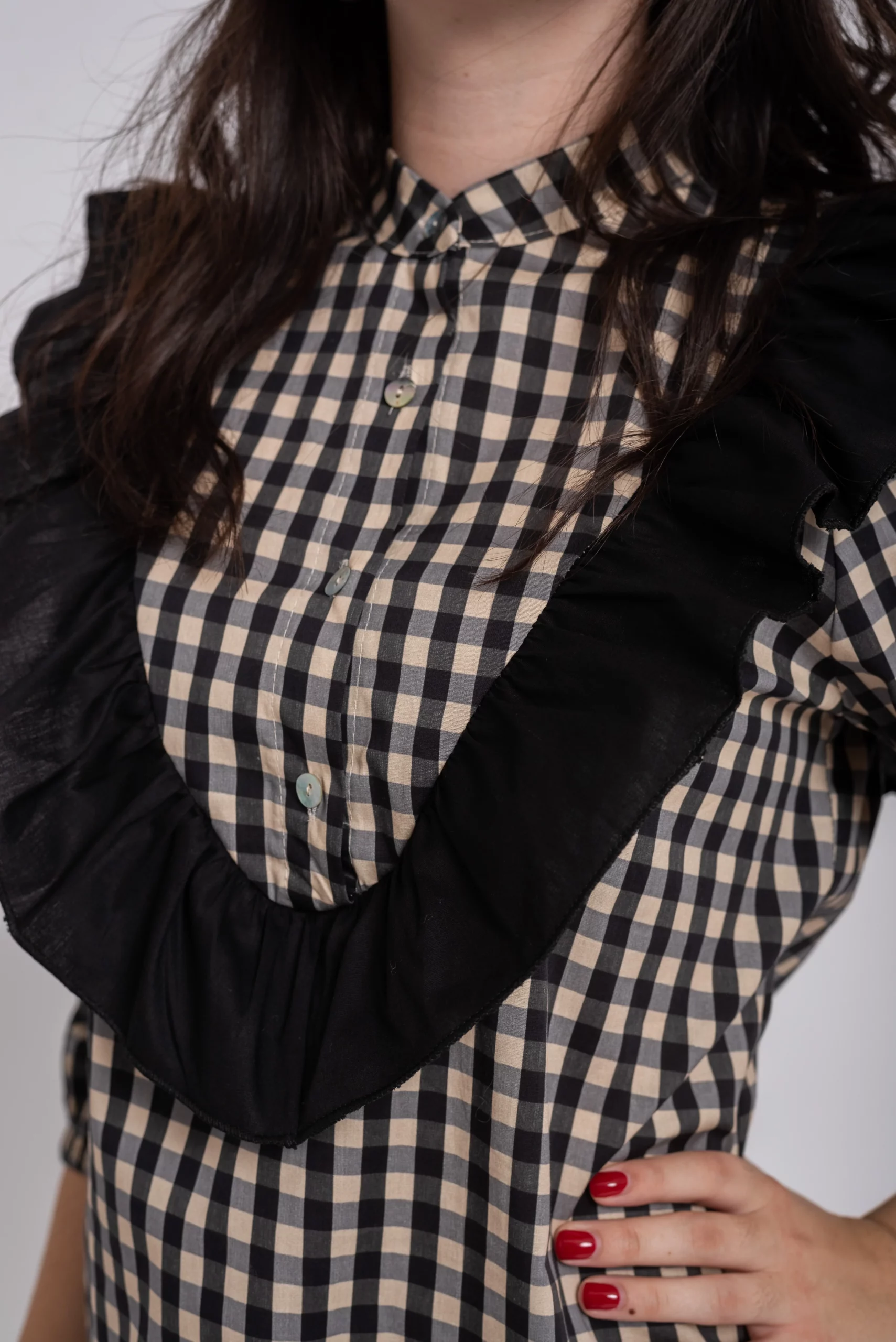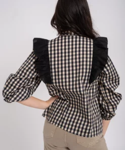 Blusa vichy. Cuello mao. Cierre botones. Detalle de volante en uve sobre el pecho en tono a contraste. Manga larga con goma en puño.