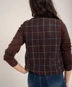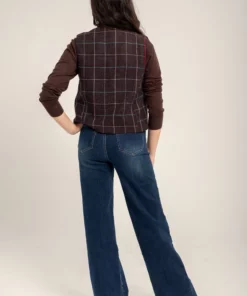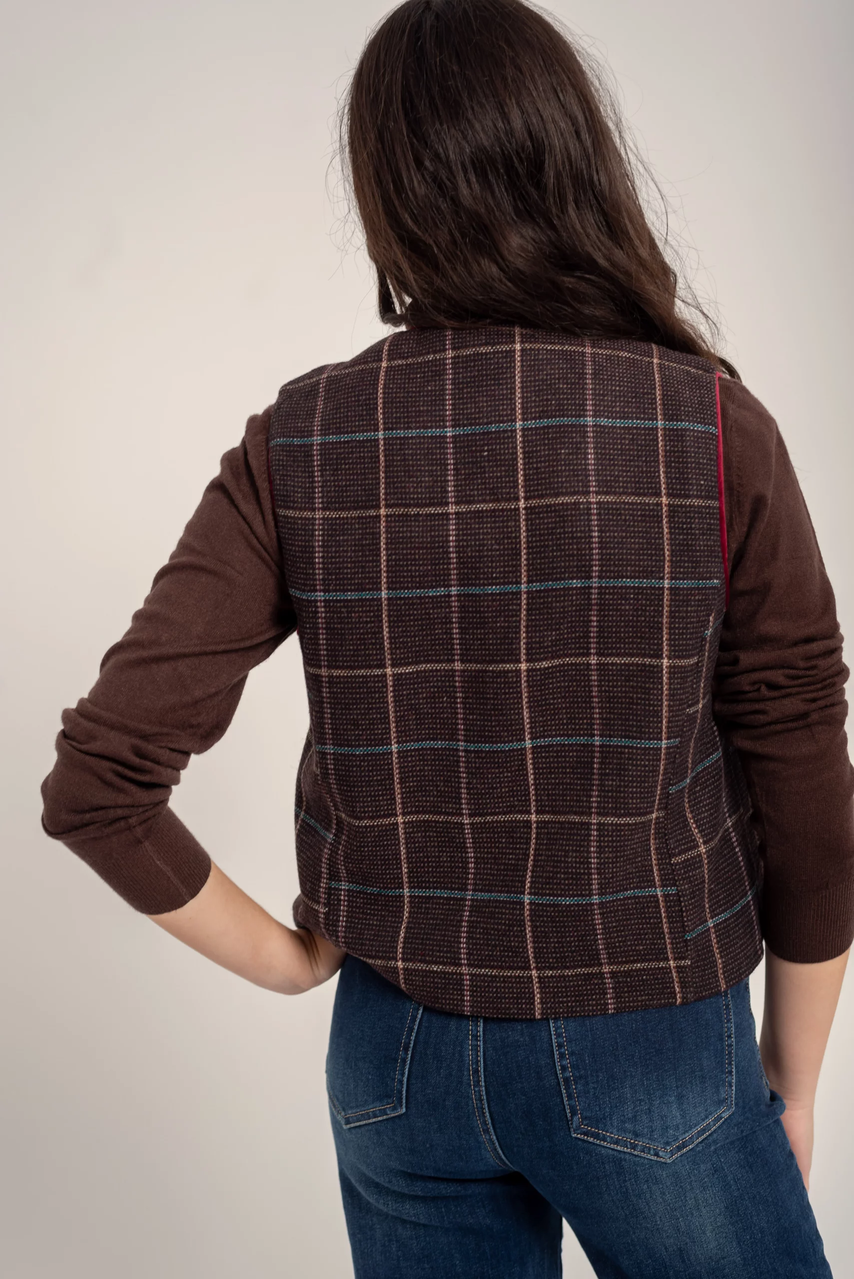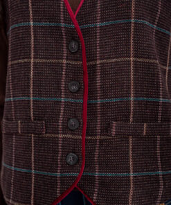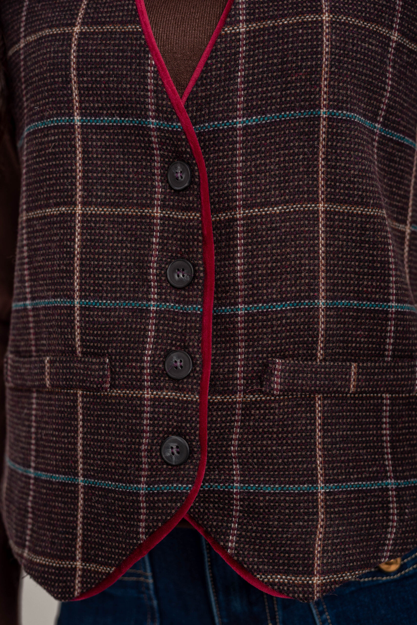 Chaleco sastre. Estampado principe de gales en tono chocolate. Ribete de chaleco en terciopelo borgoña. Abotonado en frontal.