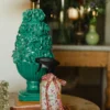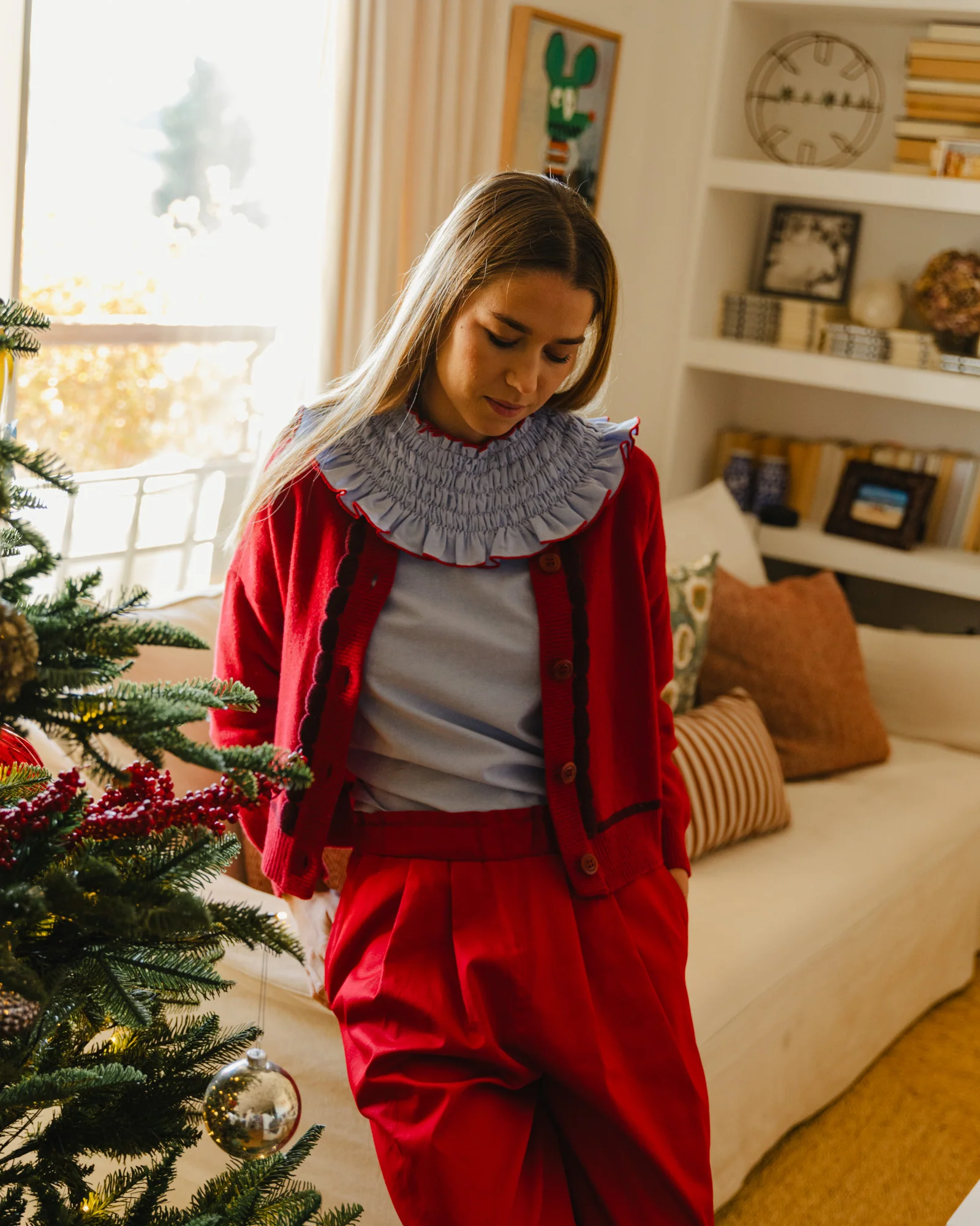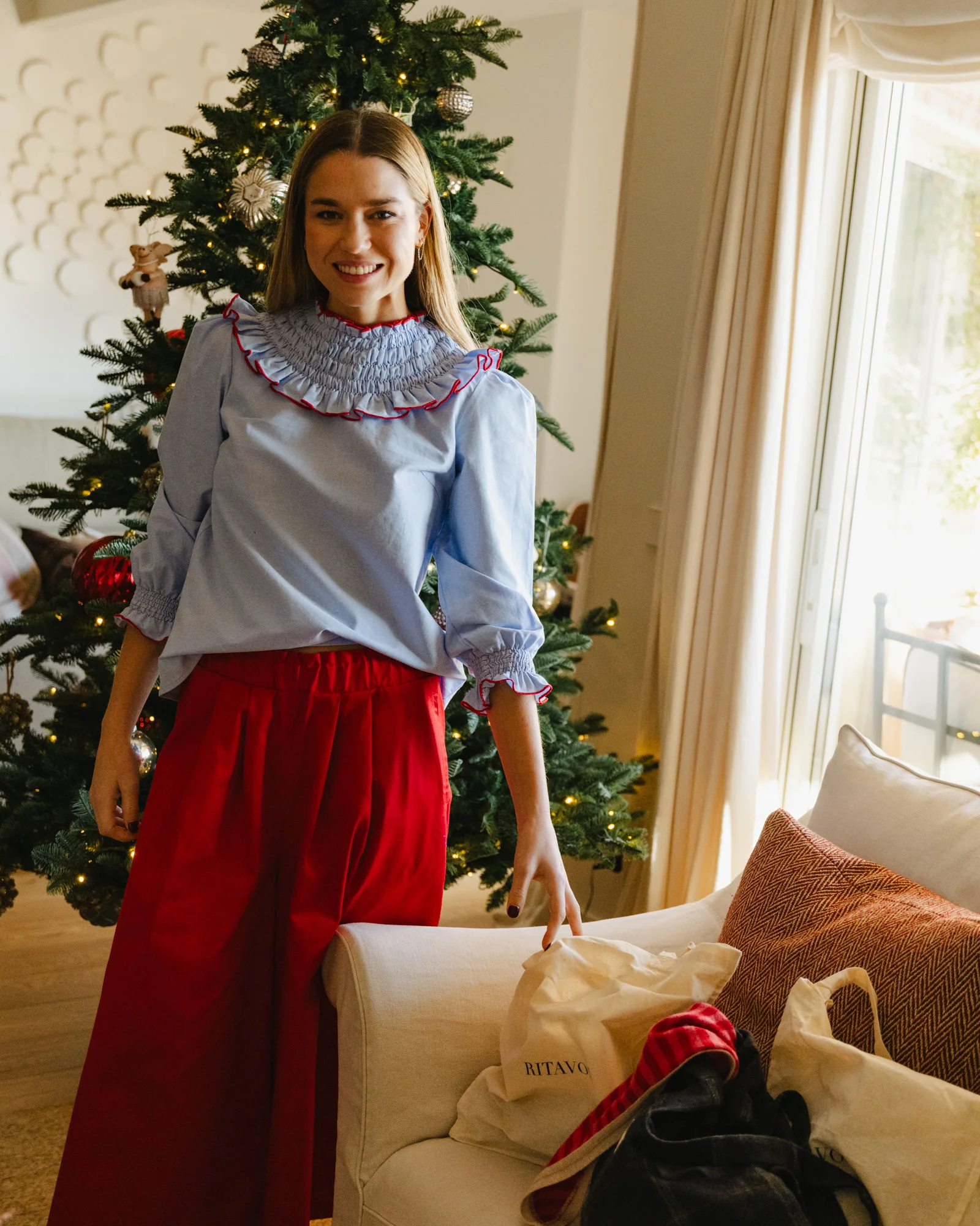 Algodón azul oxford y un favorecedor repulgo rojo que hace súper navideño.