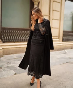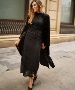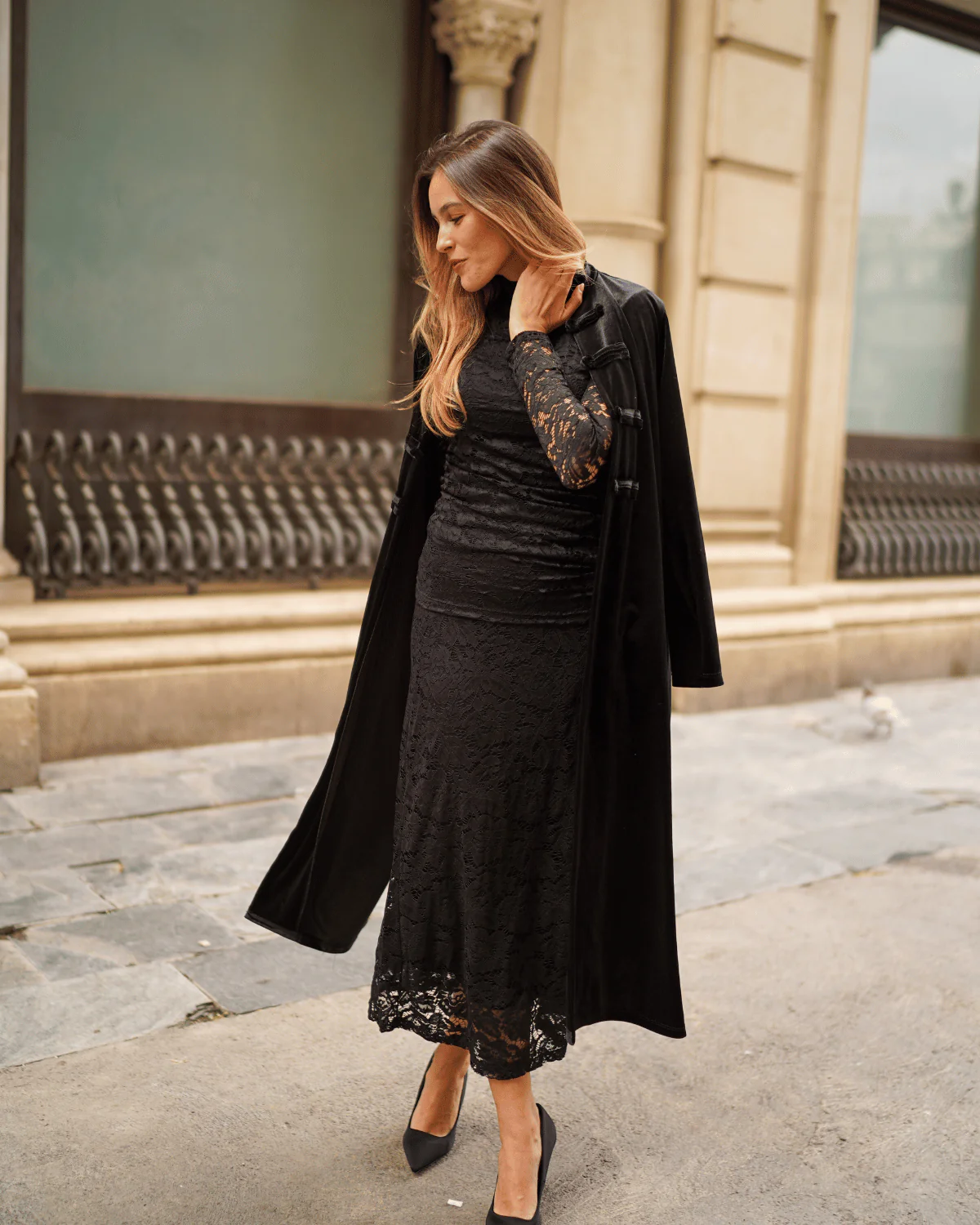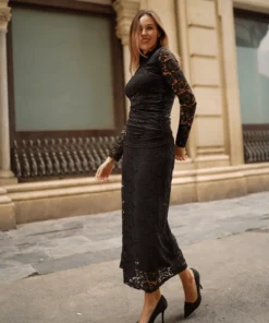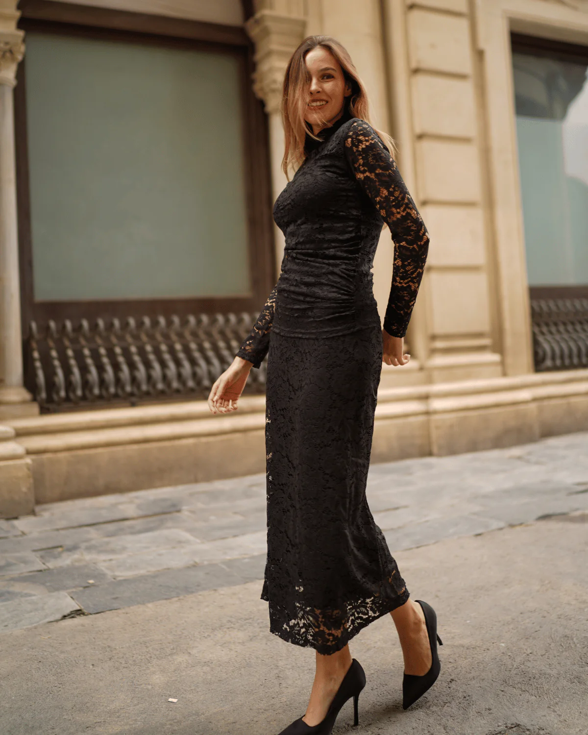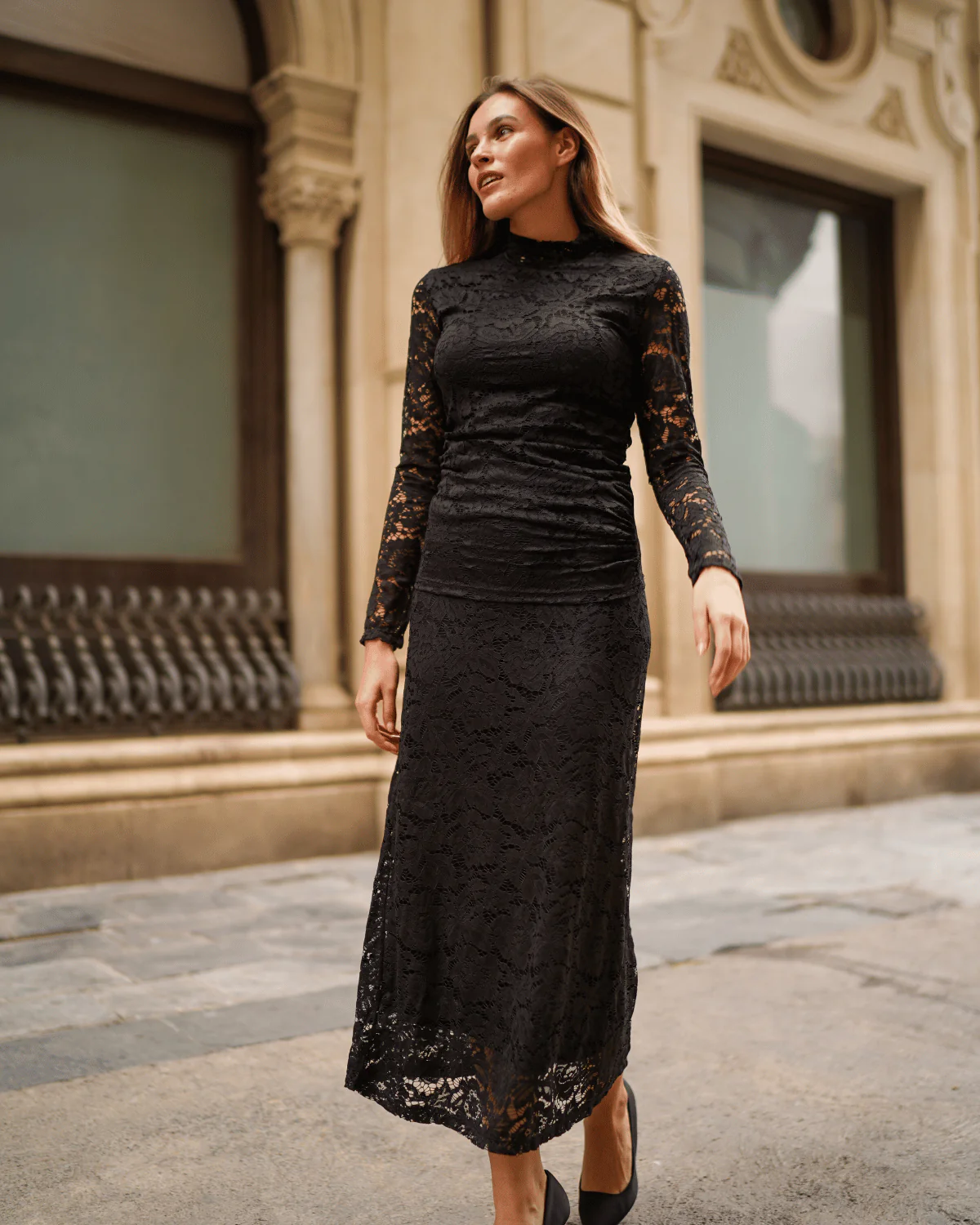 - Blusa entallada de encaje, manga larga y cuello alto.