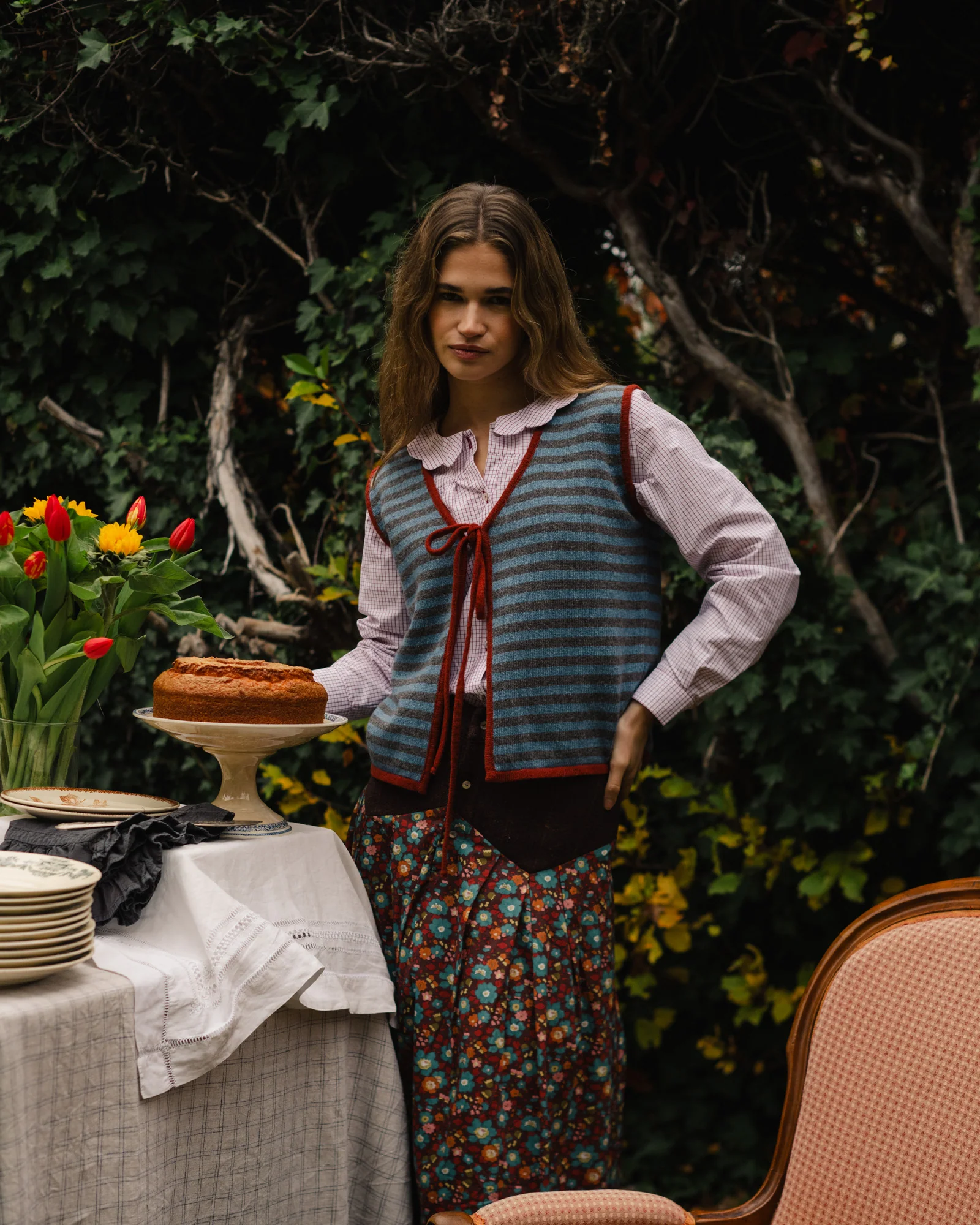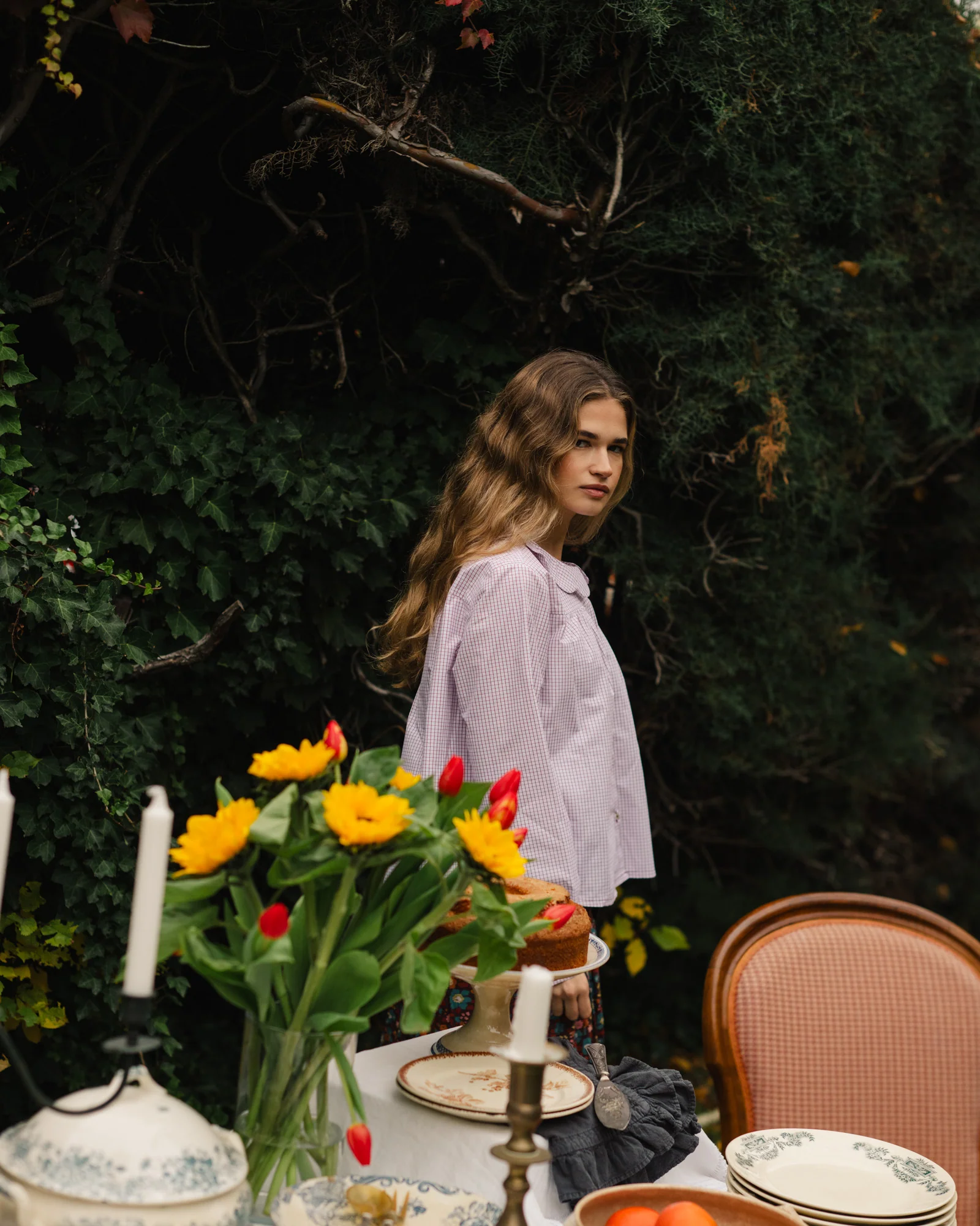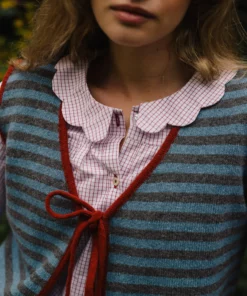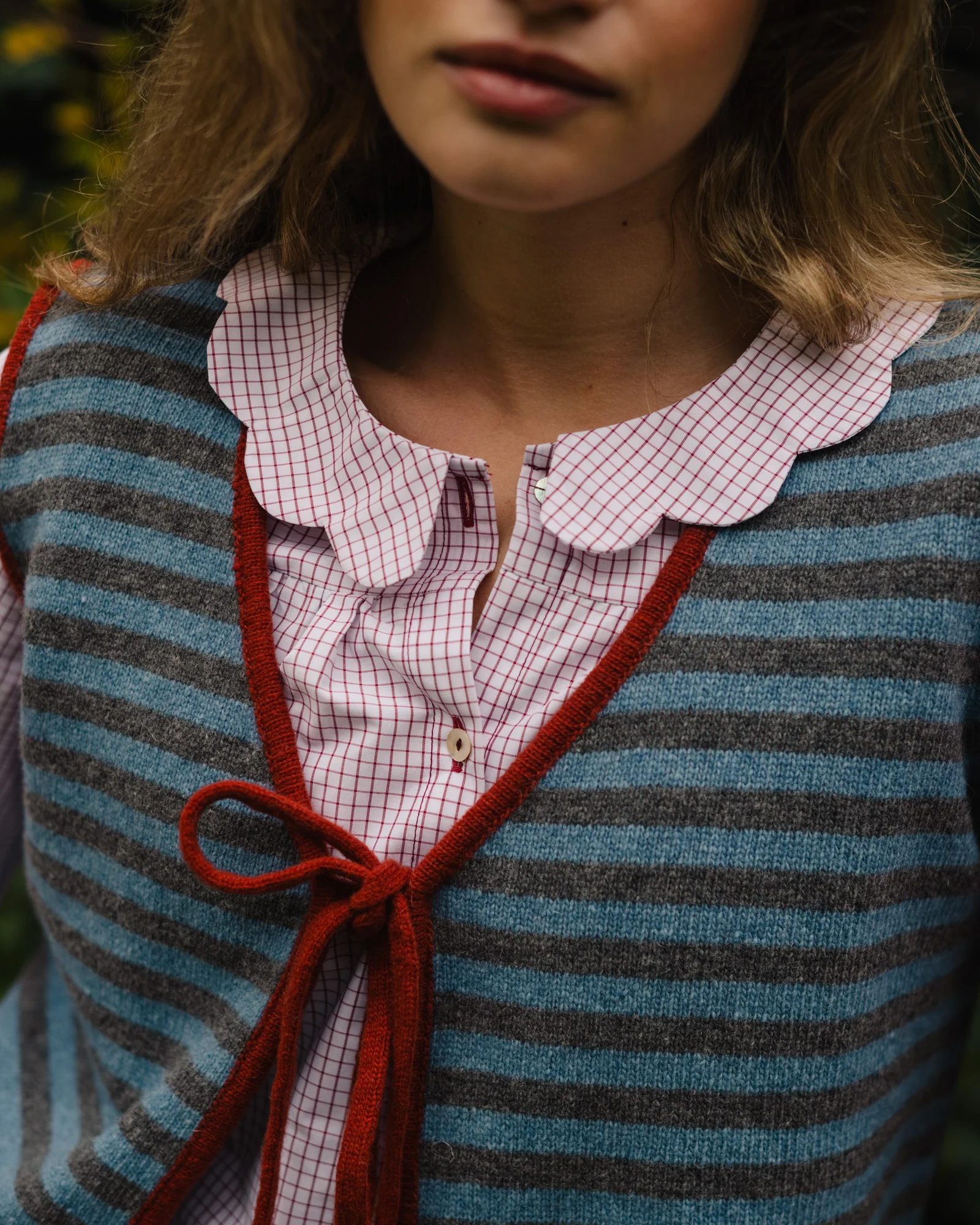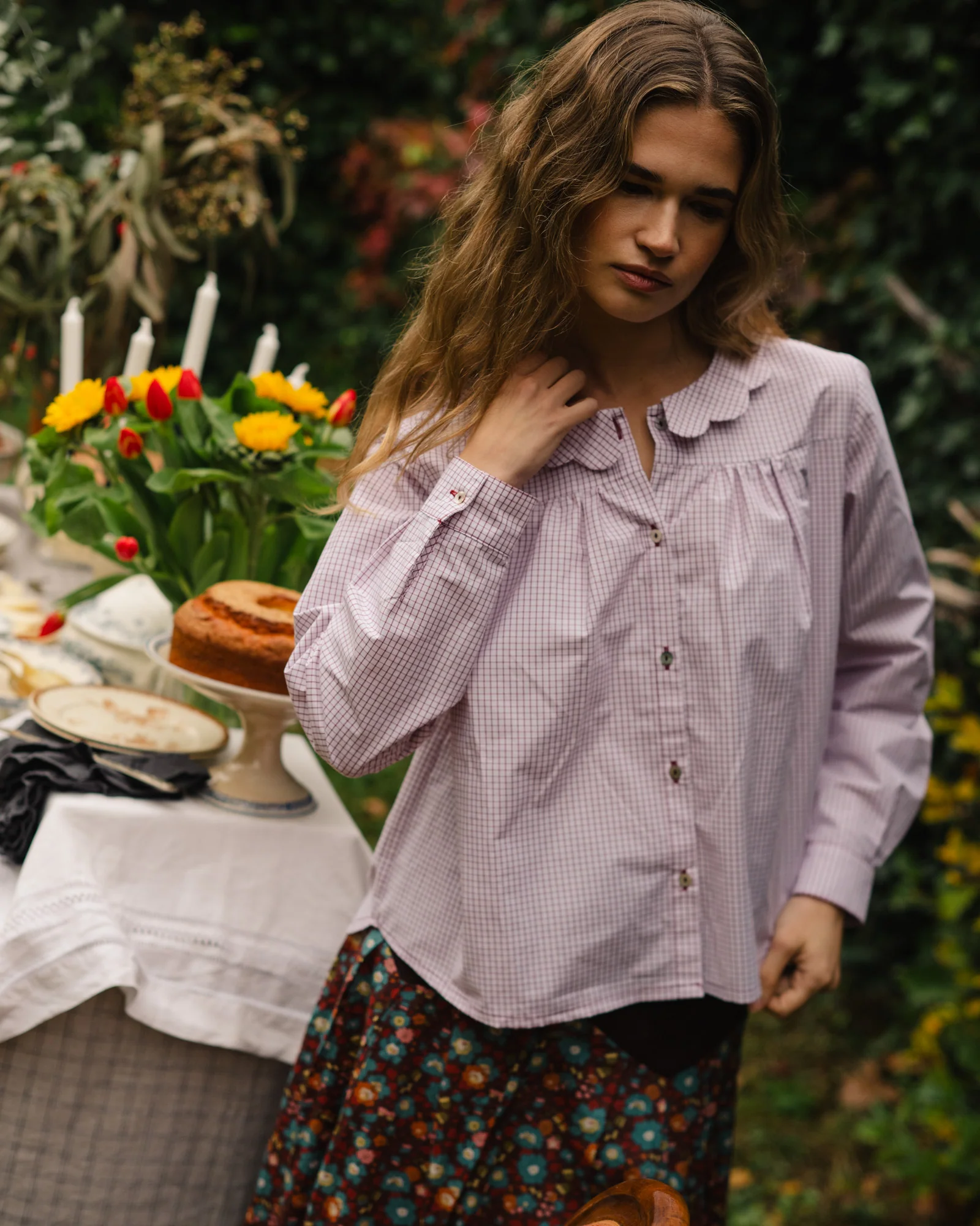 Blusita súper femenina con cuello de ondas en cuadro fino color burdeos.