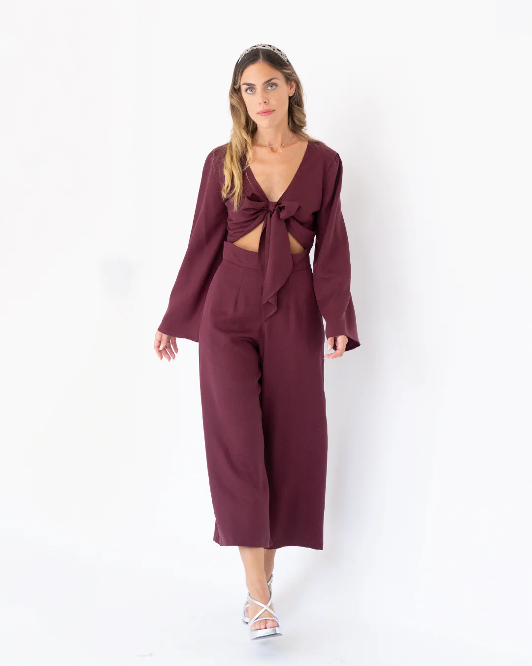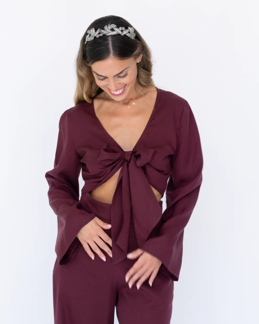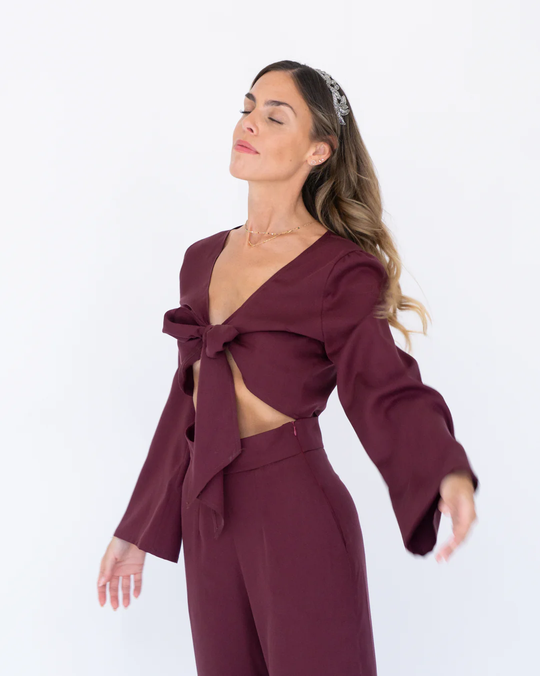 Blusa hasta la cintura con manga acampanada. Escote en V con dos lazadas para cerrar la blusa.