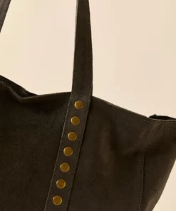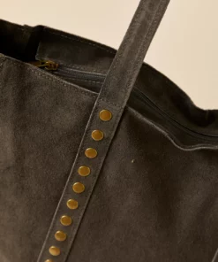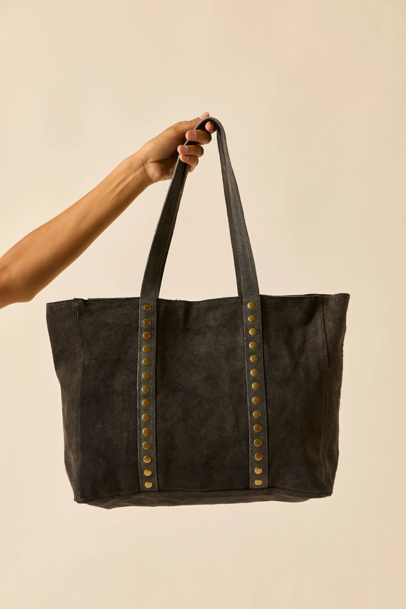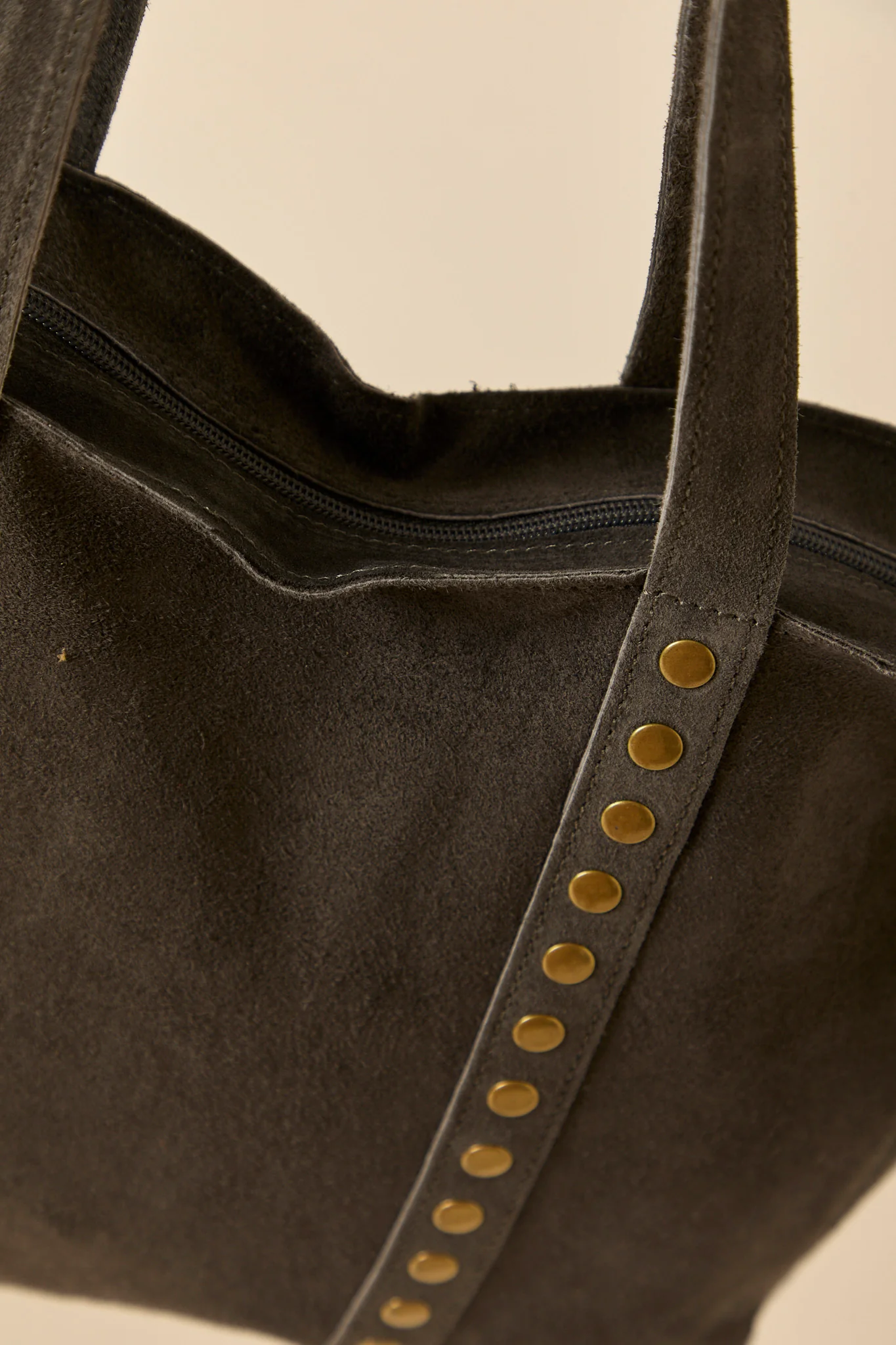Bolso de ante en color gris antracita con detalle de tachas metálicas y cierre de cremallera. Medidas: 48 cm de largo y 30cm de alto.