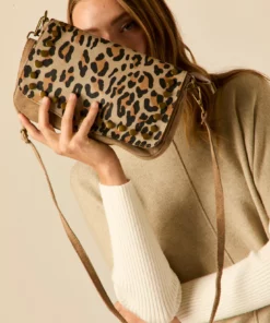 Bolso pequeño en color topo con estampado de animal print. Diseño estilo cartera, cremallera y forro interior.