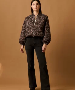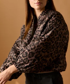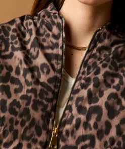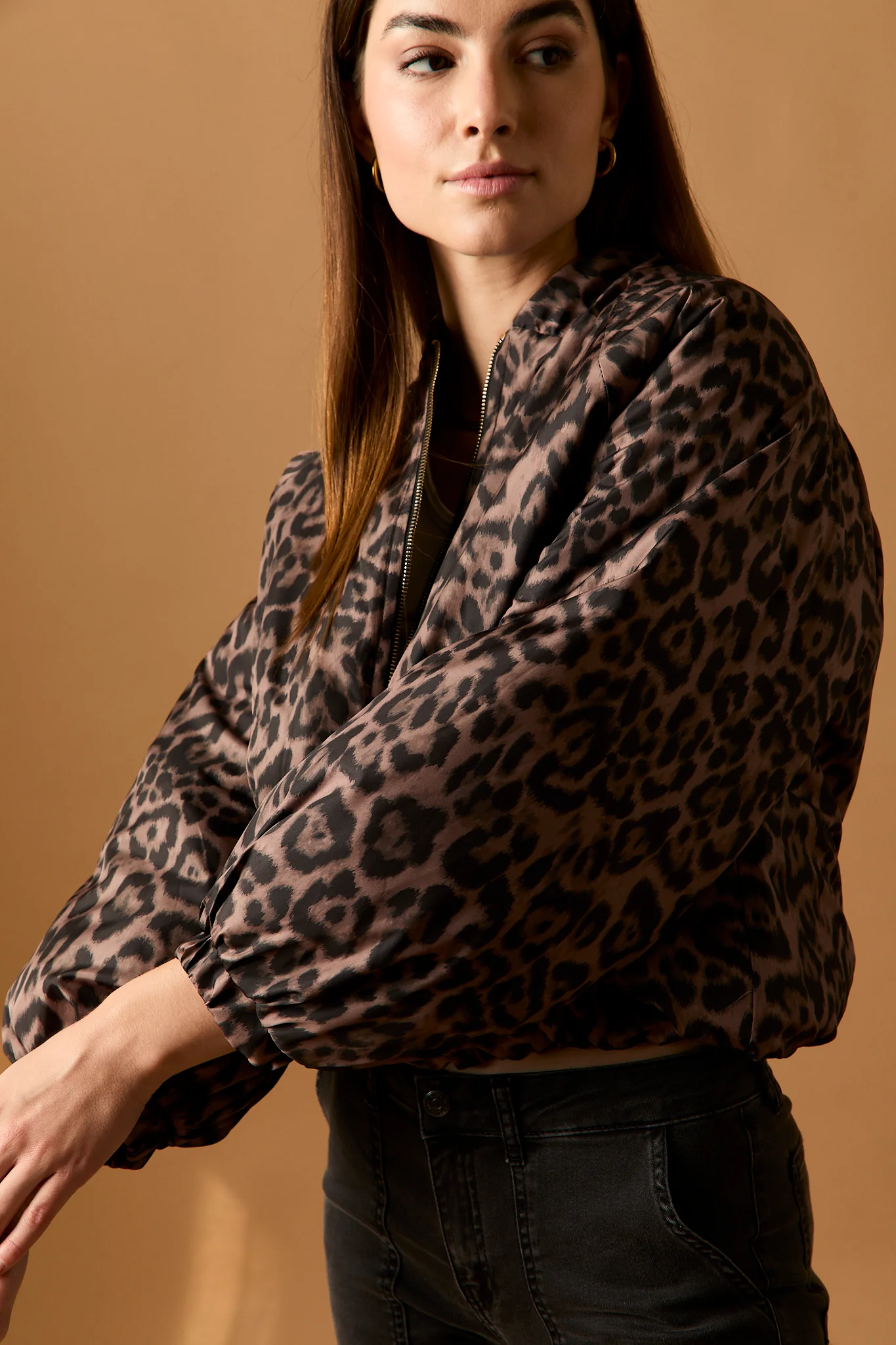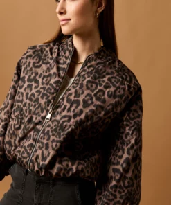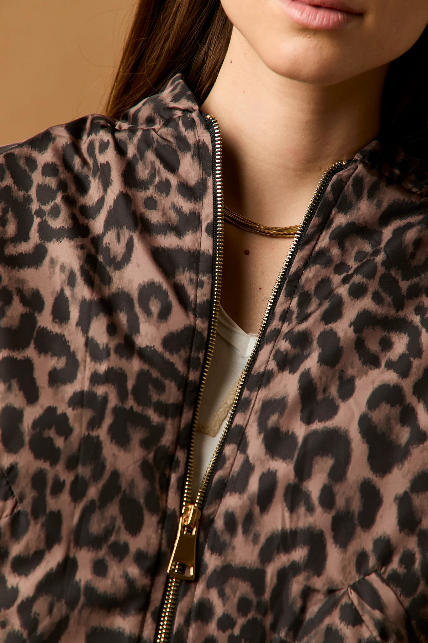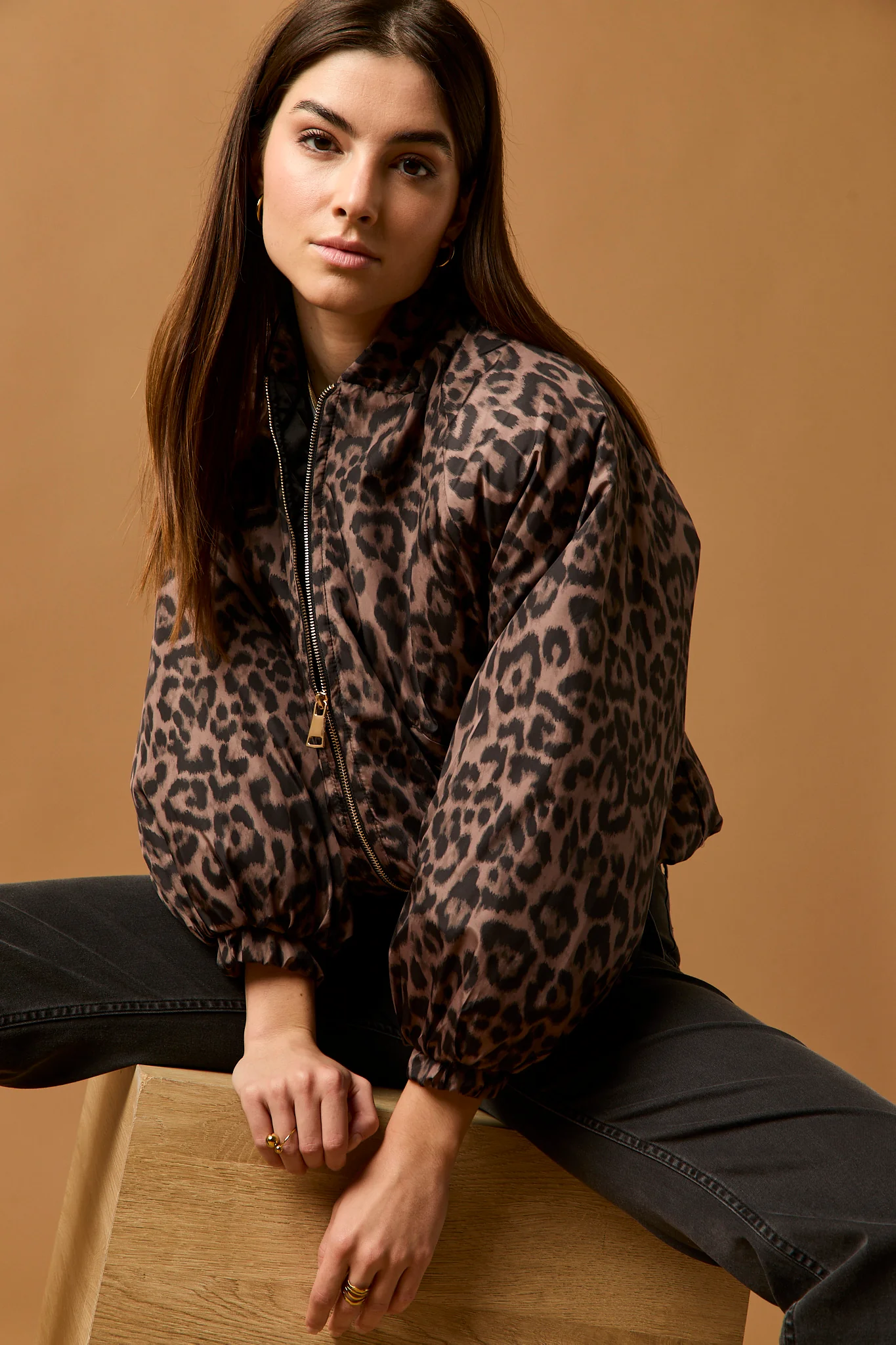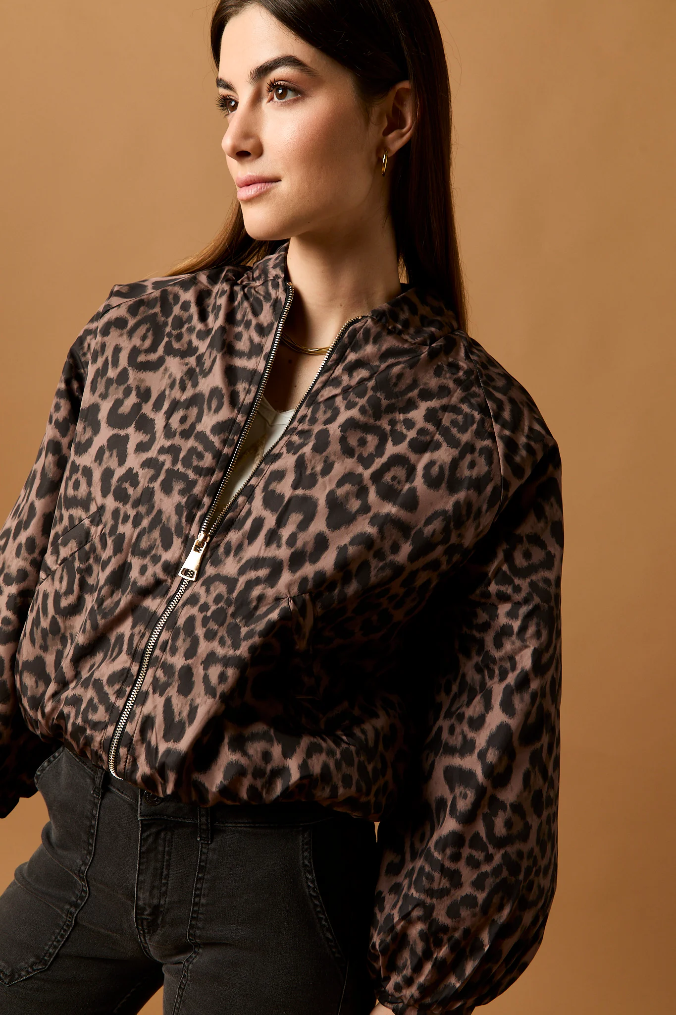 Bomber oversize animal print leopardo en color marrón. Cuello caja, mangas larga abullonada y cierre frontal de cremallera metálica.