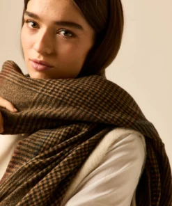 Bufanda jacquard de cuadros estilo manta en tonos marrones con acabados en flecos en ambos extremos.