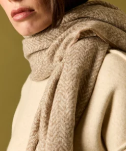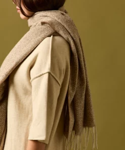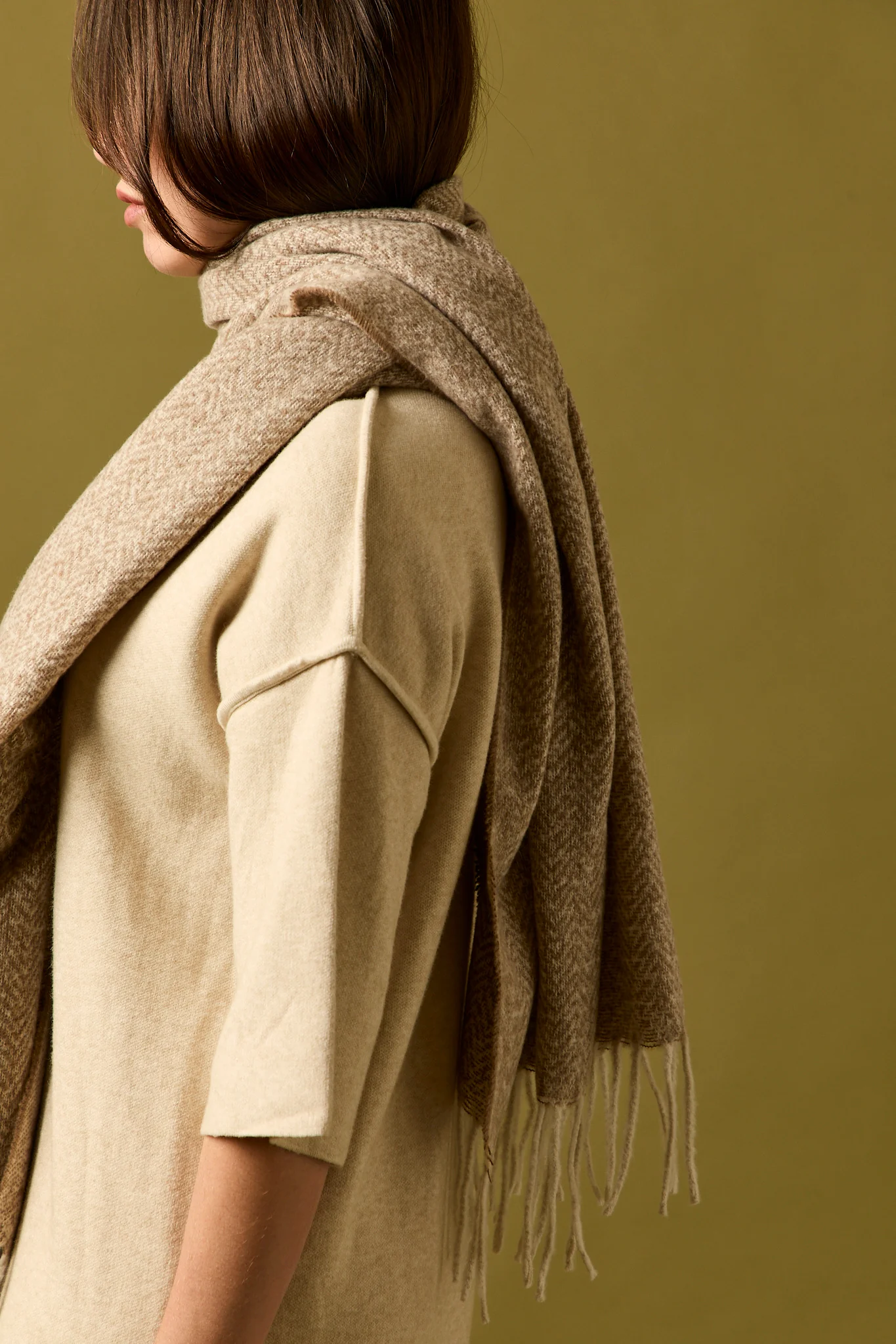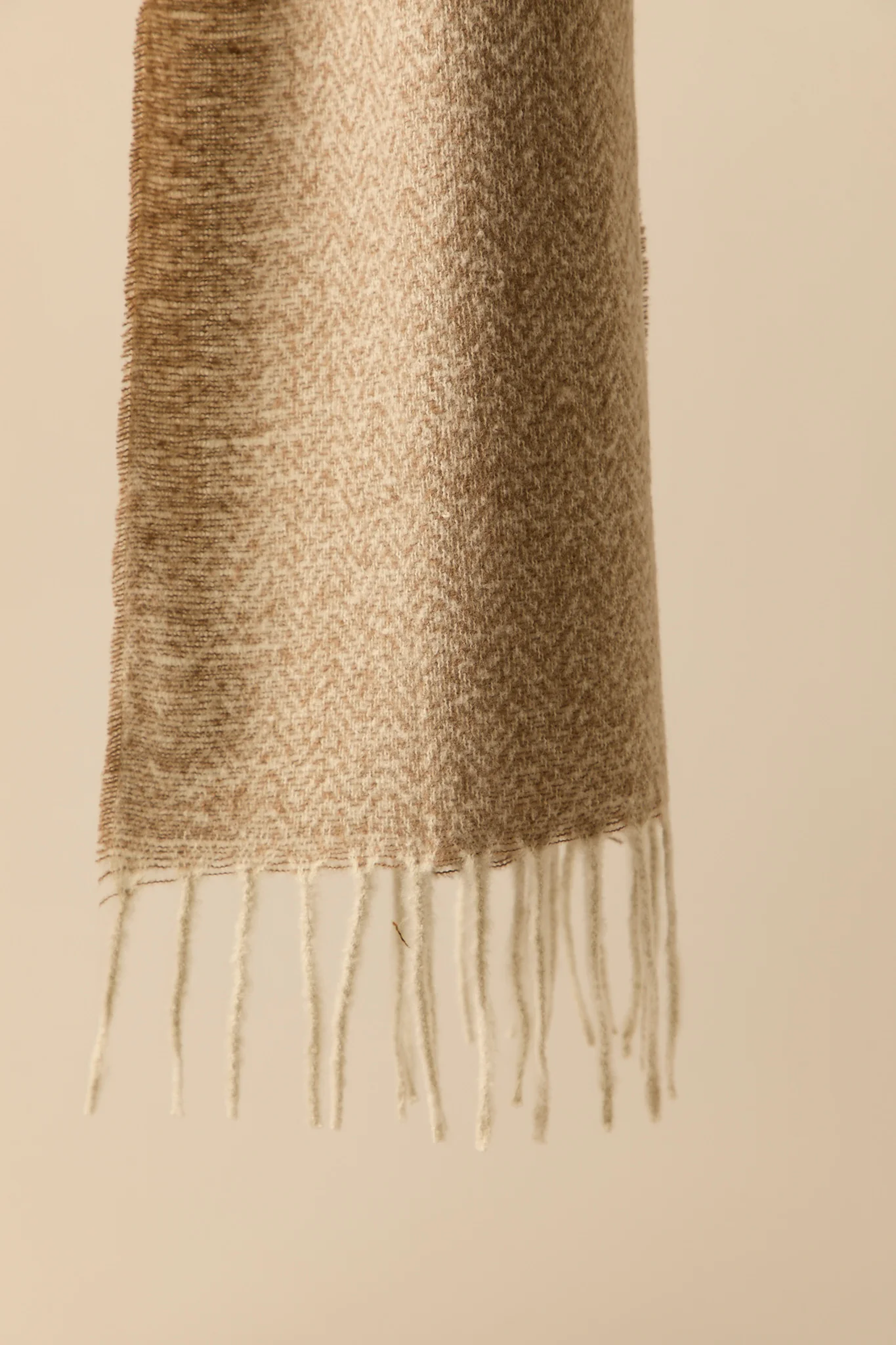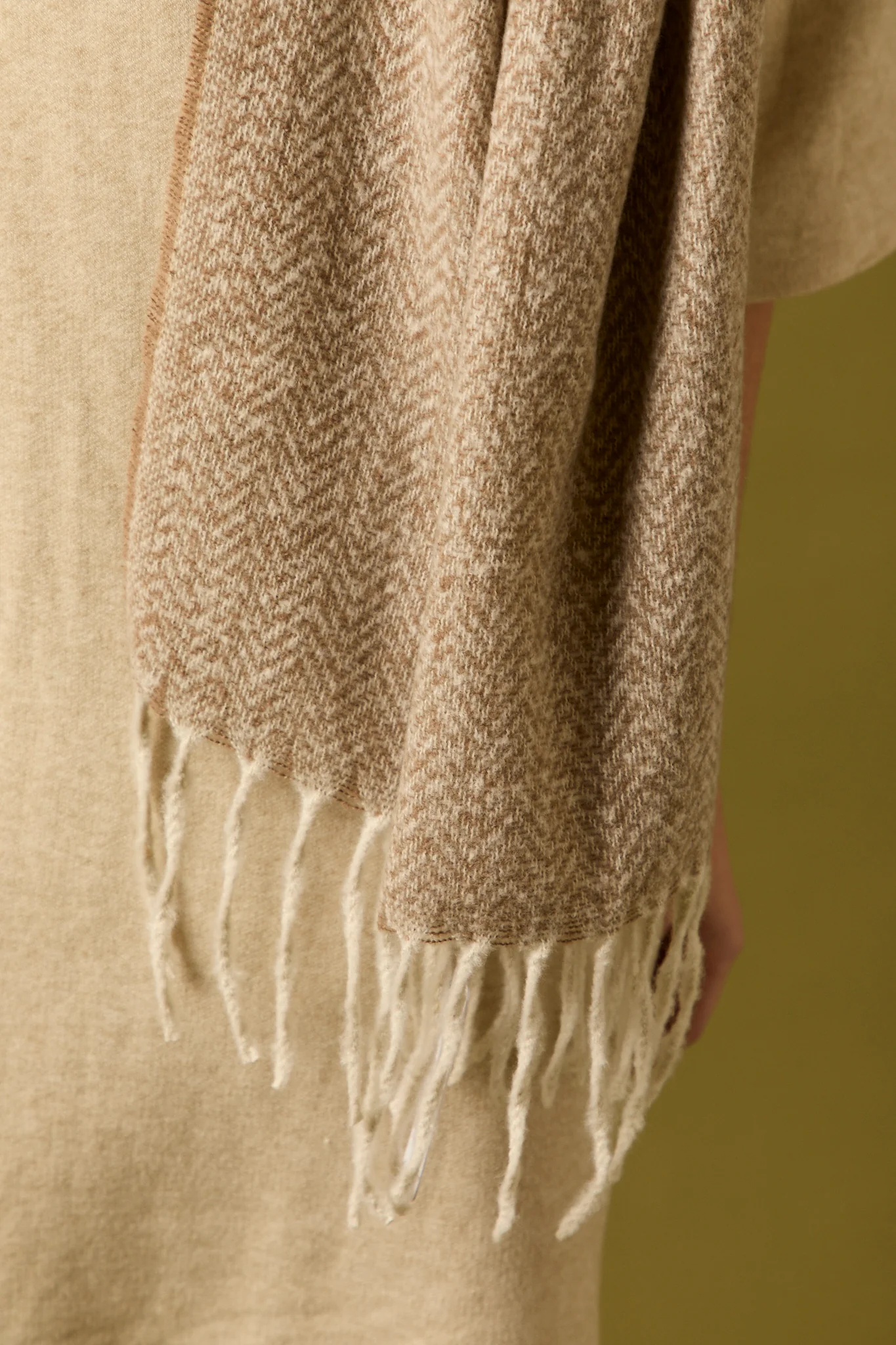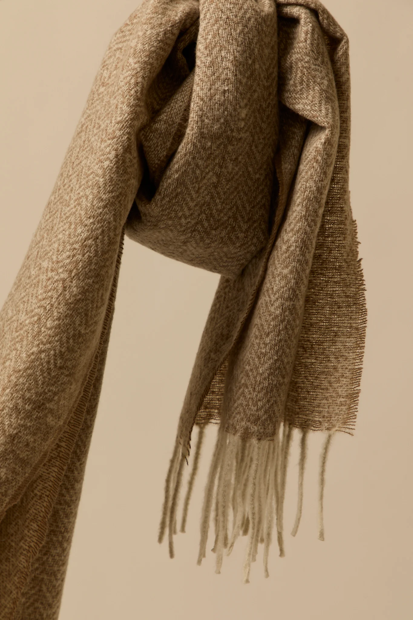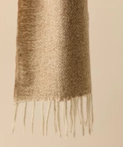 Bufanda de estampado de espiga en color mostaza. Diseño amplio, detalle de flecos en los extremos y tacto suave.