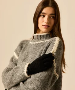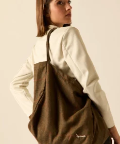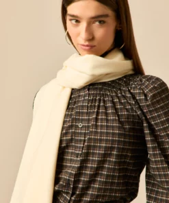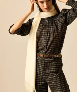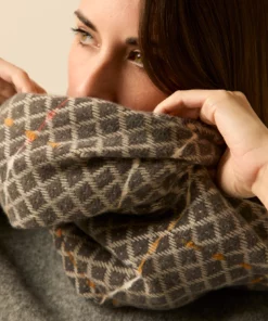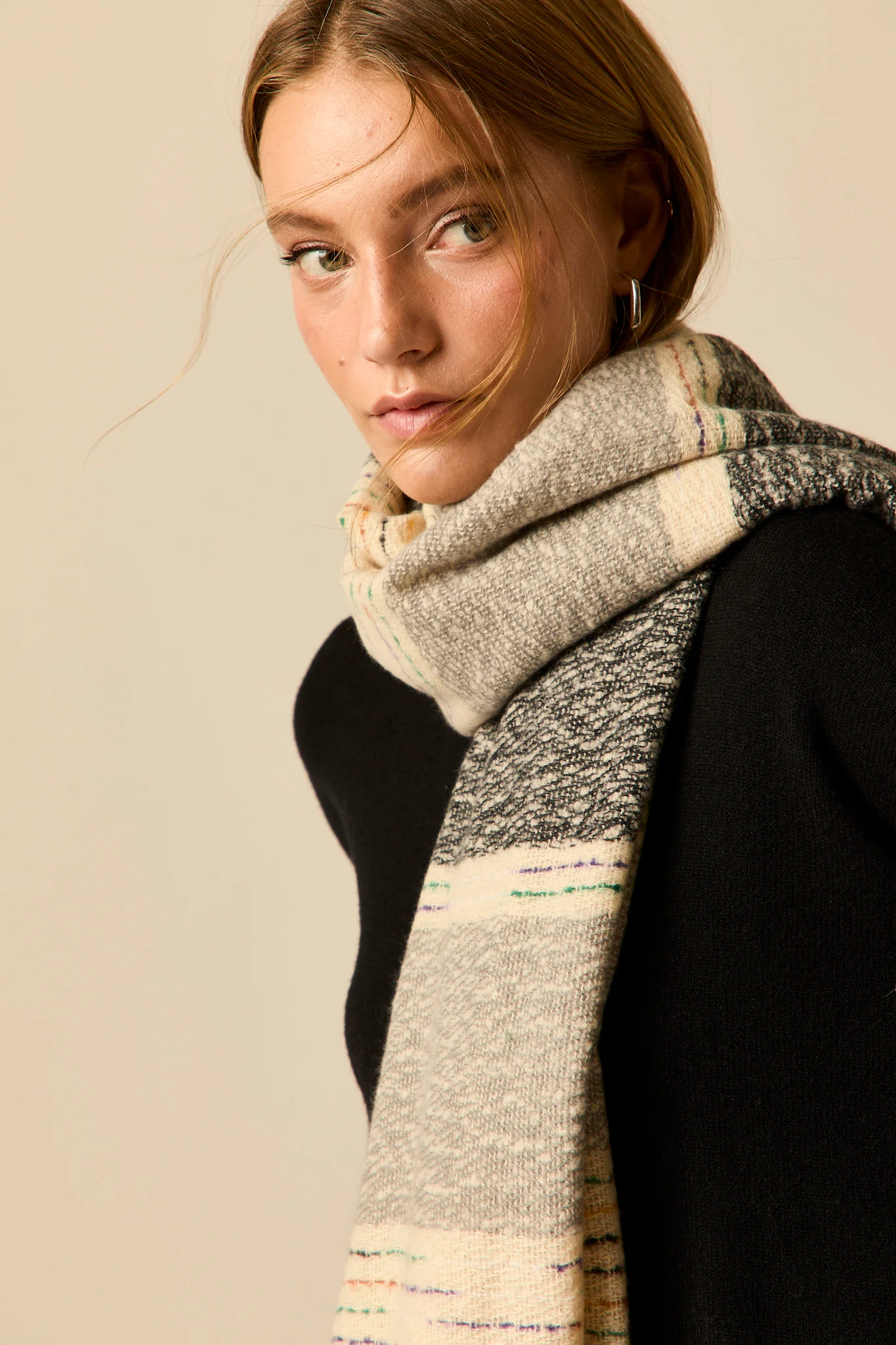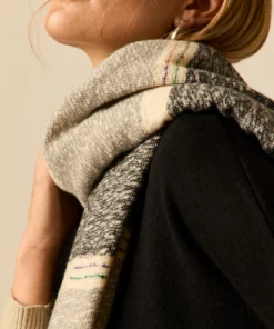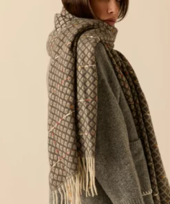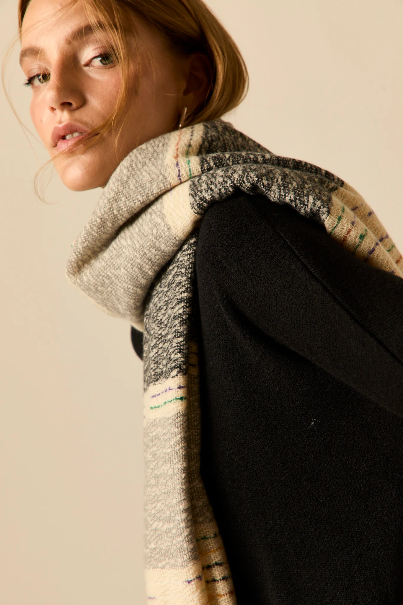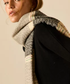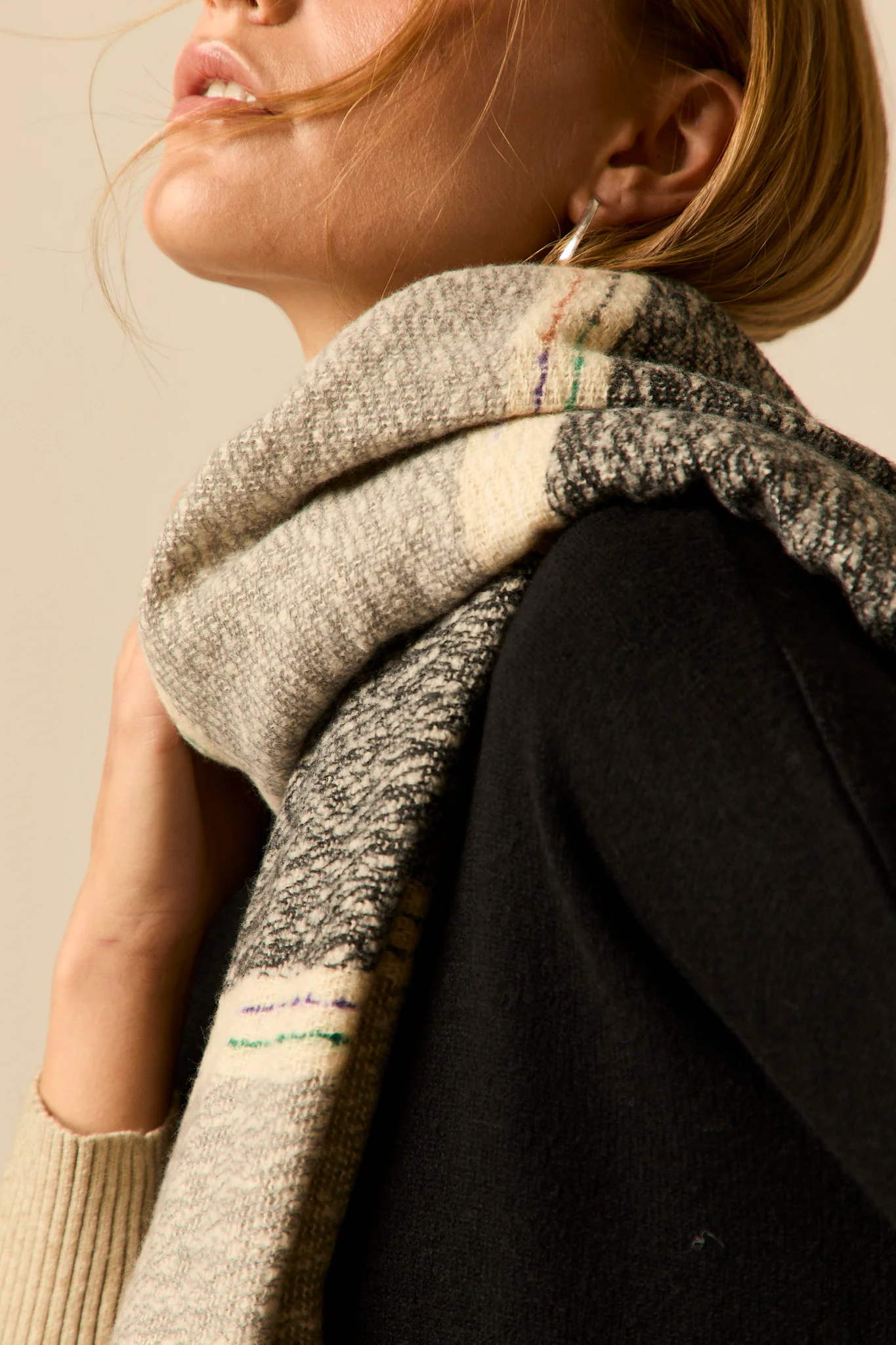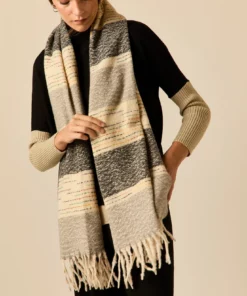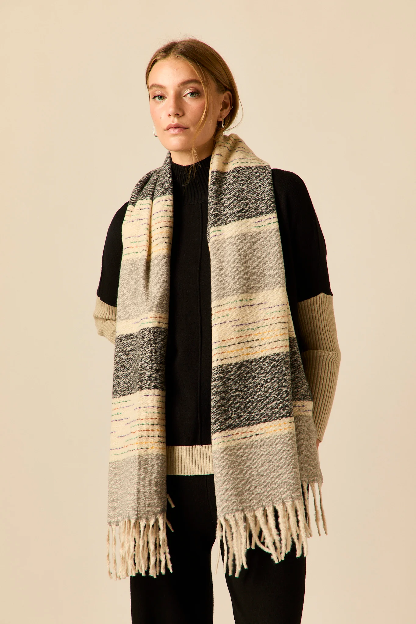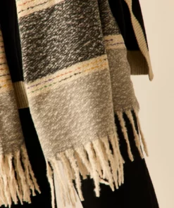 Bufanda estilo manta multicolor en tonos gris y beige con acabado en flecos.