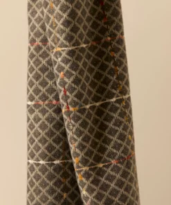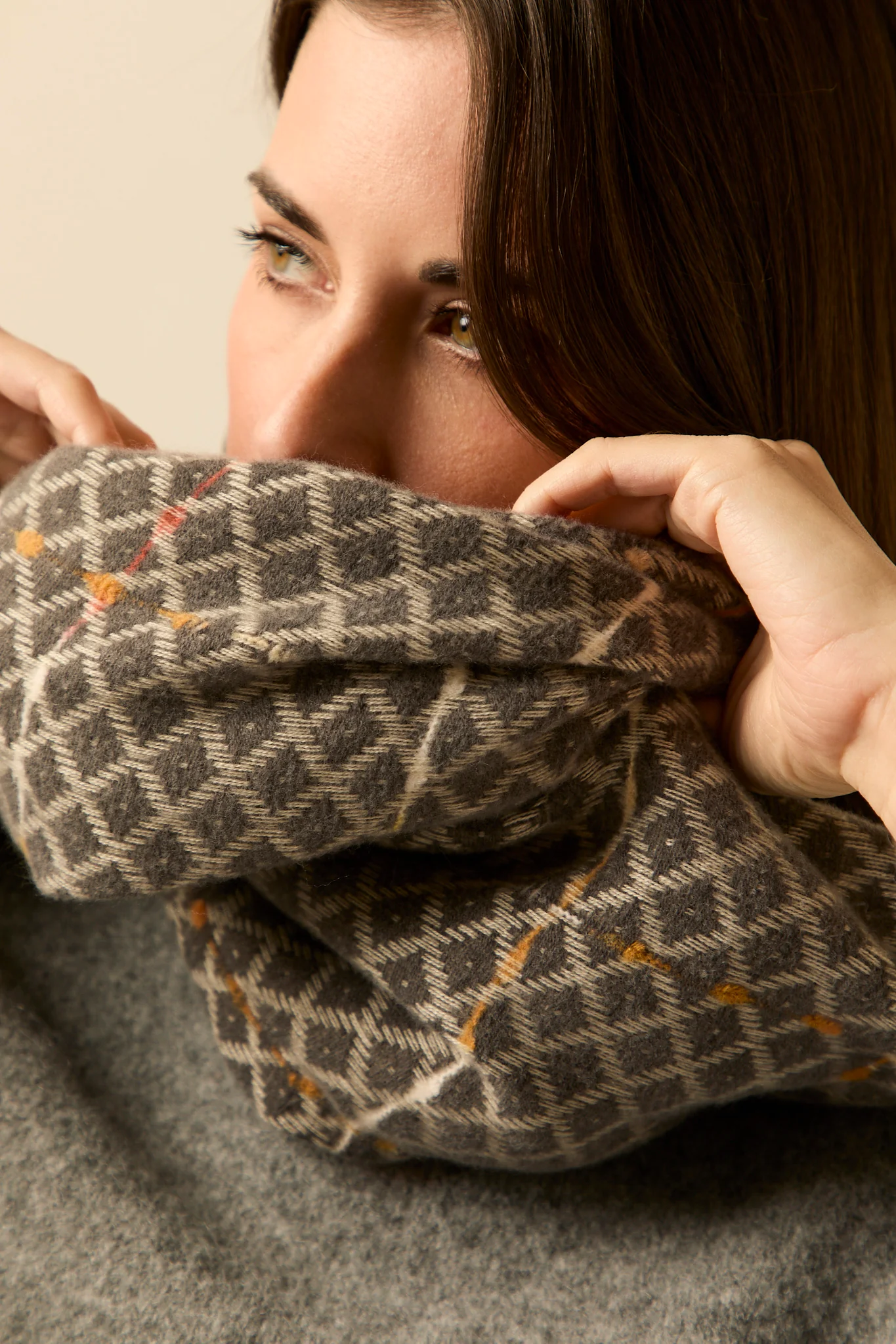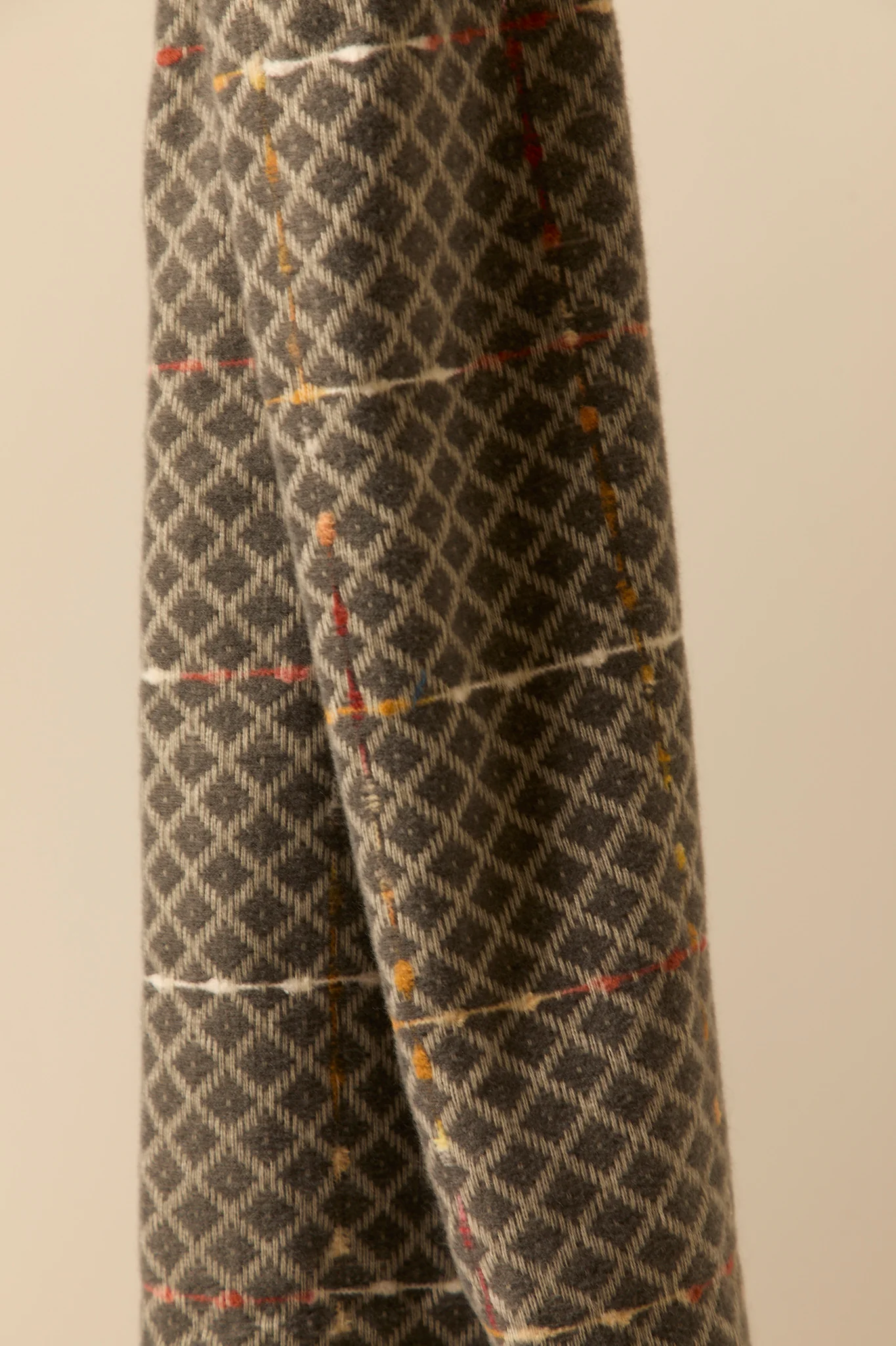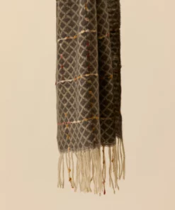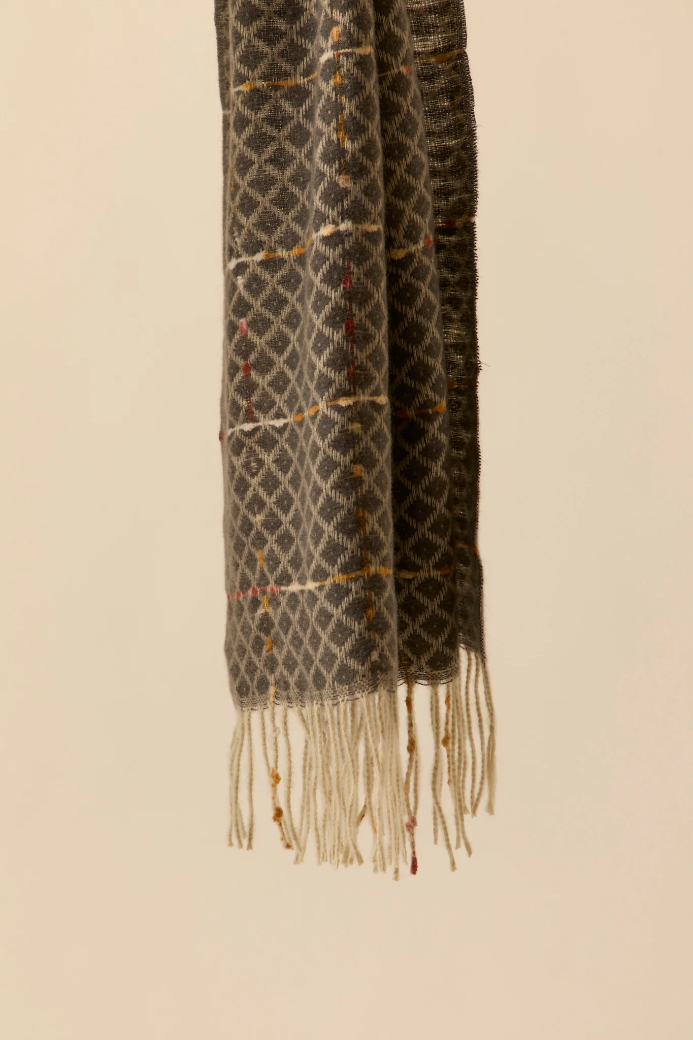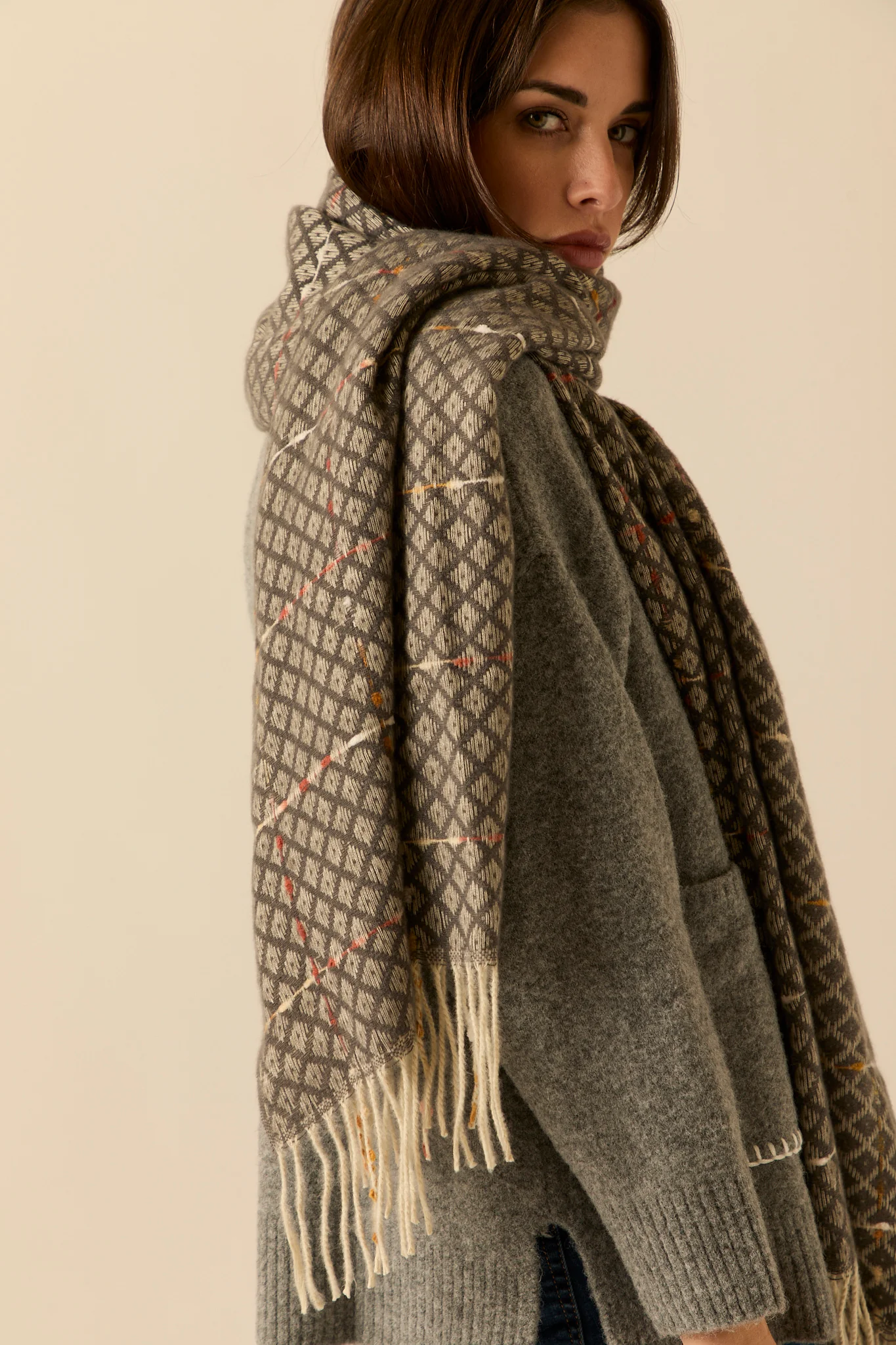 Bufanda de estampado de rombos en tonos gris, blanco y mostaza. Diseño amplio, detalle de flecos en los extremos y tacto suave.