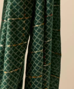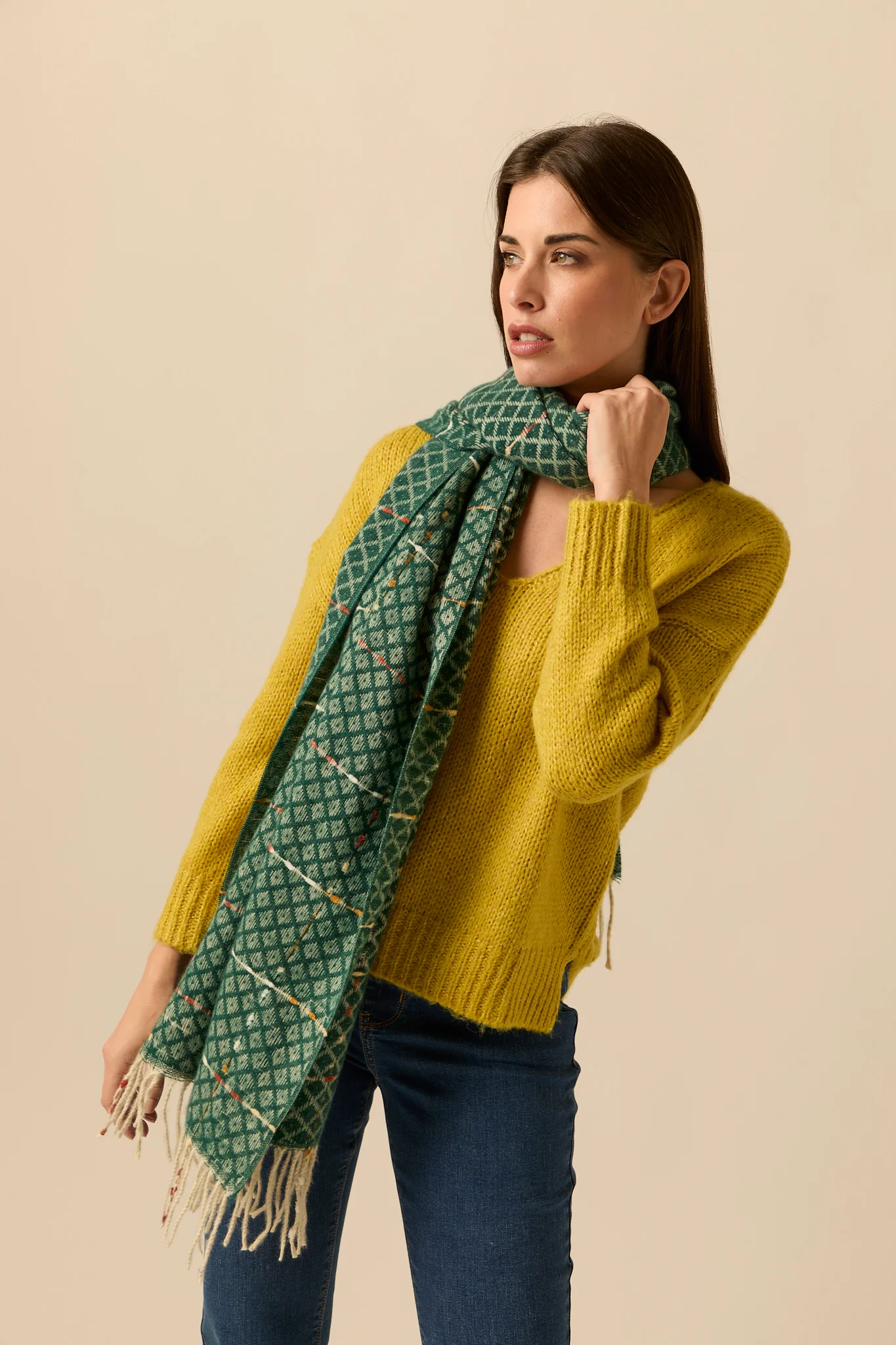 Bufanda de estampado de rombos en tonos verde, blanco y mostaza. Diseño amplio, detalle de flecos en los extremos y tacto suave.