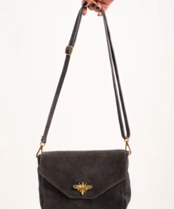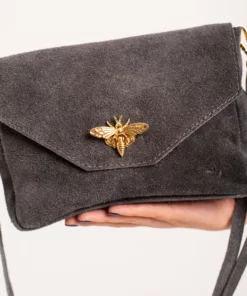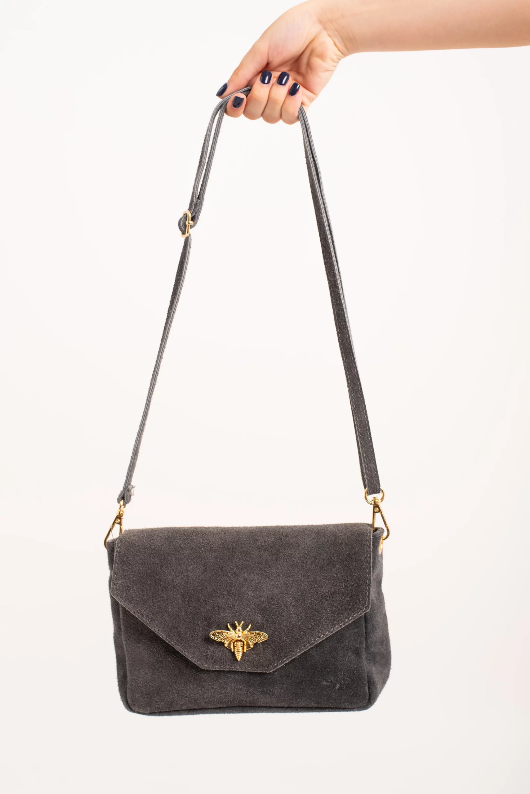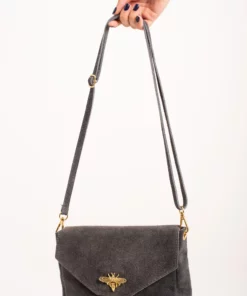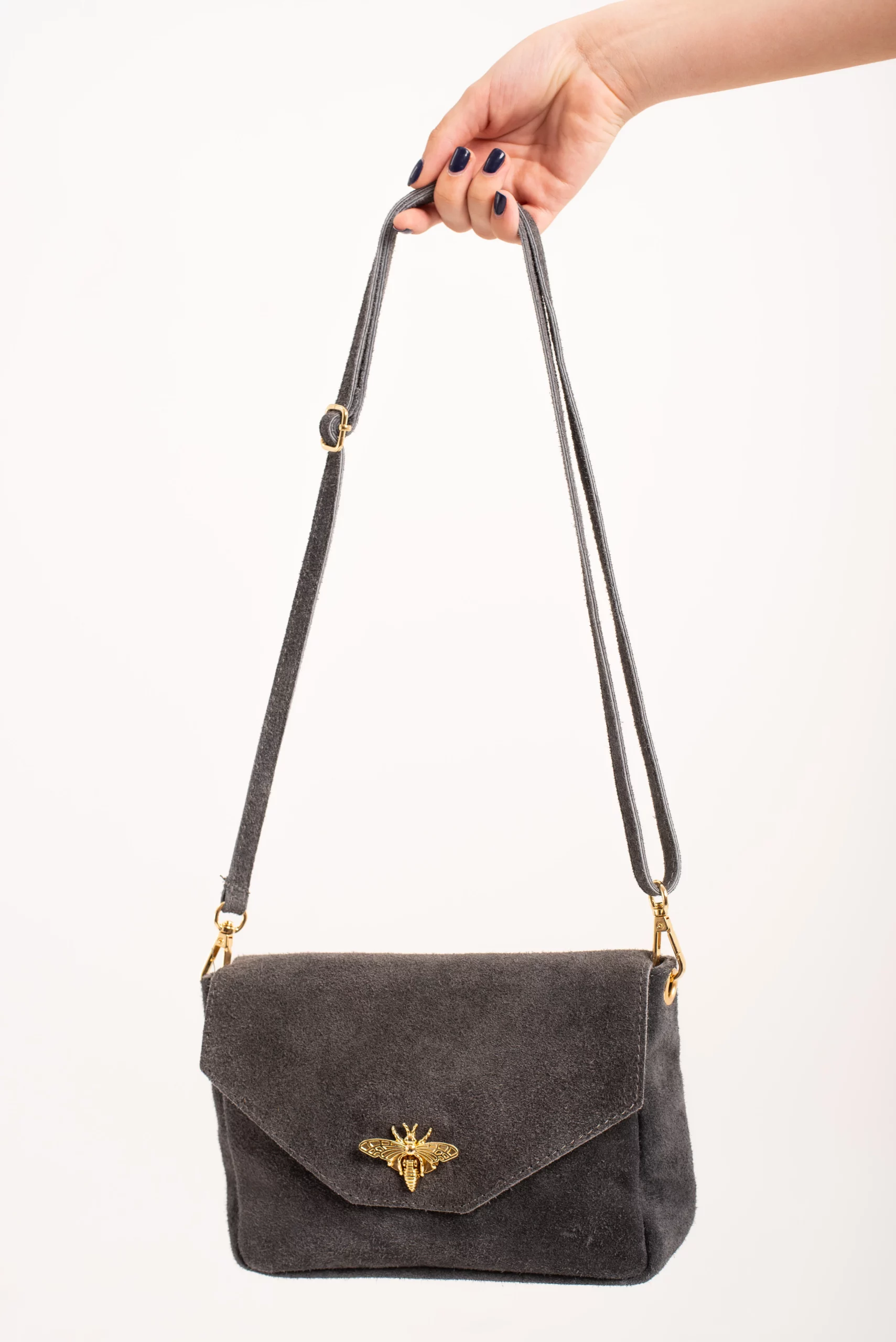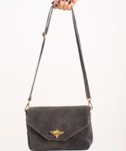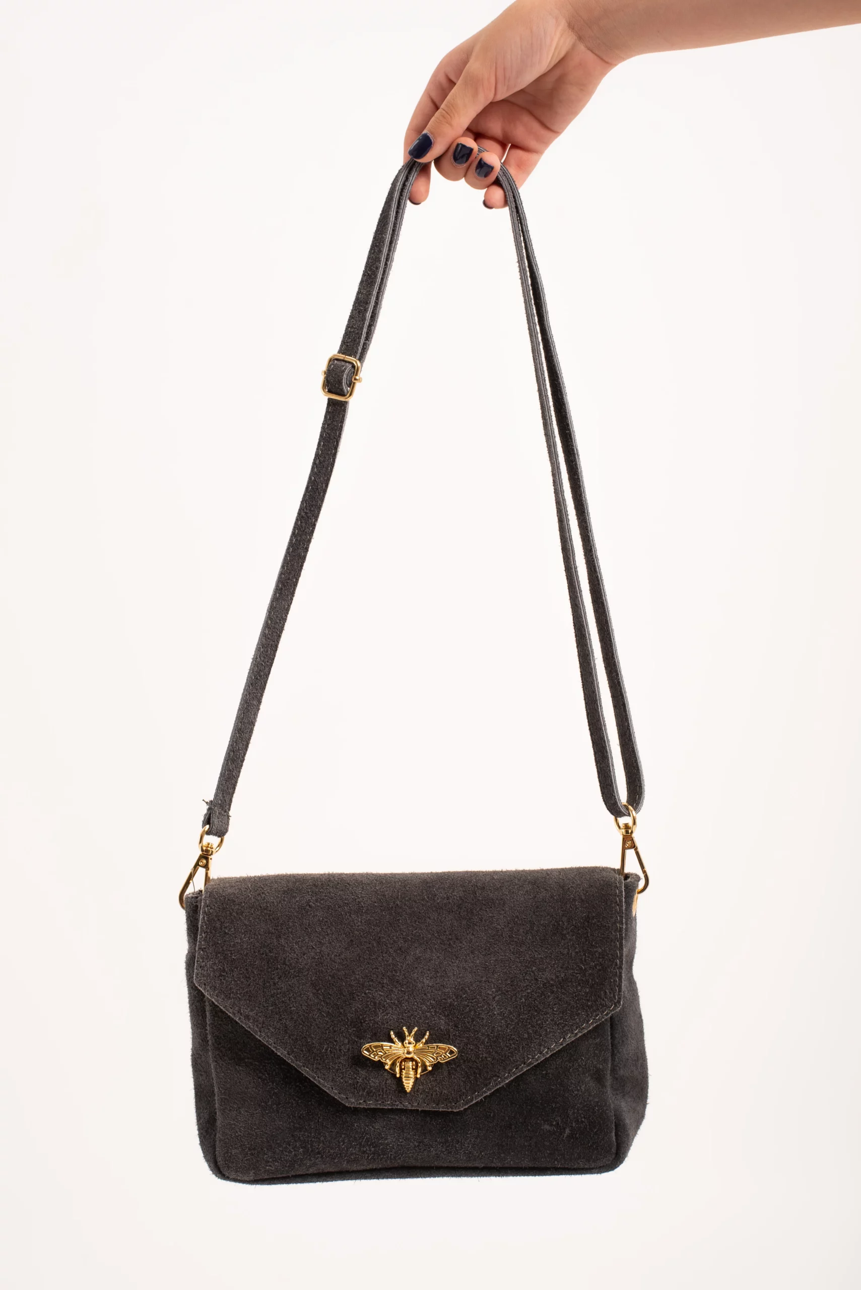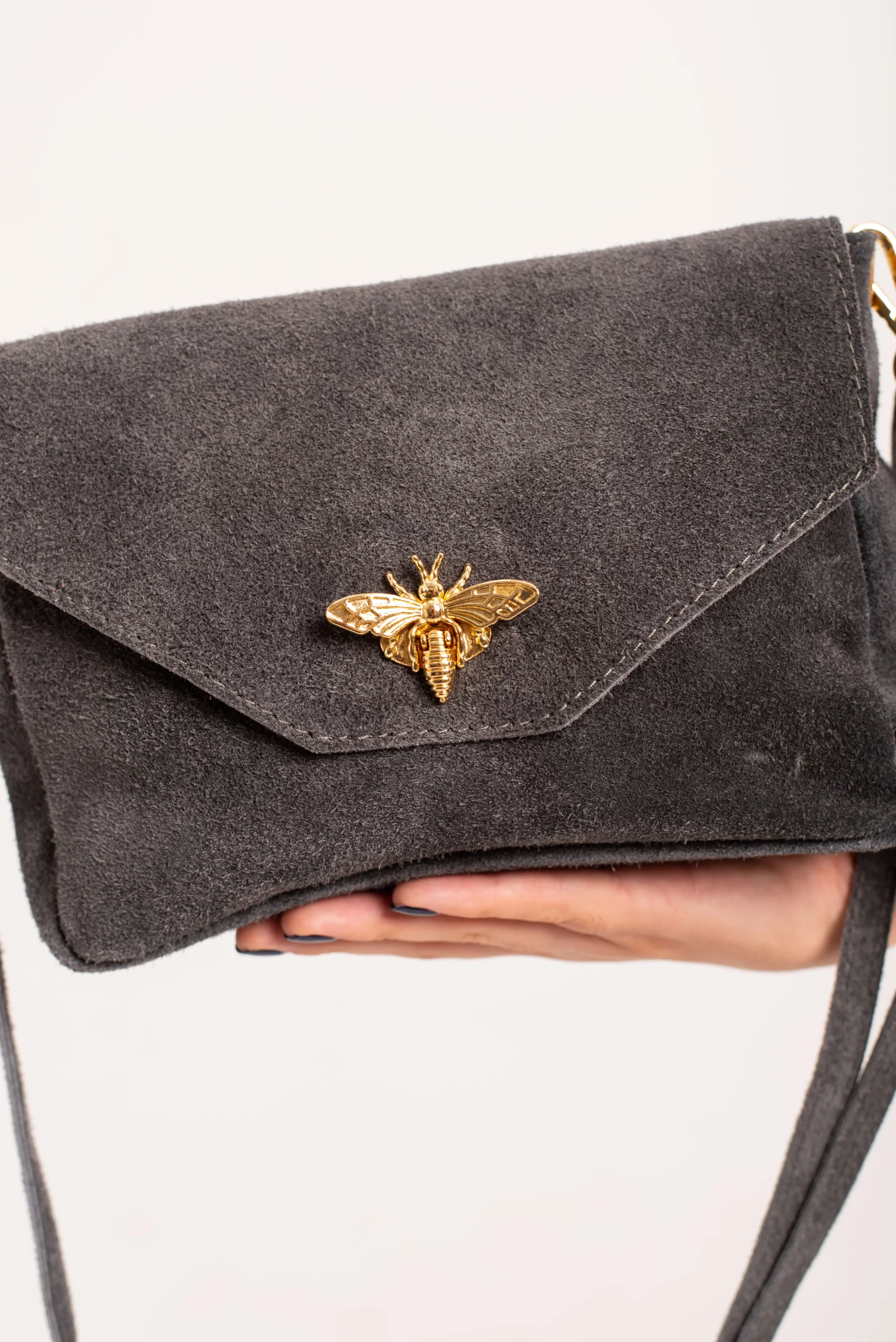 Bolso bandolera de serraje. Cierre con cremallera y solapa. Cierre metalico con forma de abejorro dorado. Ideal en todos los colores.