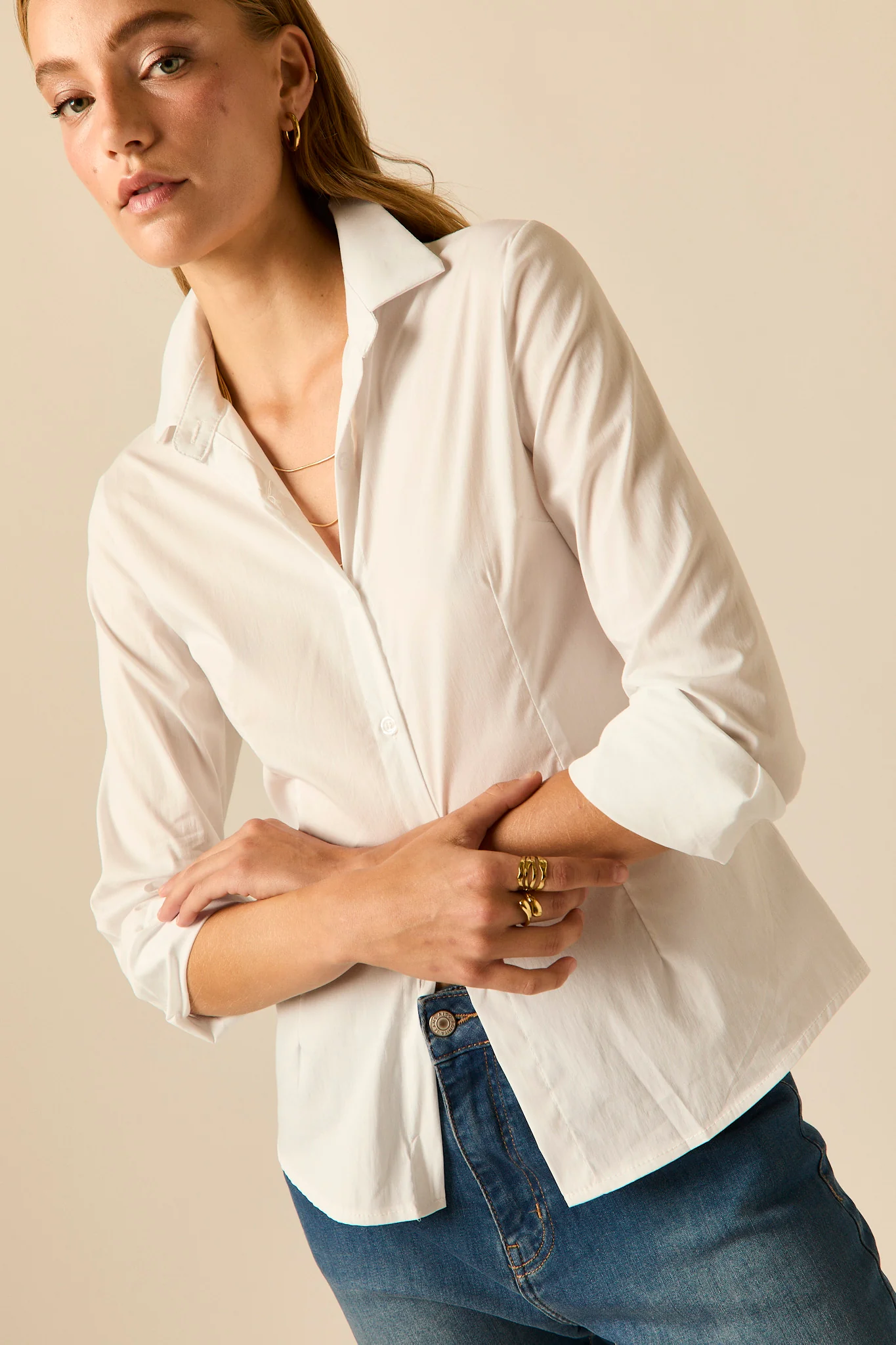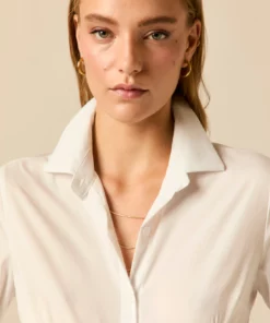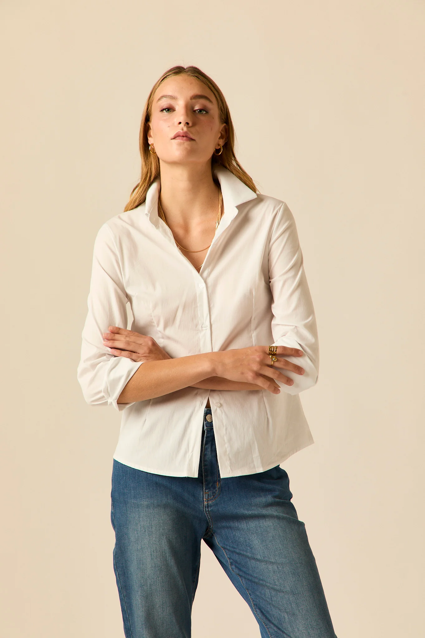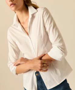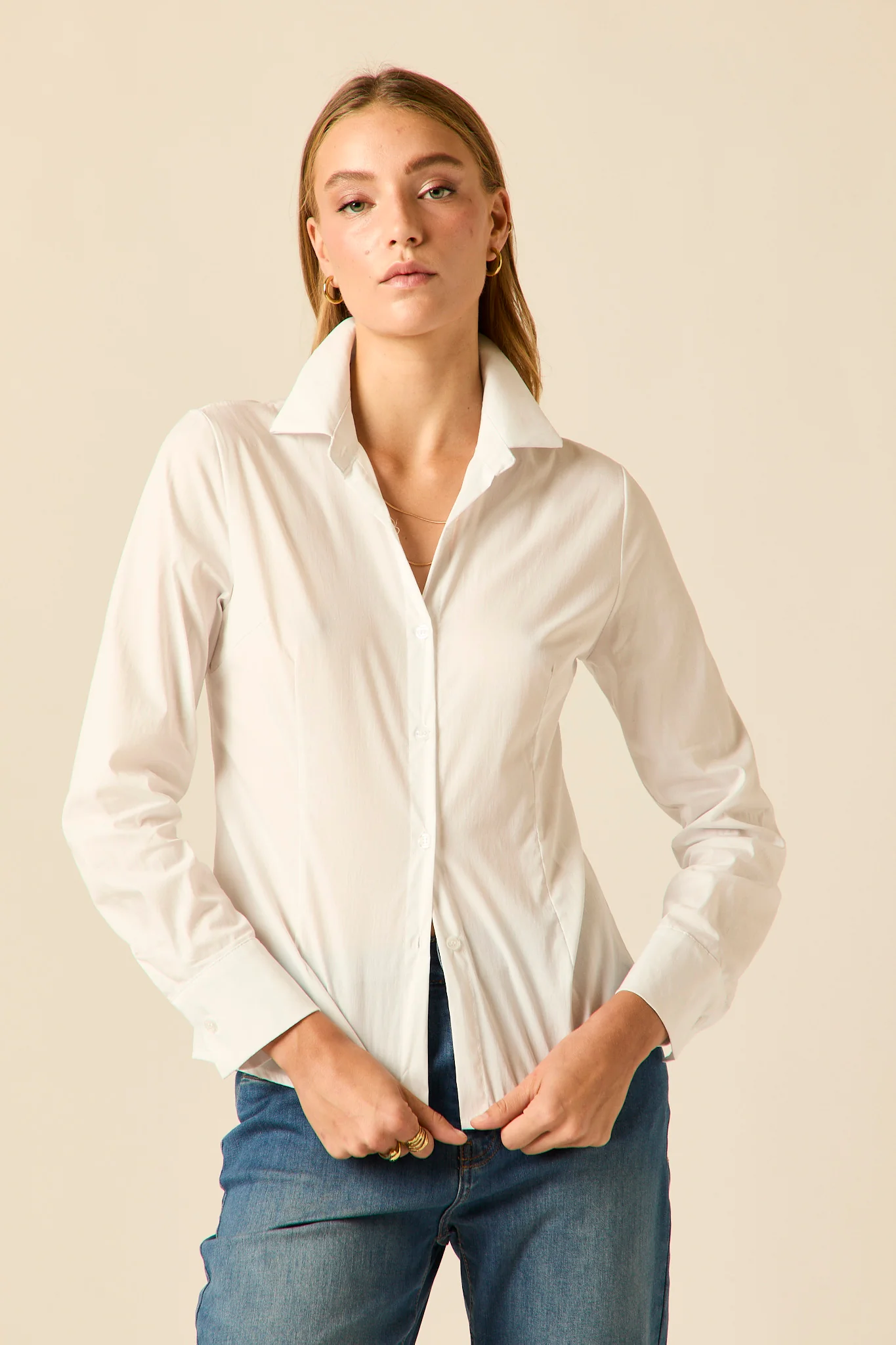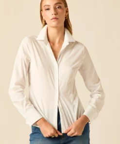 Camisa básica de diseño entallado en color blanco. Cuello de solapa, manga larga ajustable con botón y cierre frontal de botones.