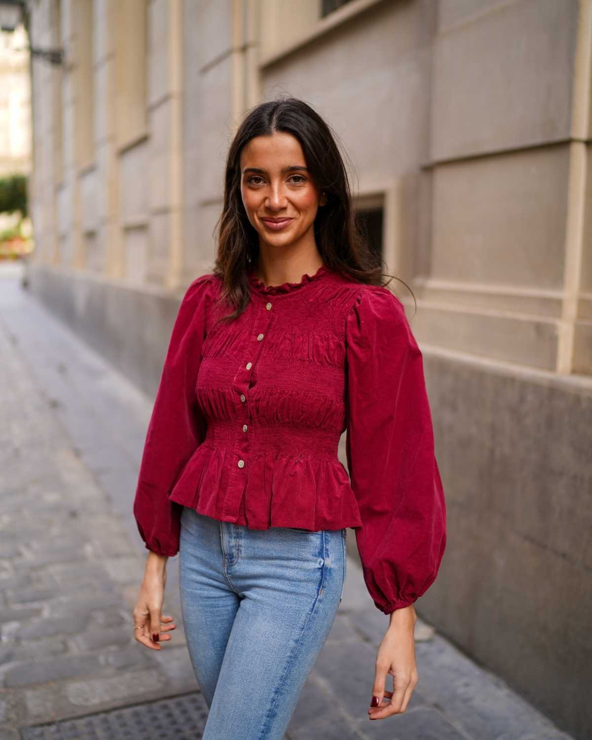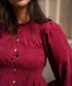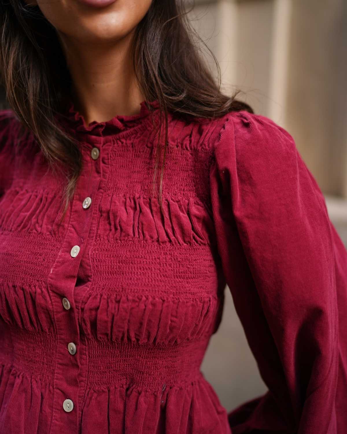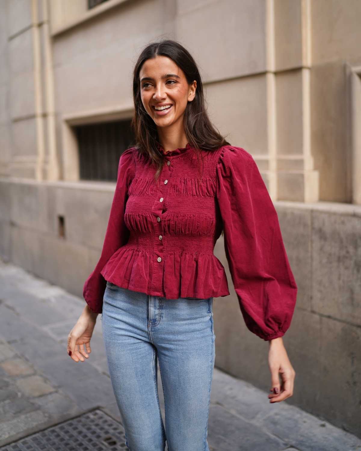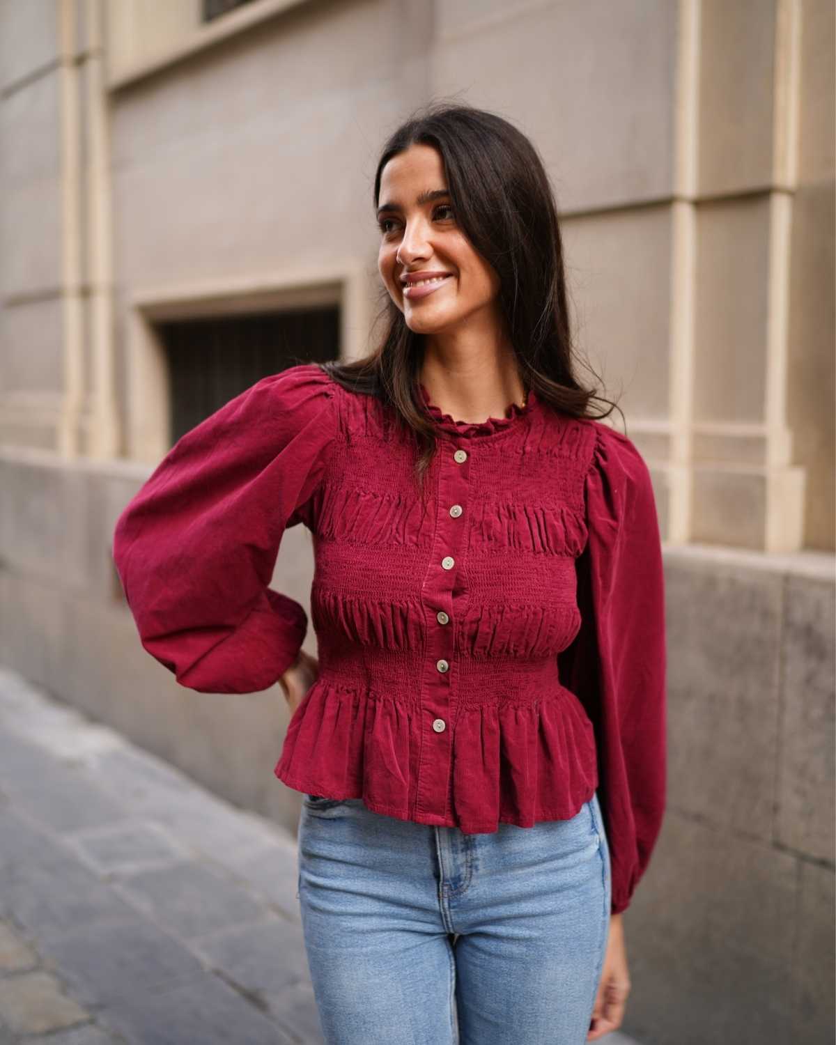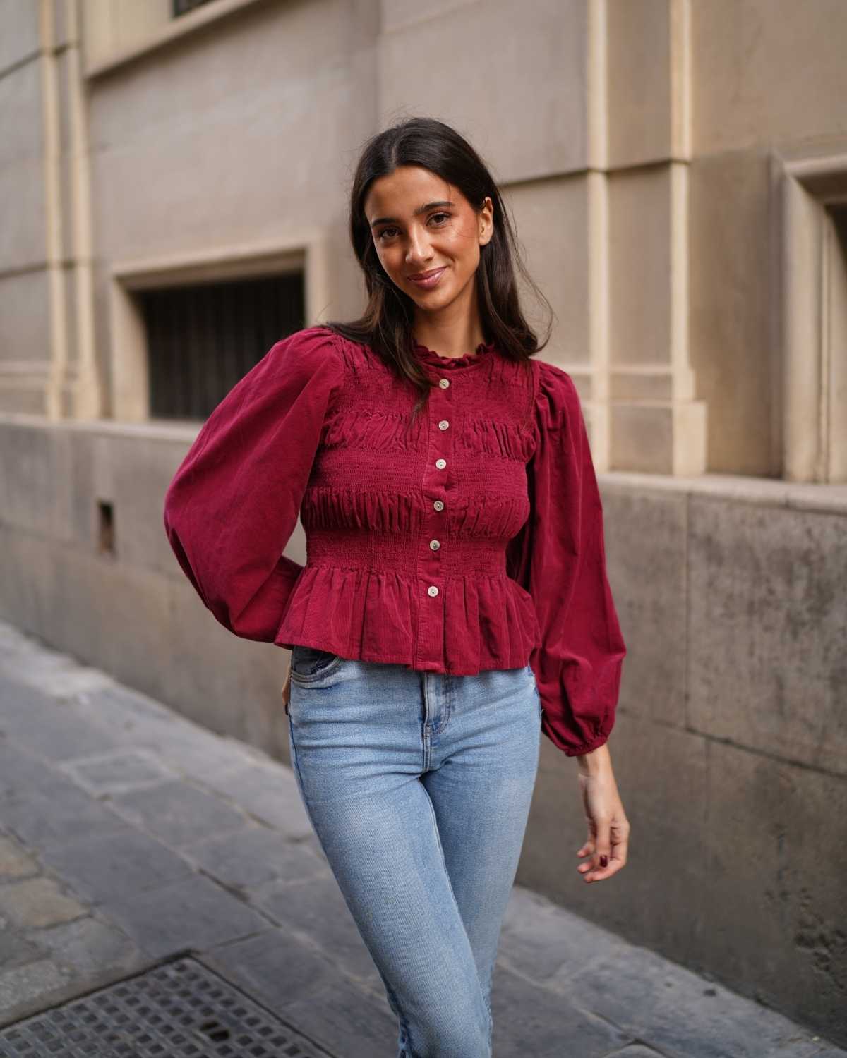- Camisa de manga larga en tejido de pana y cierre botonadura frontal.