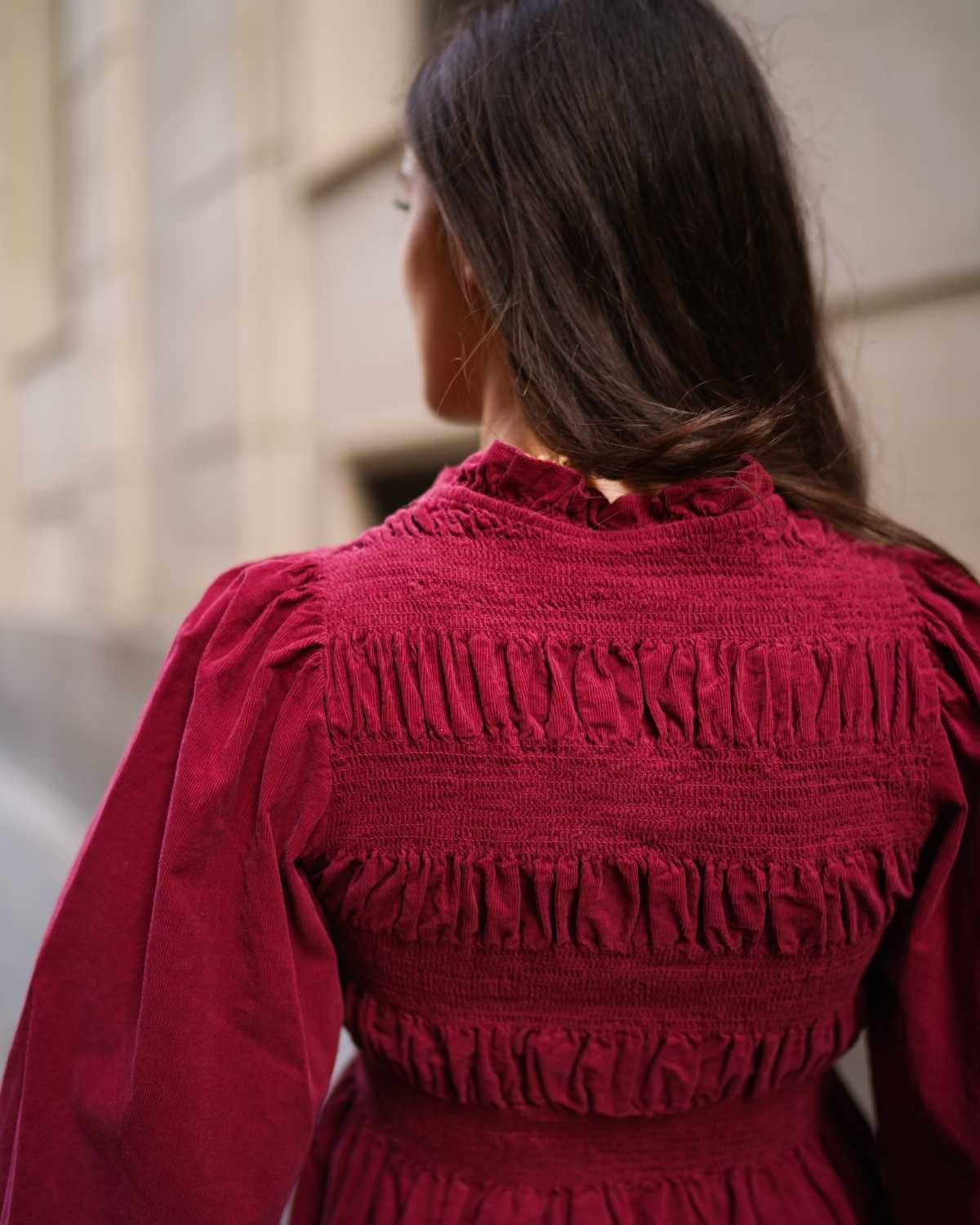 - Detalle de volante en cuello y mangas globo.