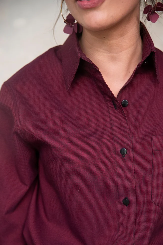 Camisa en color burdeos, con un pequeño dibujo pata de gallo muy discreto pero que da a la prenda un toque de originalidad, realizado en un tejido de mezcla consiguiendo que se adapte perfectamente al cuerpo.