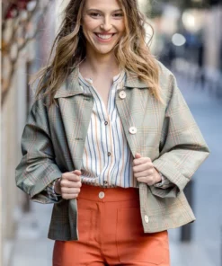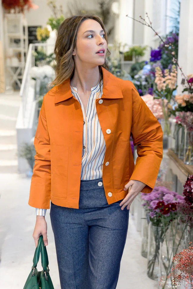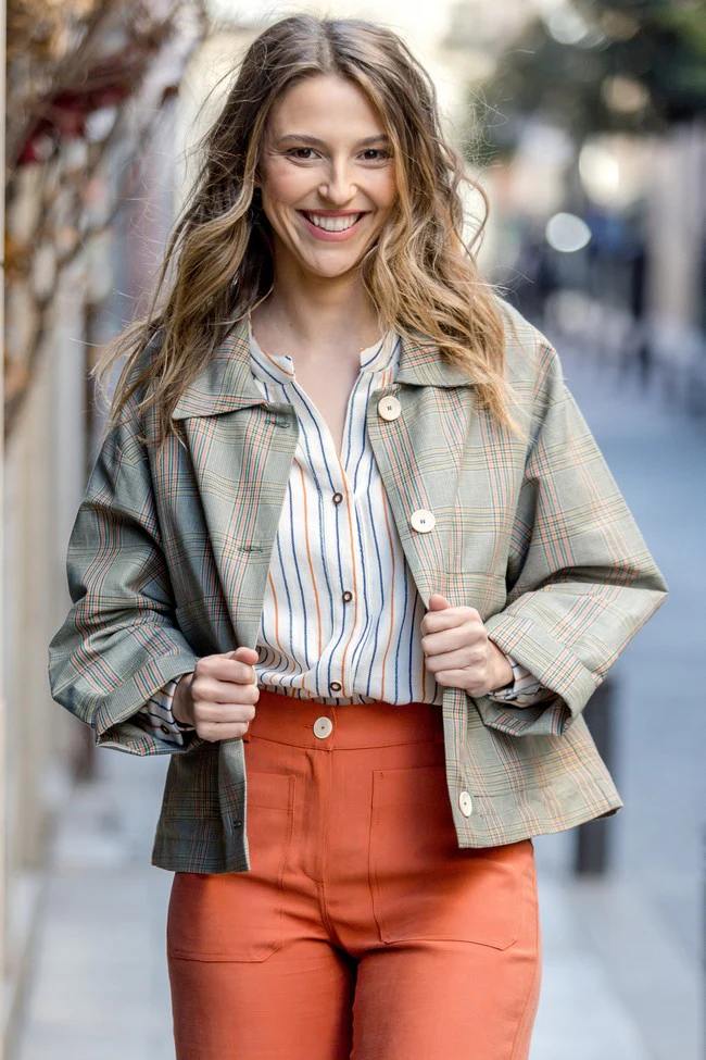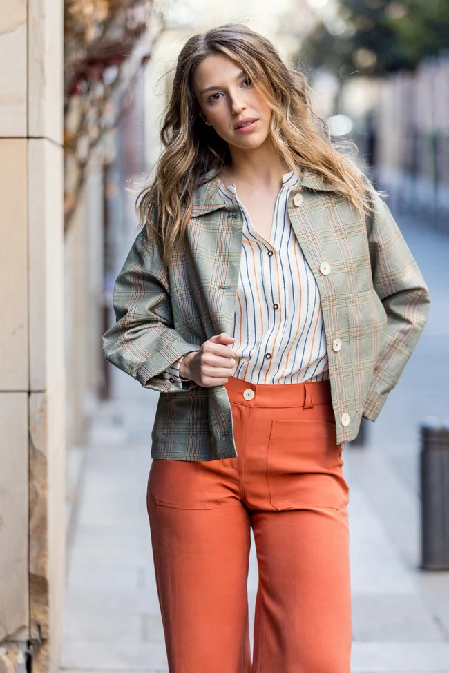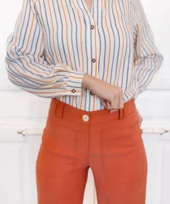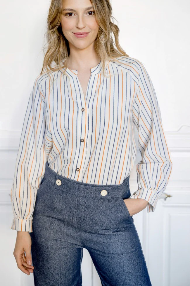 Camisa realizada en un tejido de algodon en rayas ocre y azul.