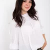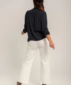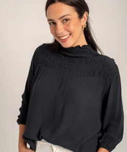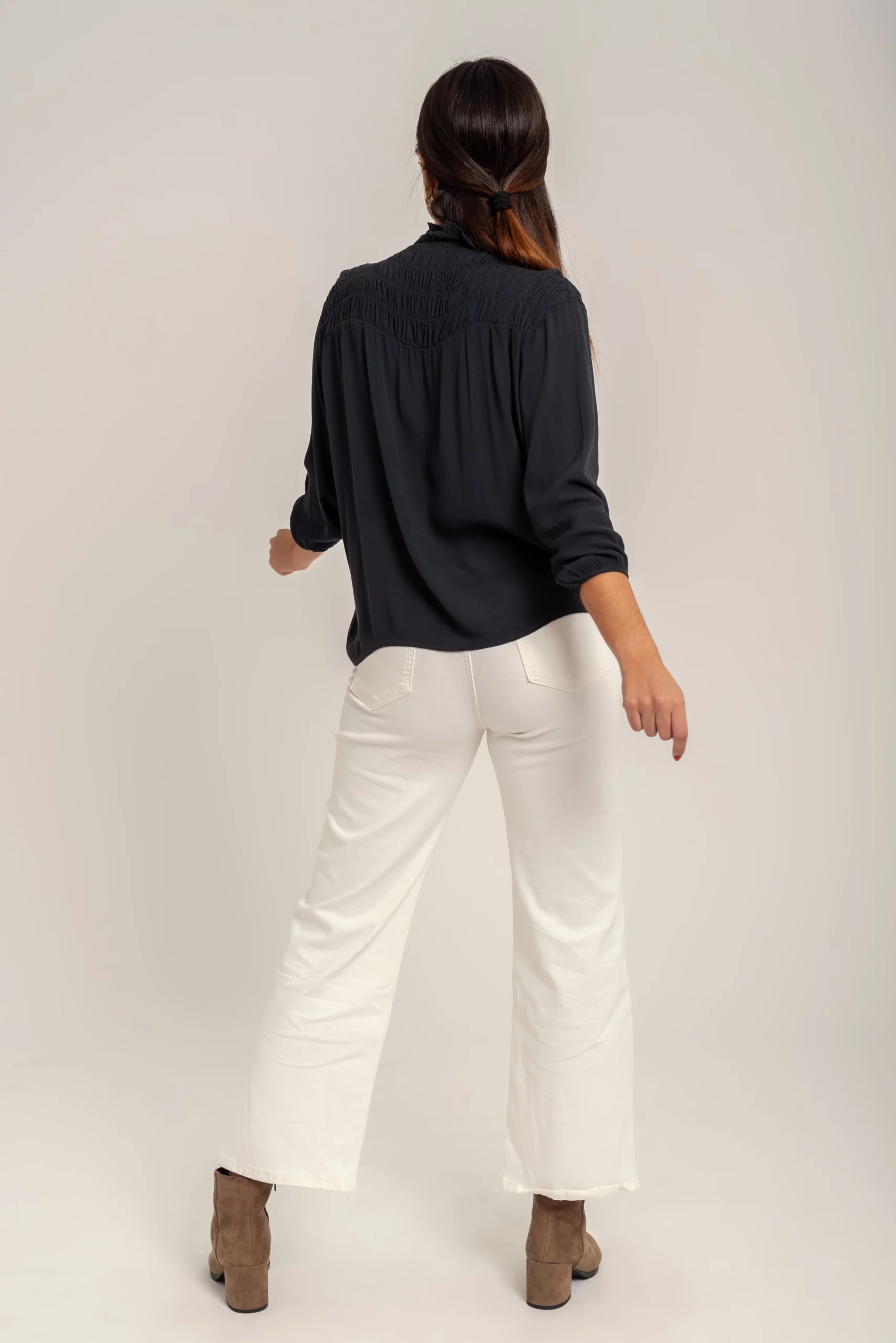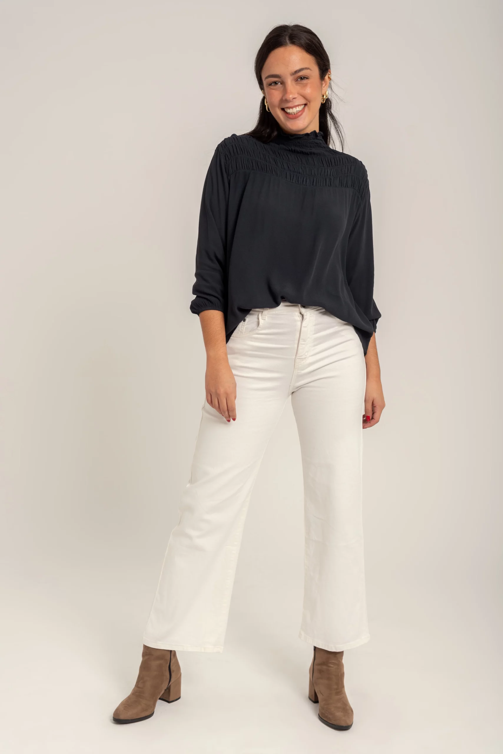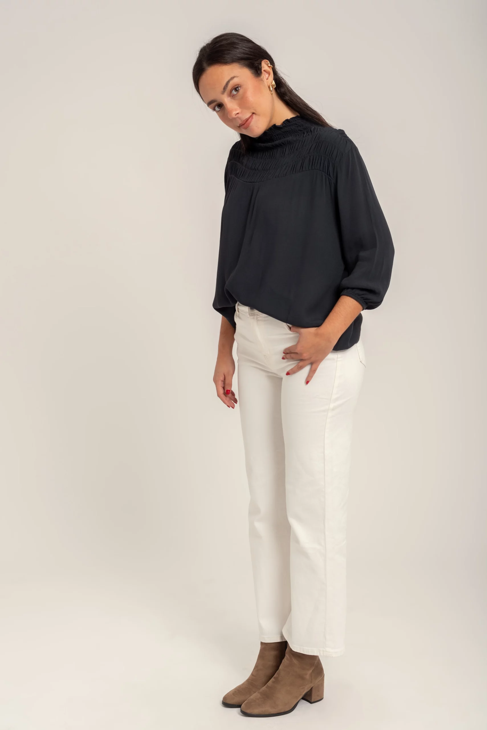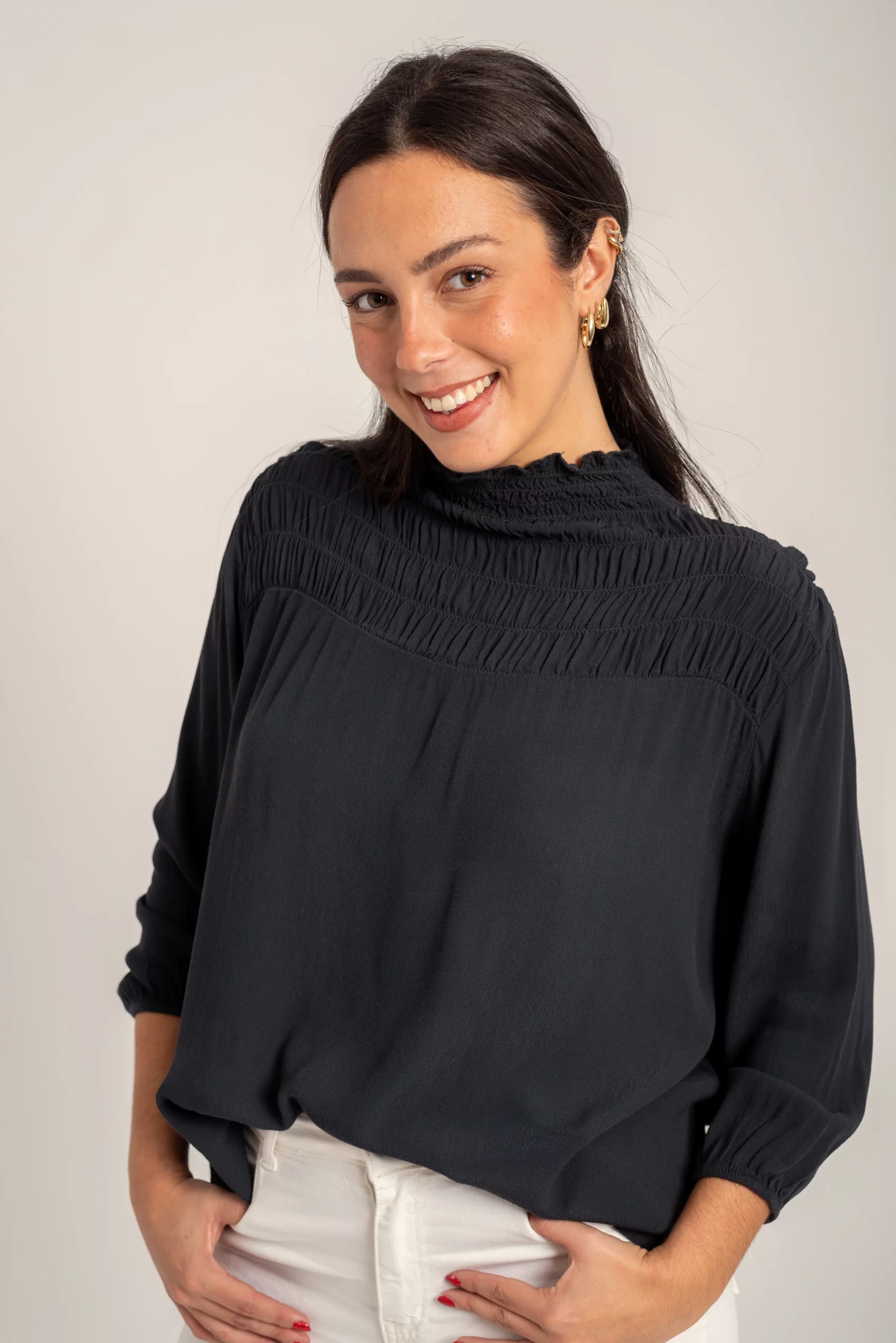 Blusa crepe con goma del pecho al cuello chimenea. Manga francesa con goma en el puño. Corte fluido. Un básico perfecto para toda la temporada.