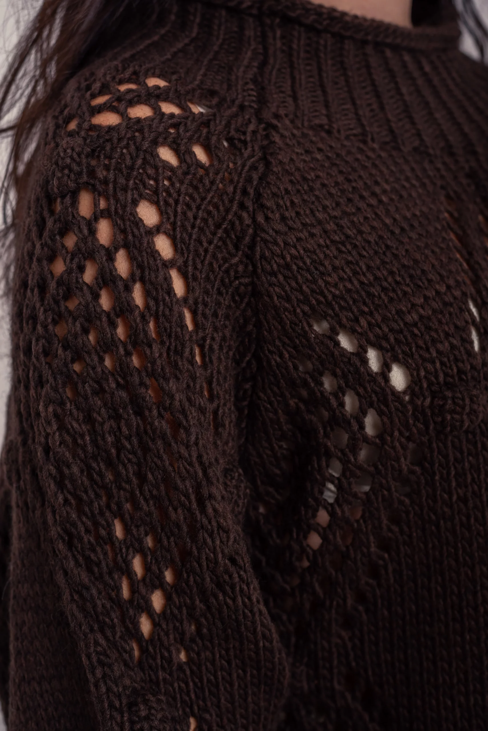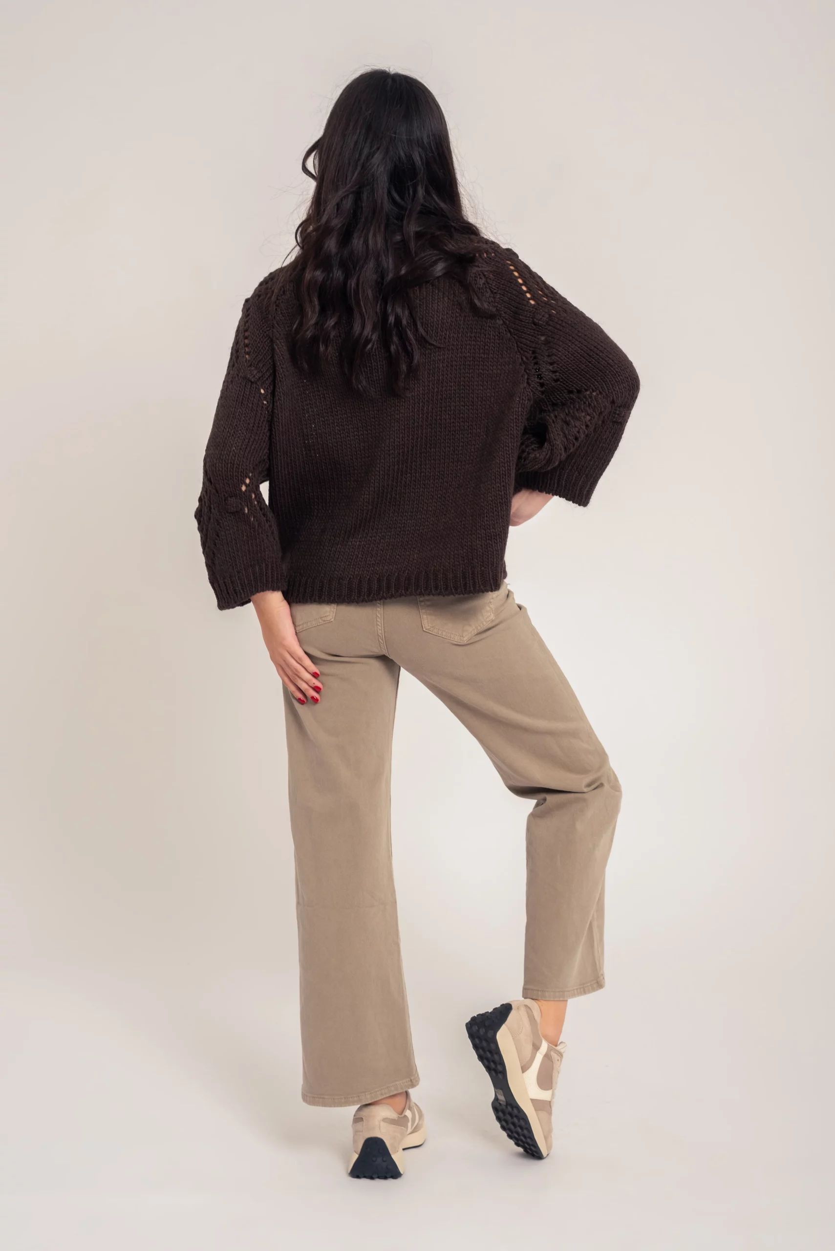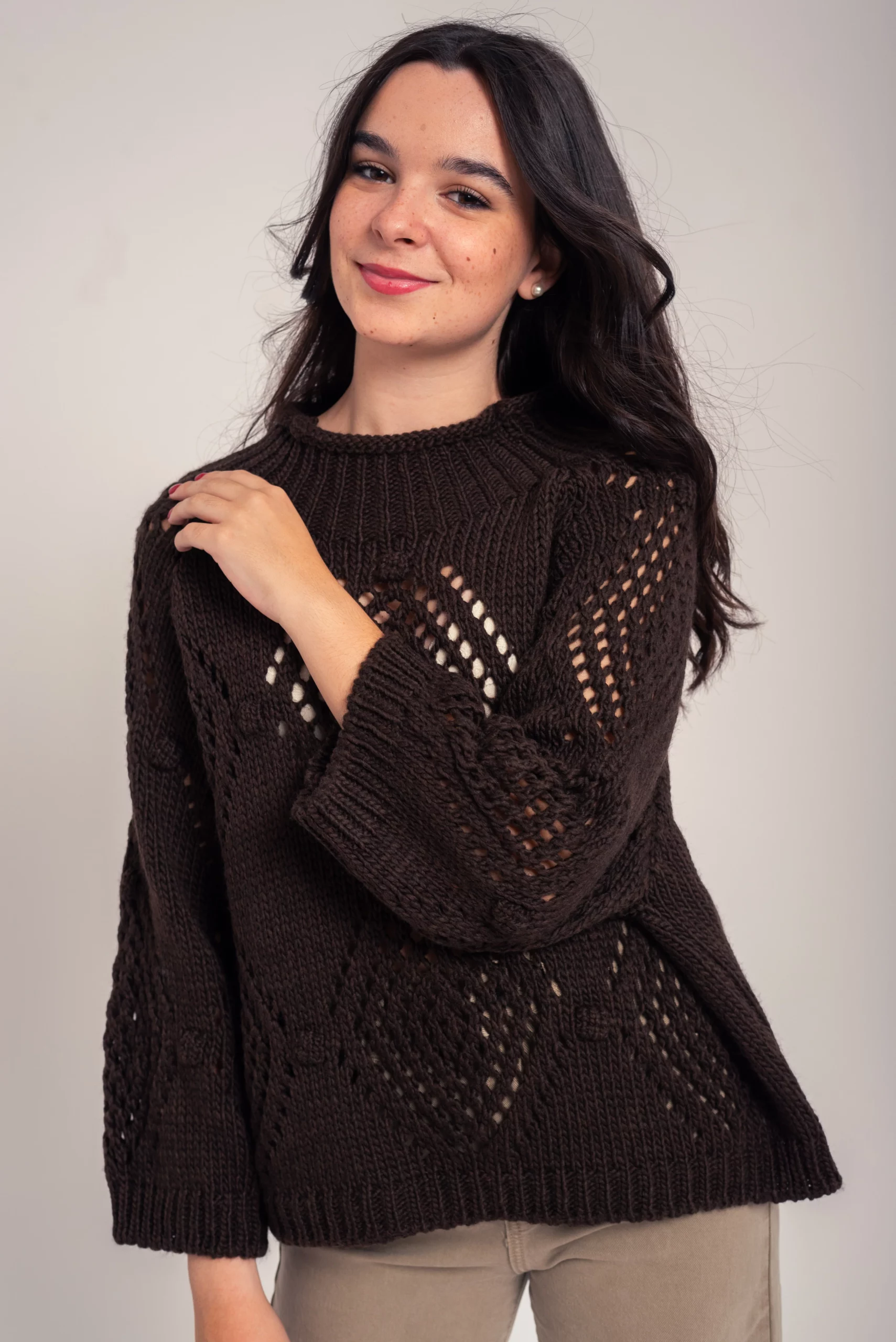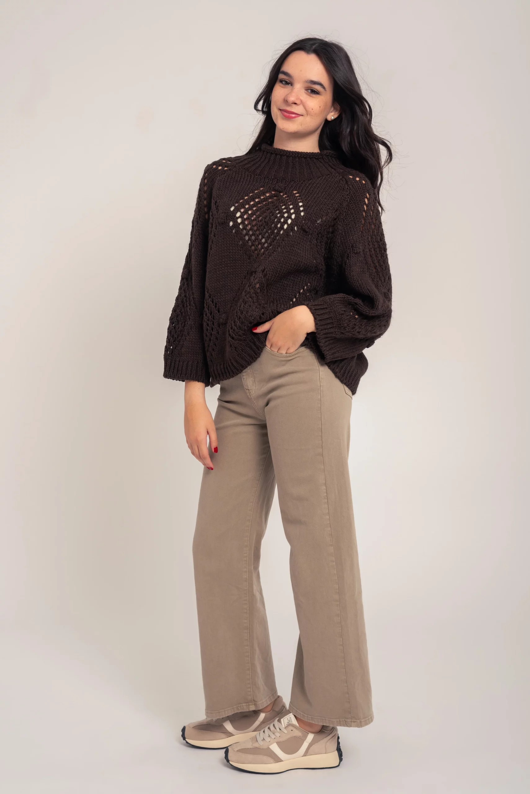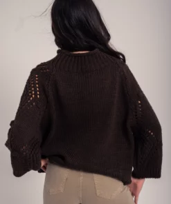 Jersey punto grueso, con bodoques y dibujo calado. Cuello chimenea. Manga larga. Corte amplio. Super cómodo y favorecedor.