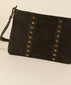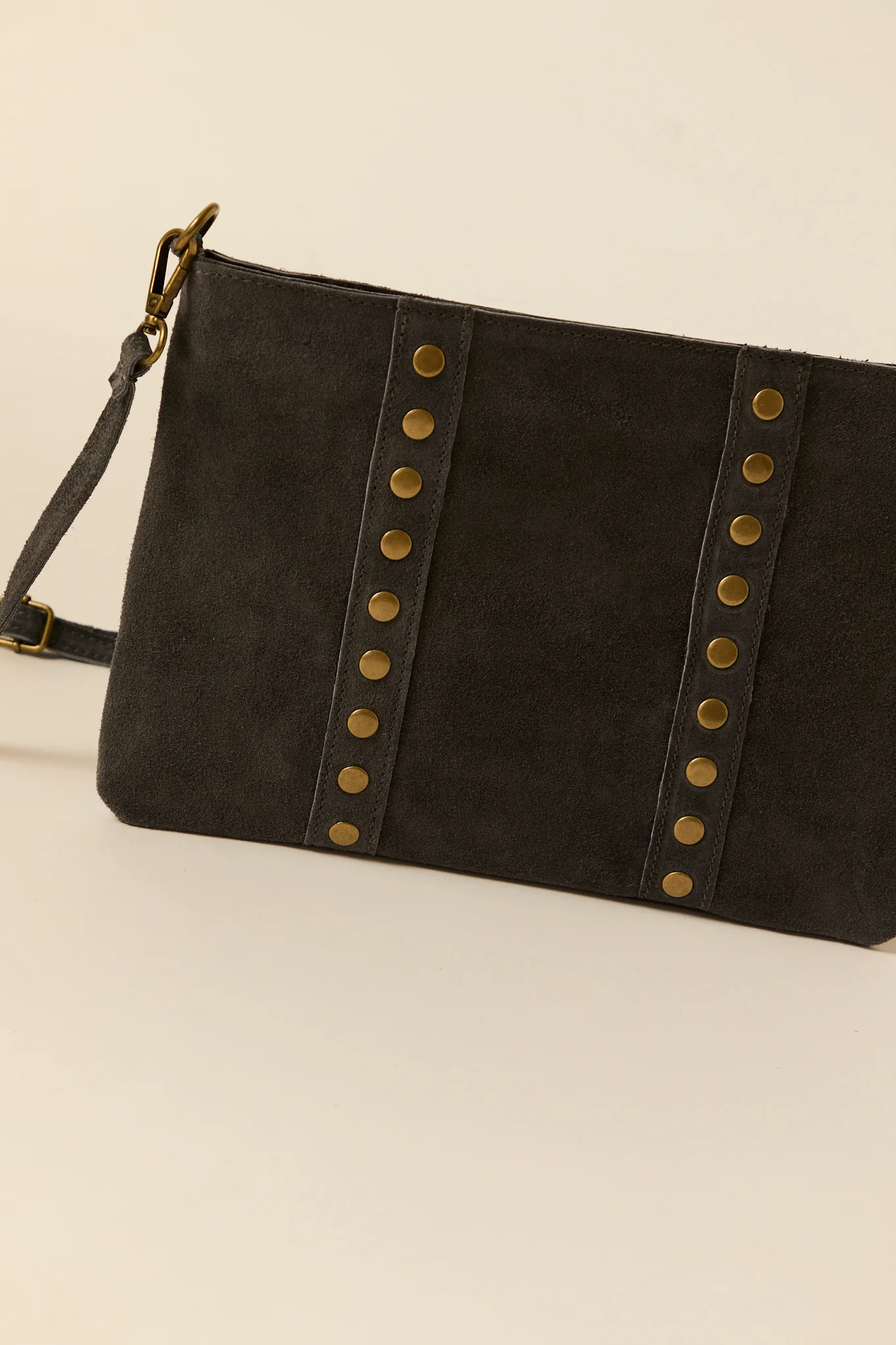Cartera de ante en color gris antracita con detalle de tachas metálicas y cierre de cremallera.