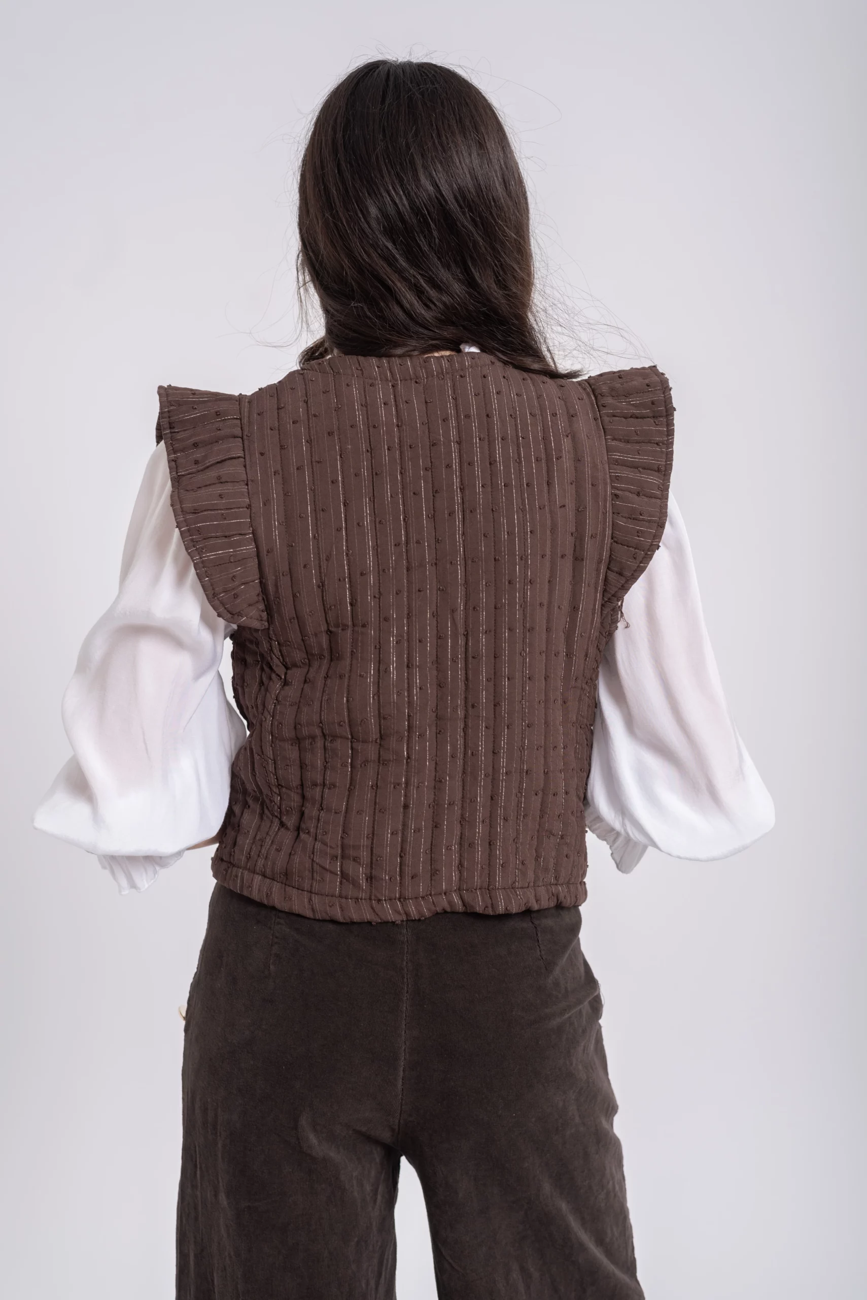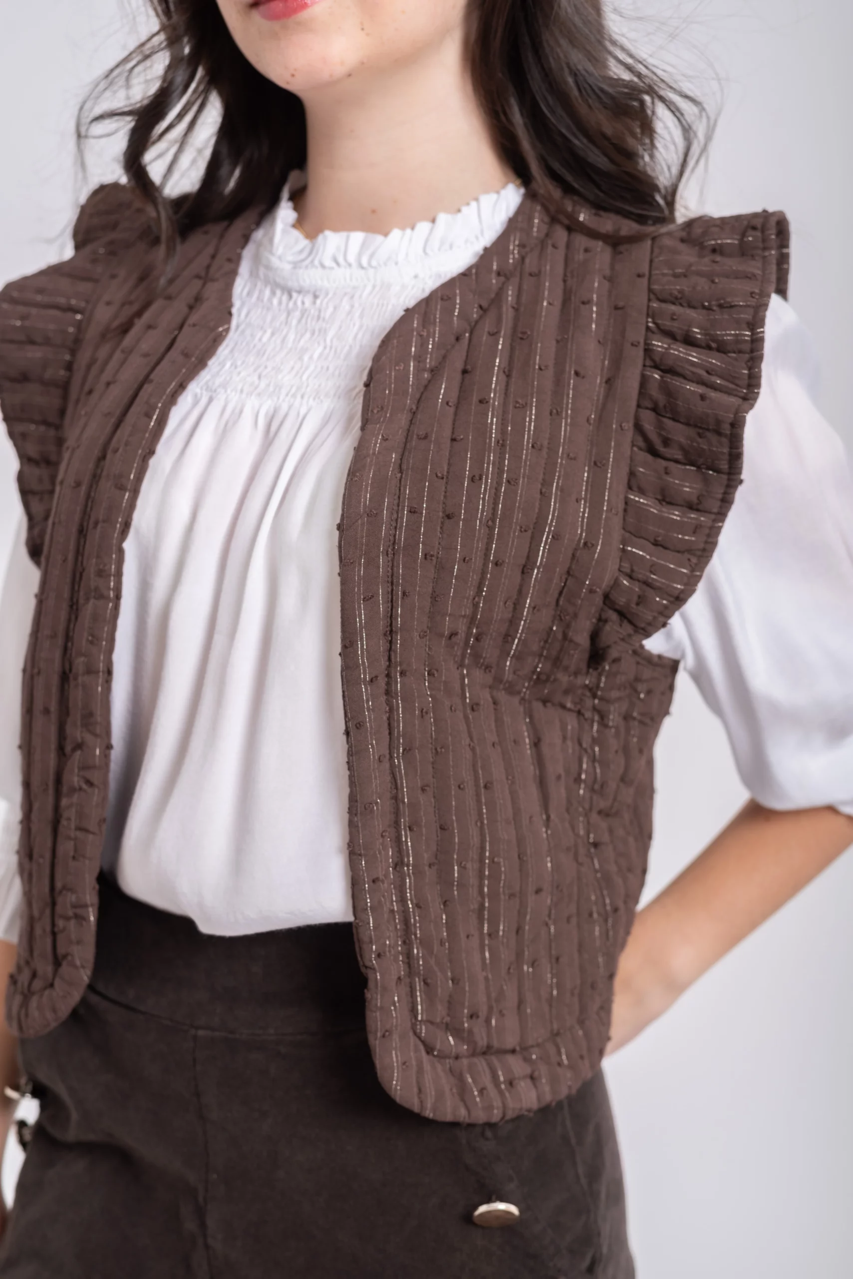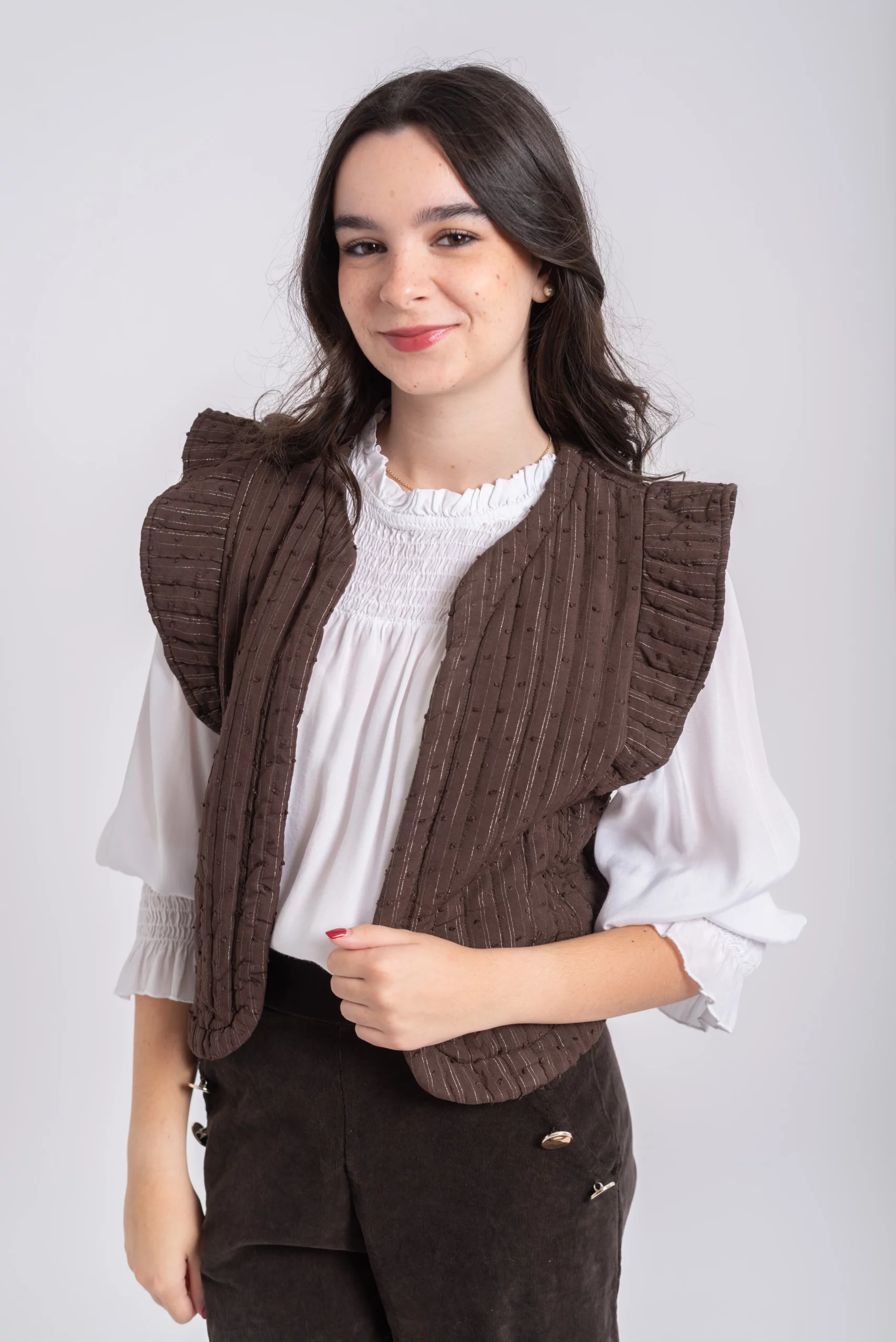 Chaleco acolchado. Liso con hilos de lurex en dorado. Detalle de volante sobre el hombro.