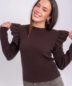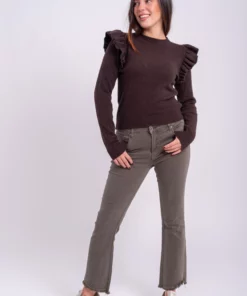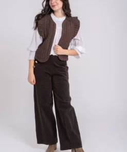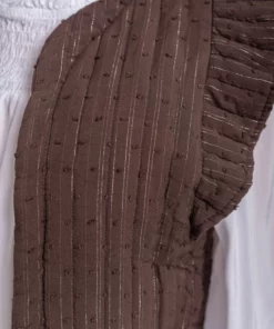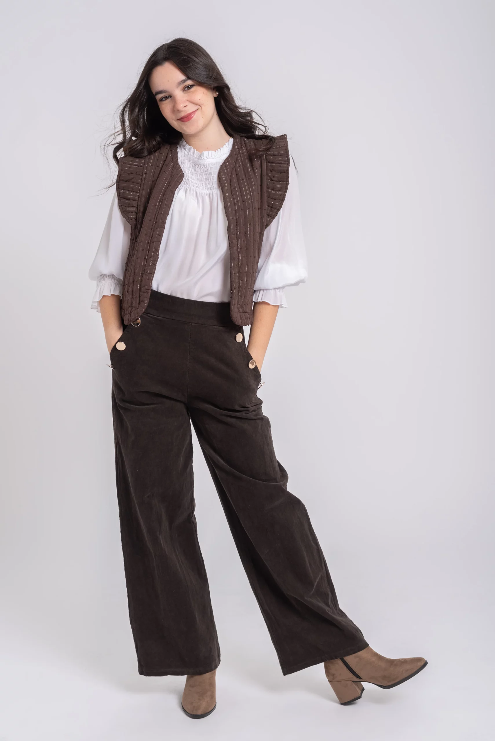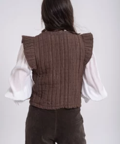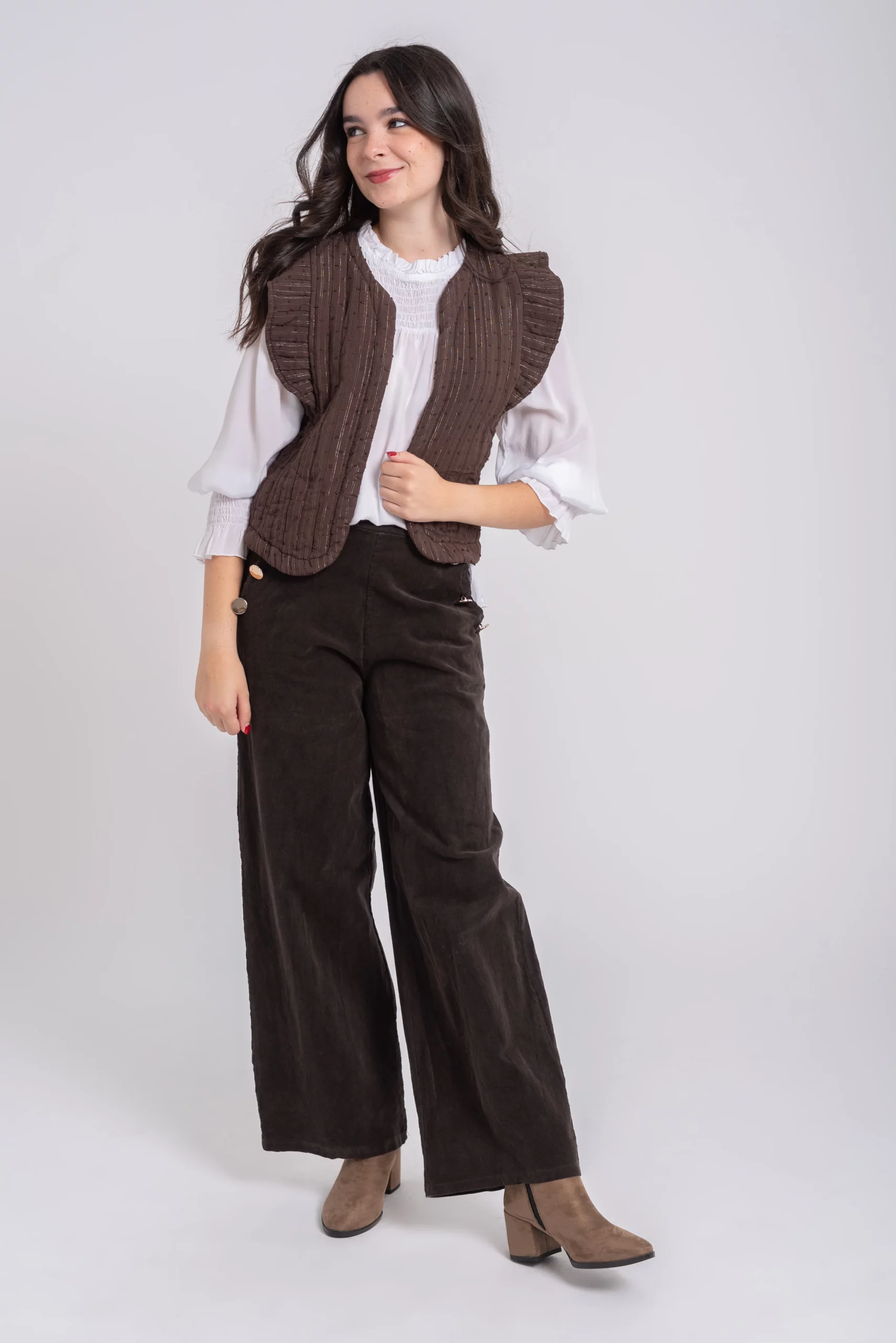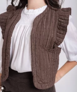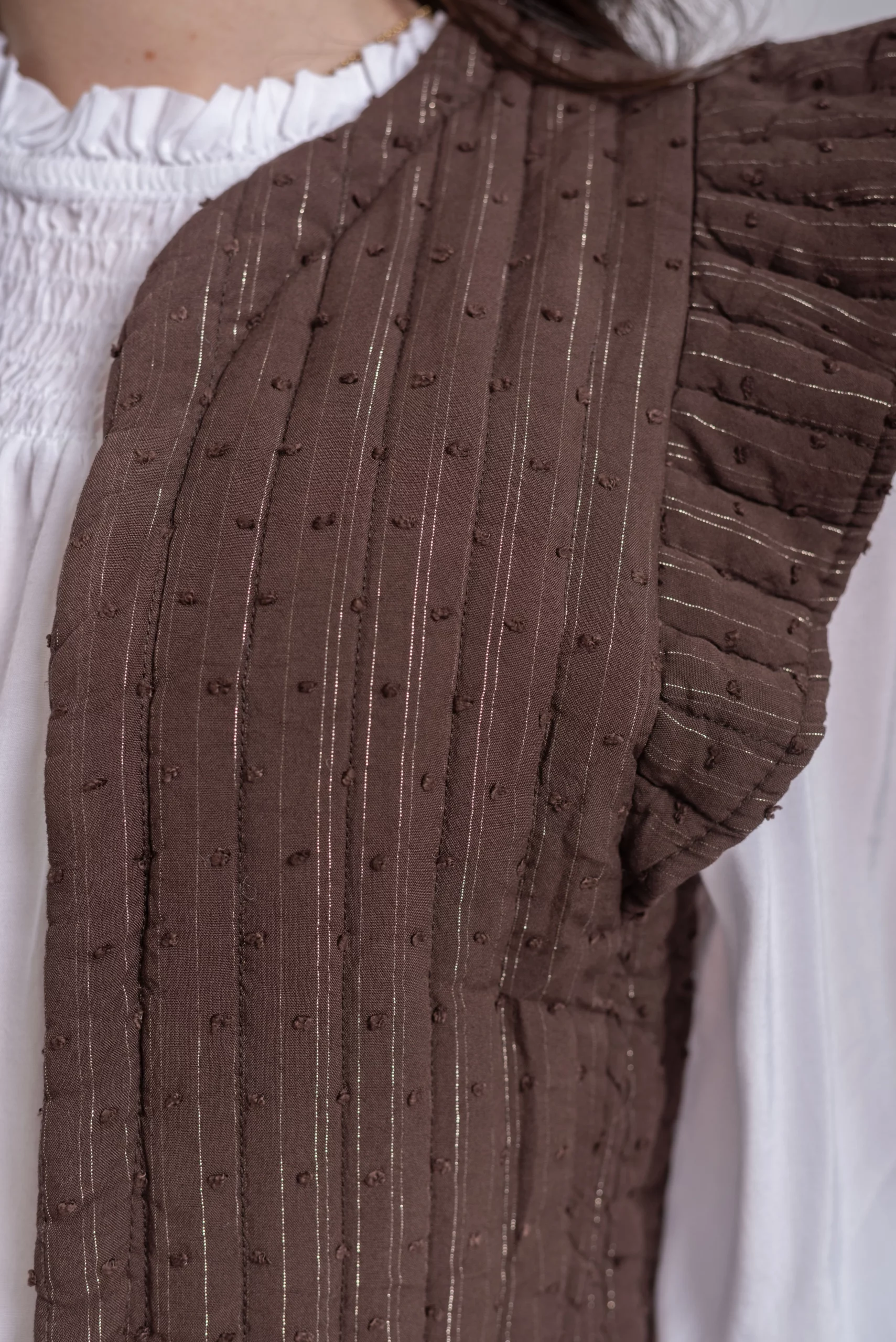 Chaleco acolchado. Liso con hilos de lurex en dorado. Detalle de volante sobre el hombro.