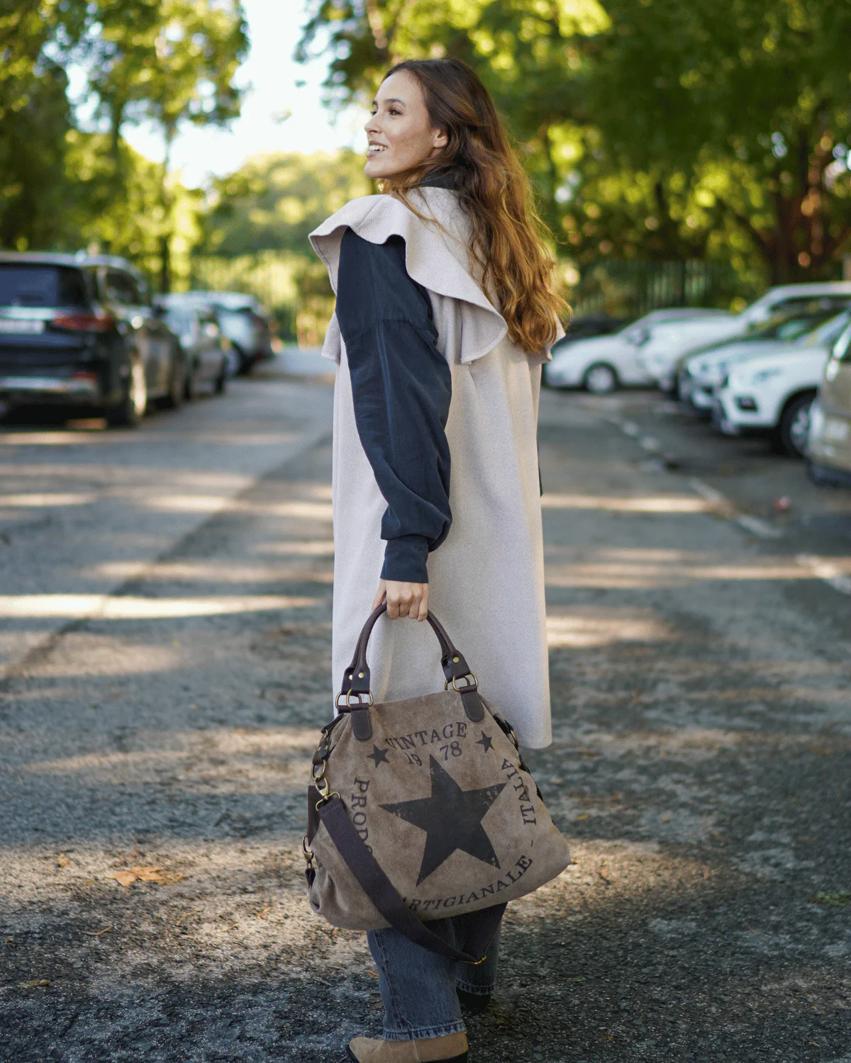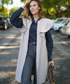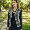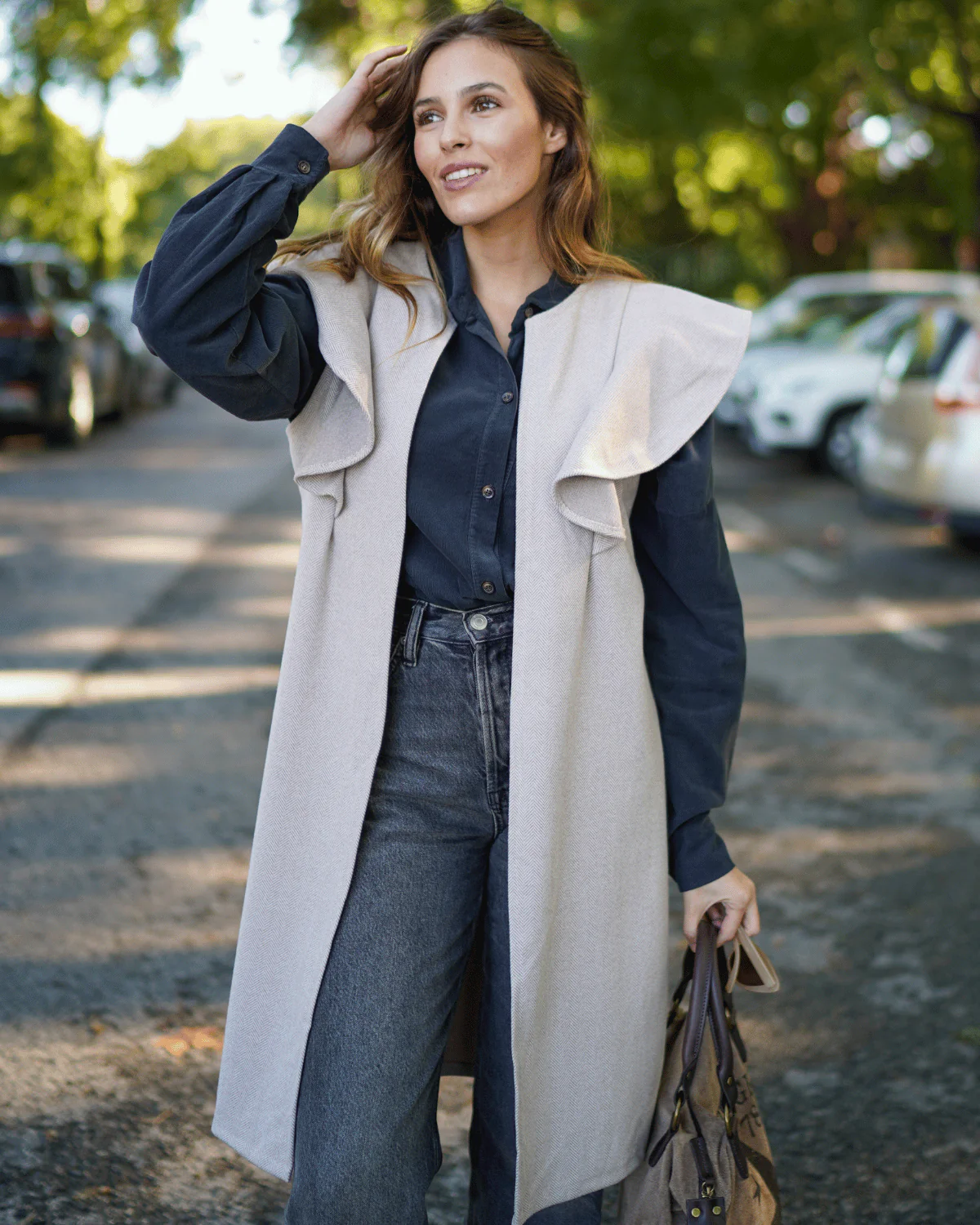- Chaleco abierto largo con estampado de espigas y manga sisa.