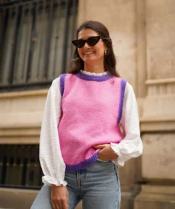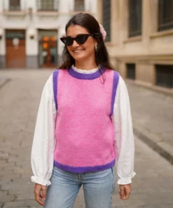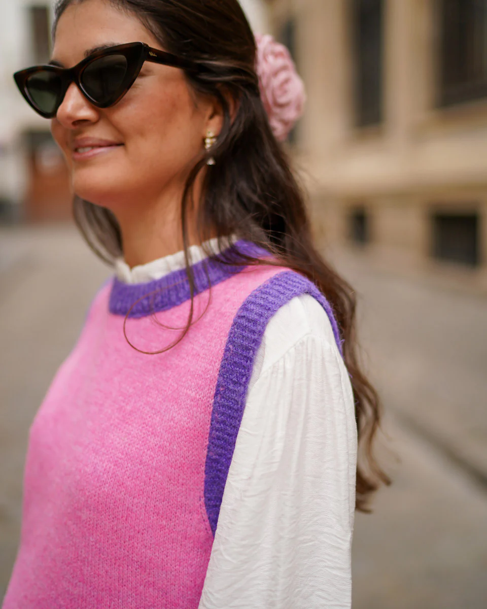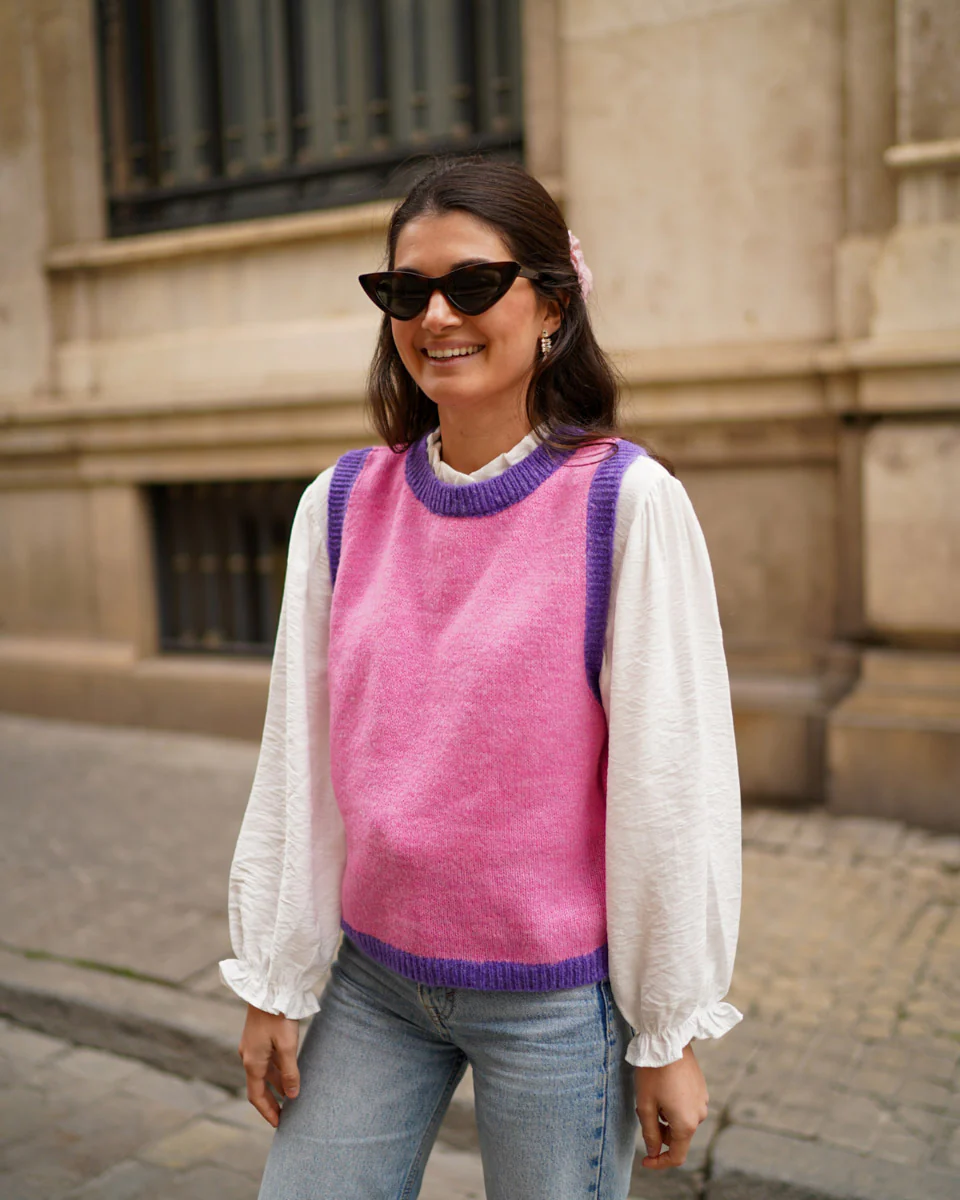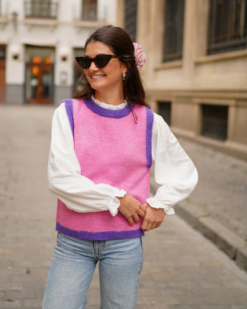 - Chaleco de punto con acabados en rib de color haciendo contraste.