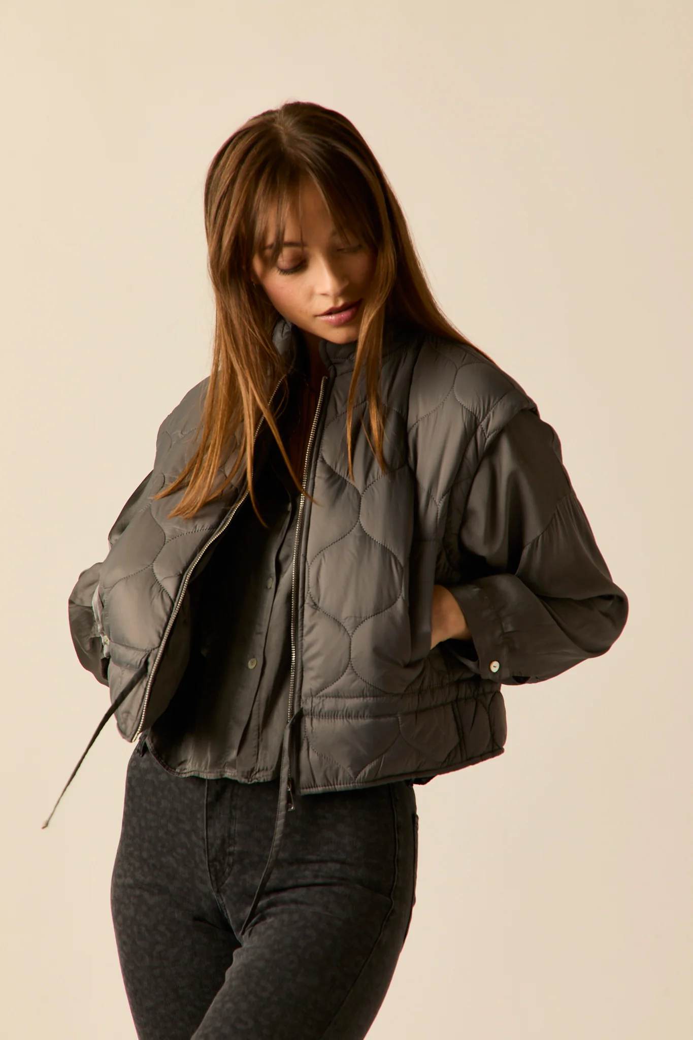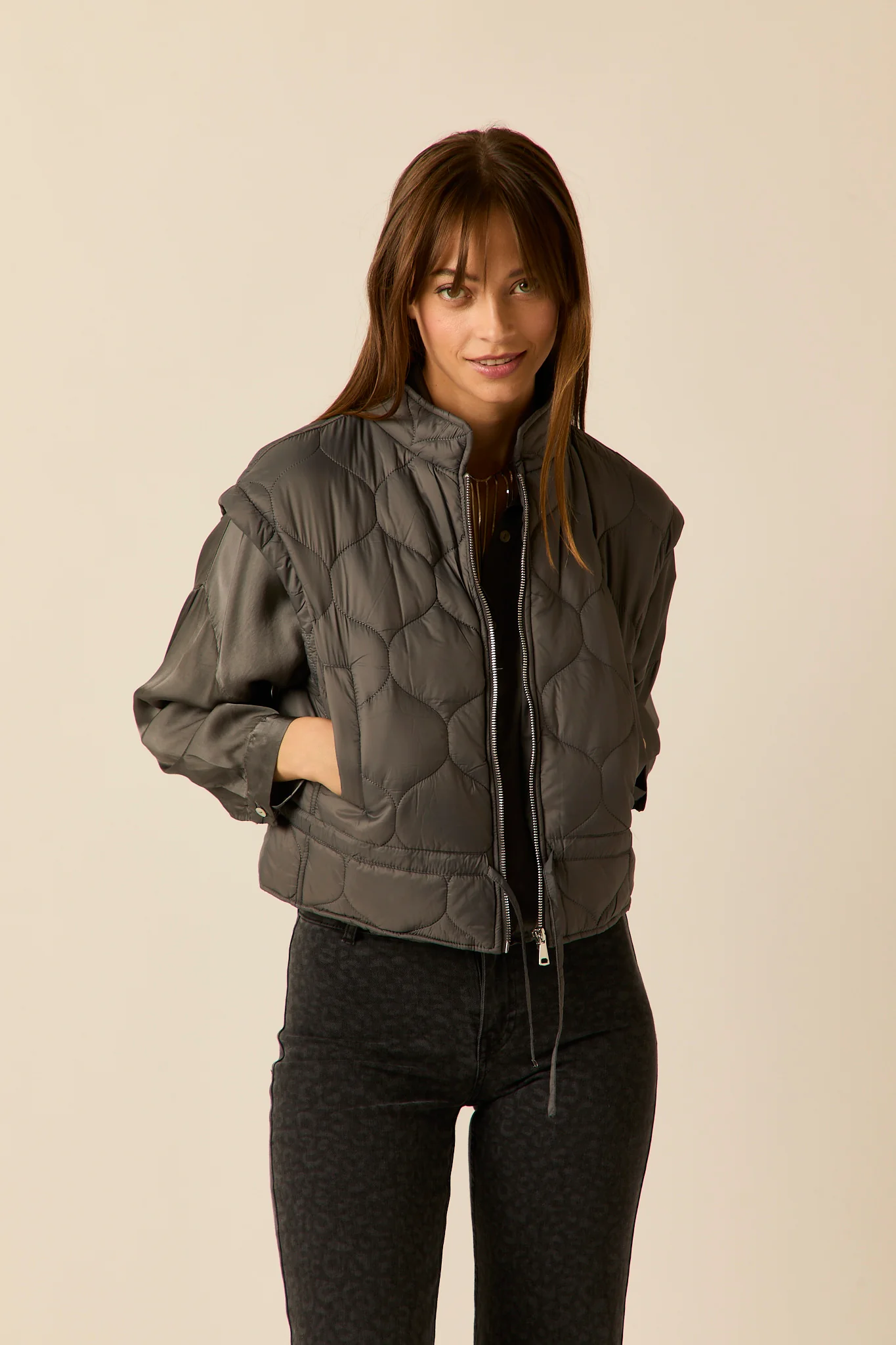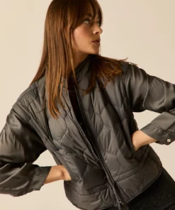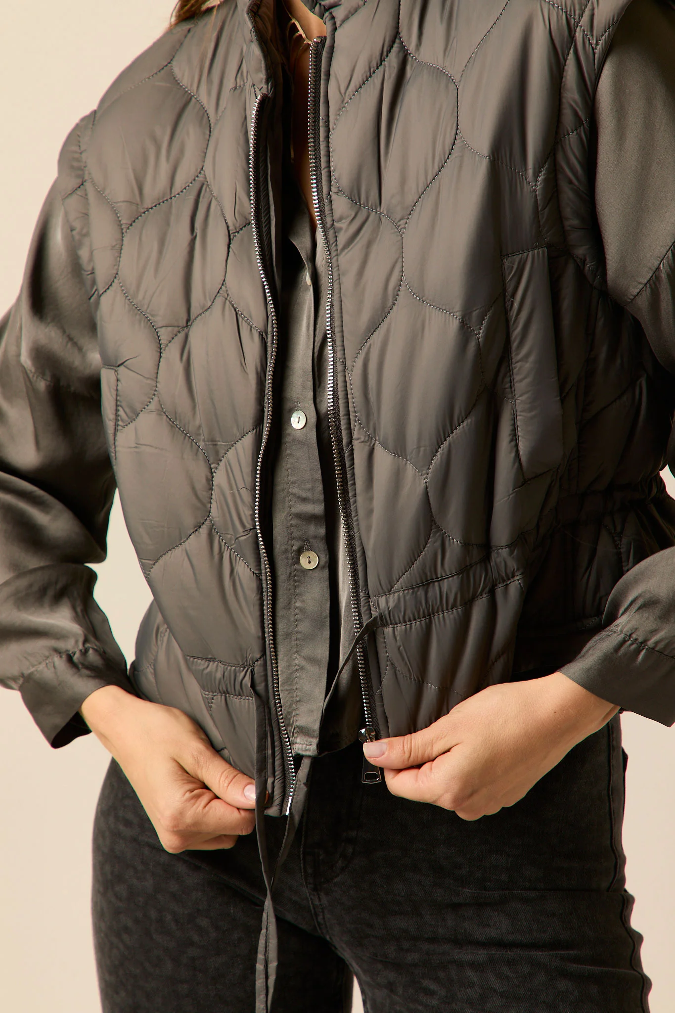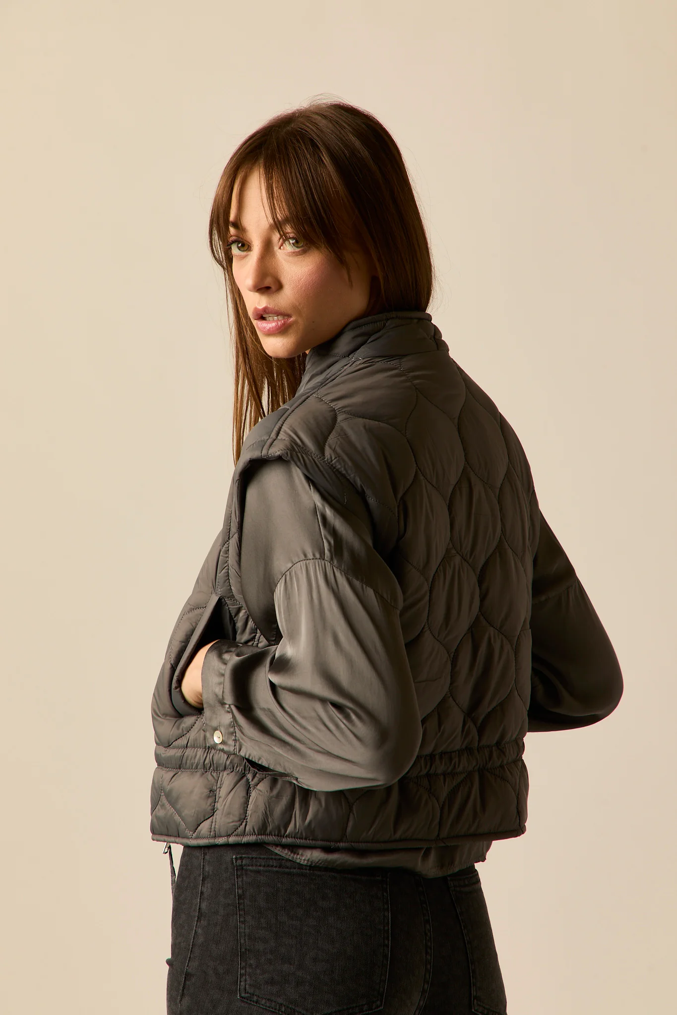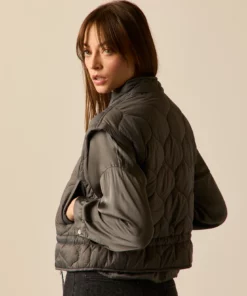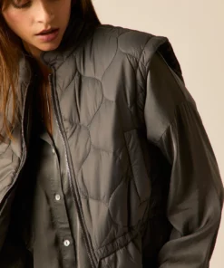 Chaleco de plumas en color gris antracita. Cuello caja, sin mangas, cierre frontal de cremallera, dos bolsillos laterales y detalle de cordones.