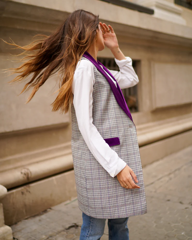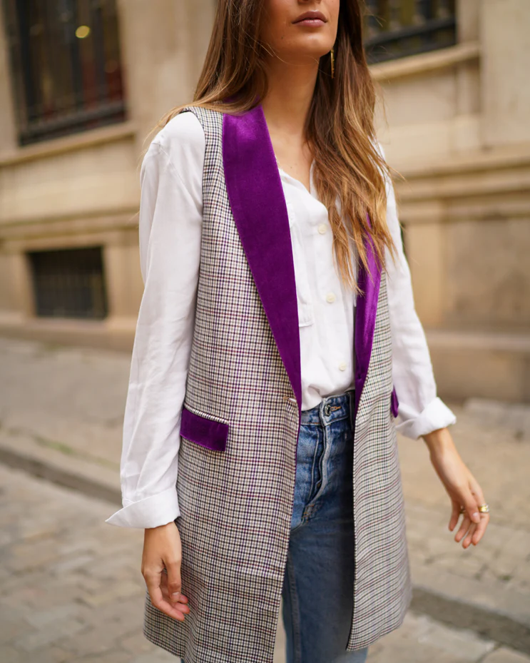 - Chaleco tipo blazer de manga larga y cuello solapa haciendo contraste.