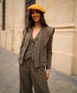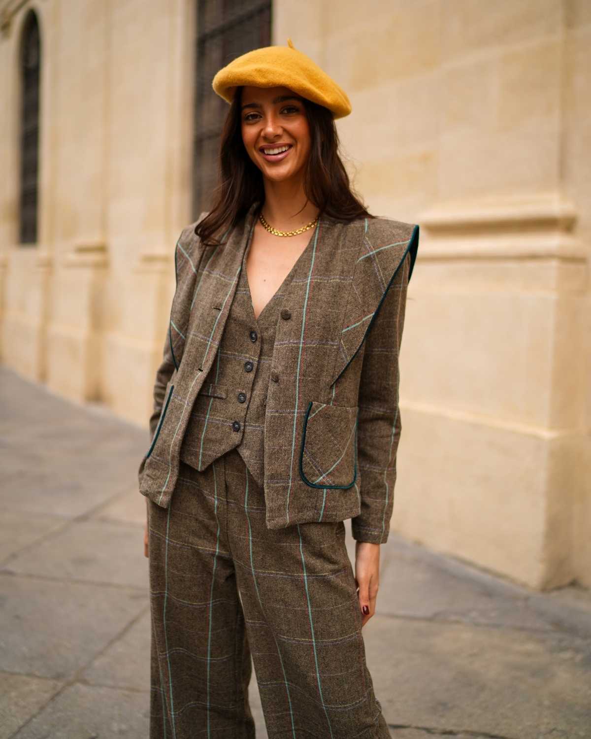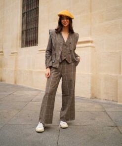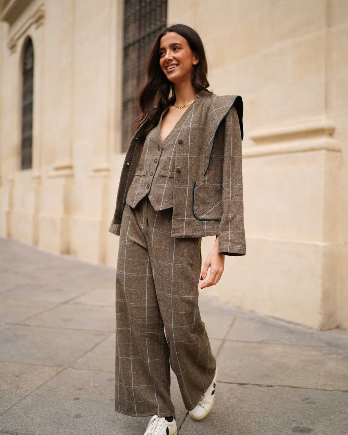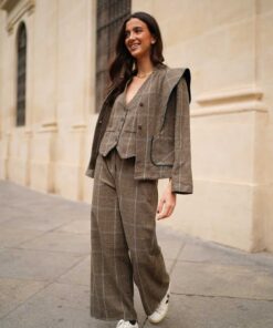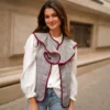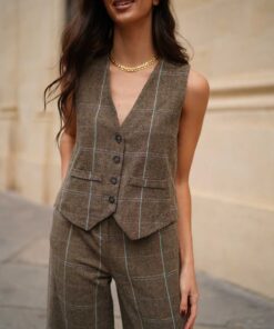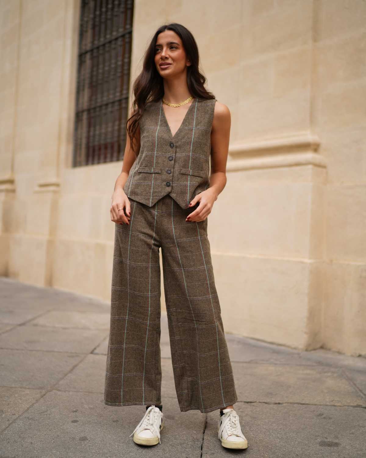 - Chaleco corto con estampado de espigas, escote pico y manga sisa.