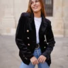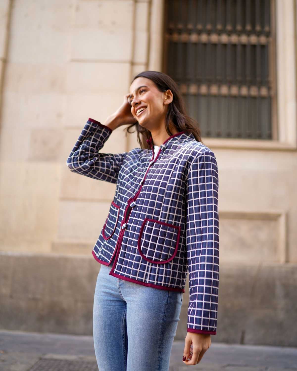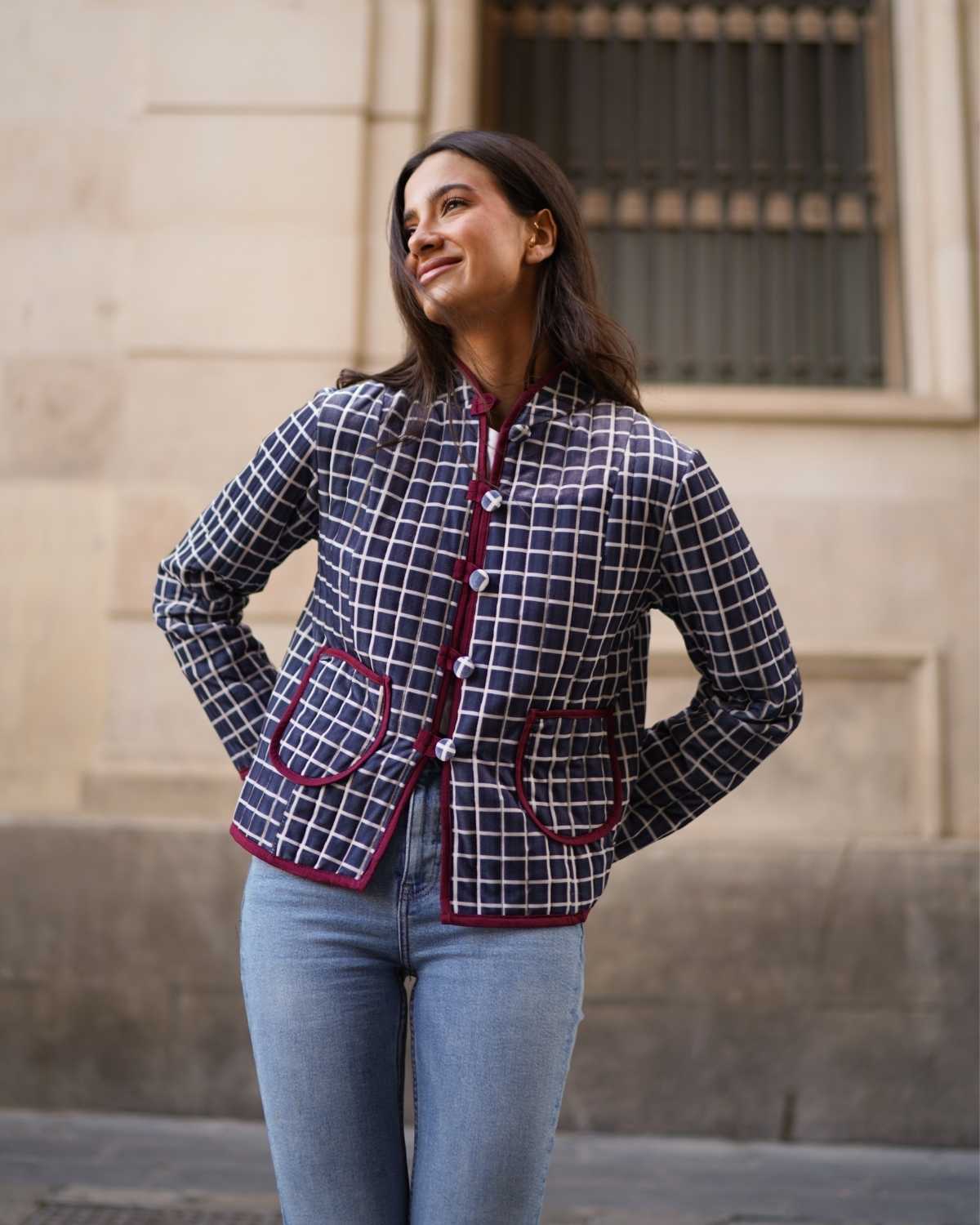 - Chaqueta ligeramente acolchada con estampado de cuadros y manga larga en tejido de terciopelo.