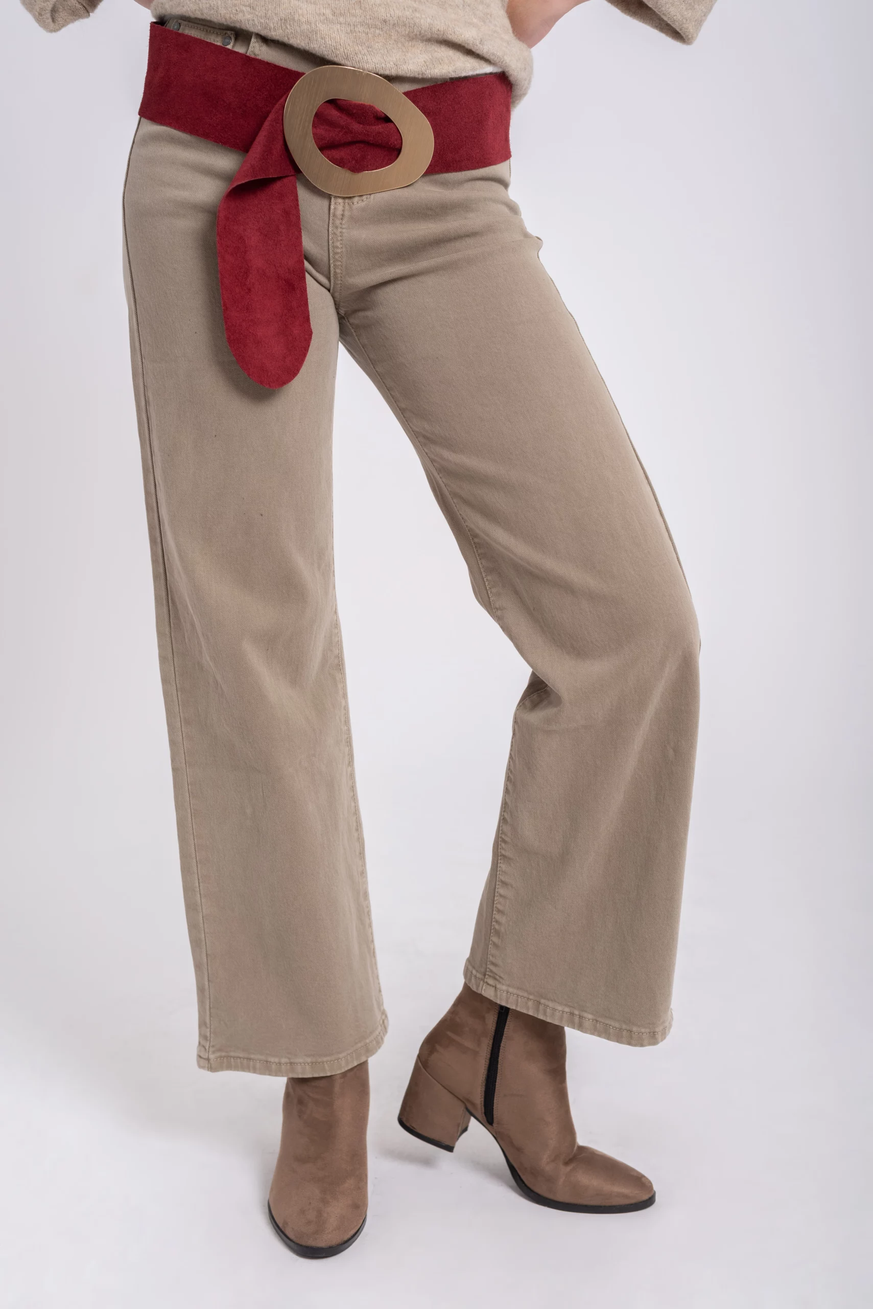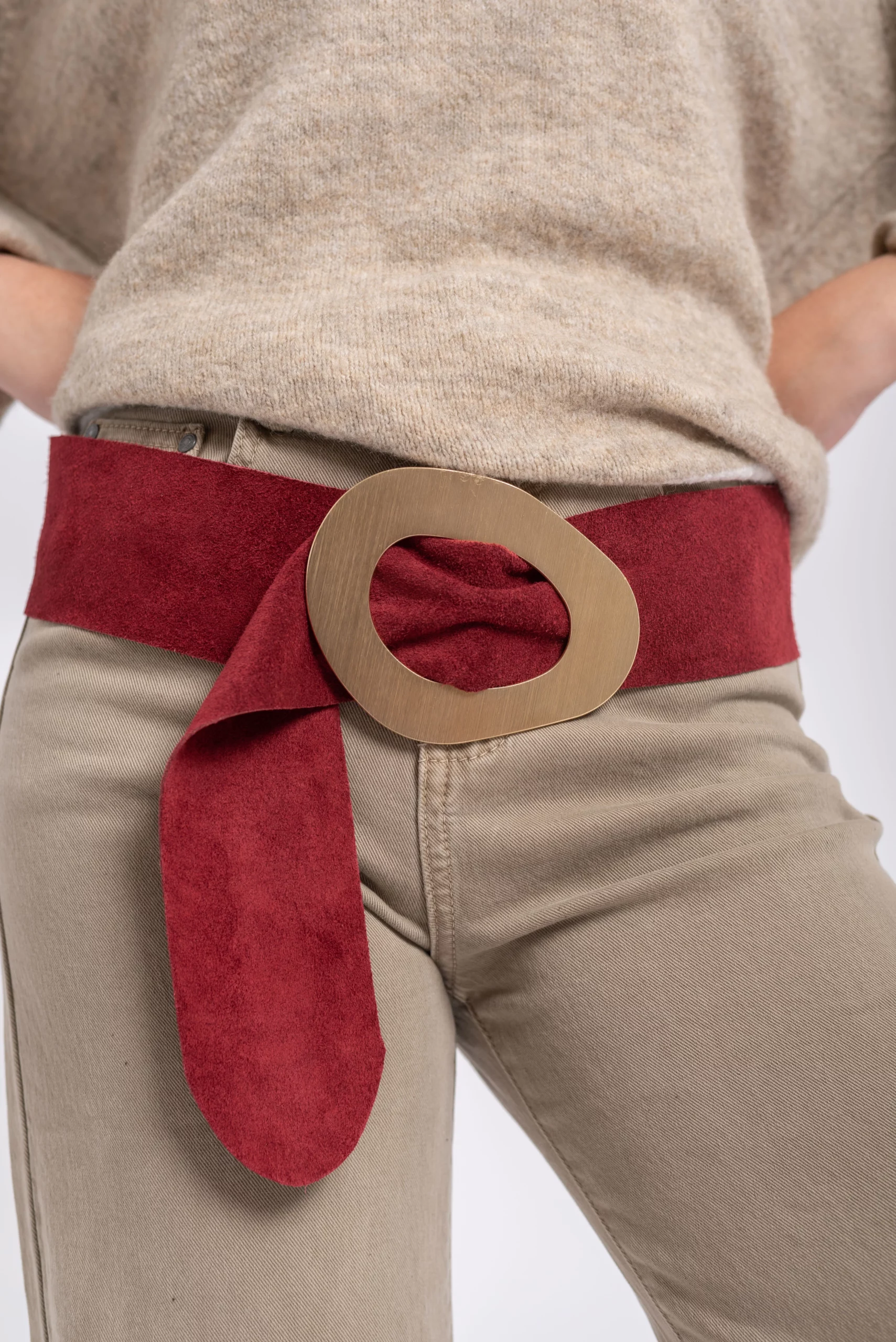 Cinturon banda ancha de piel serraje en tono burdeos. Hebilla Dorada.