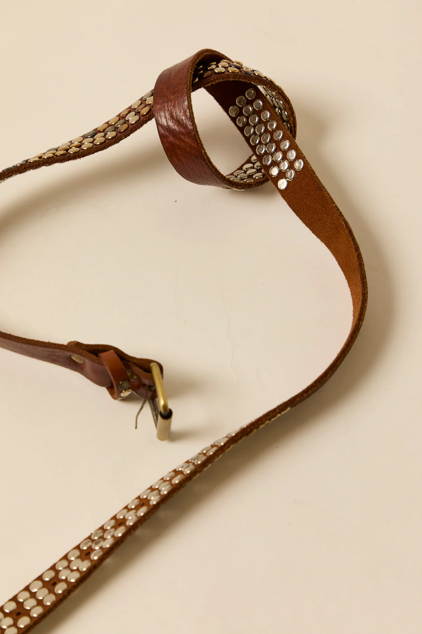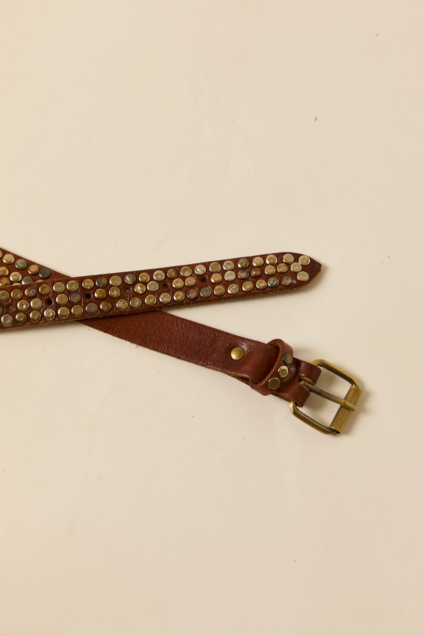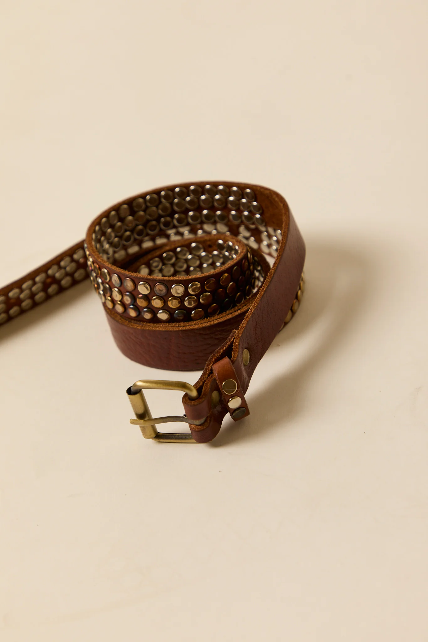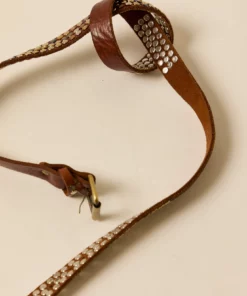 Cinturón de piel en color marrón con detalle de tachas metálicas.