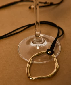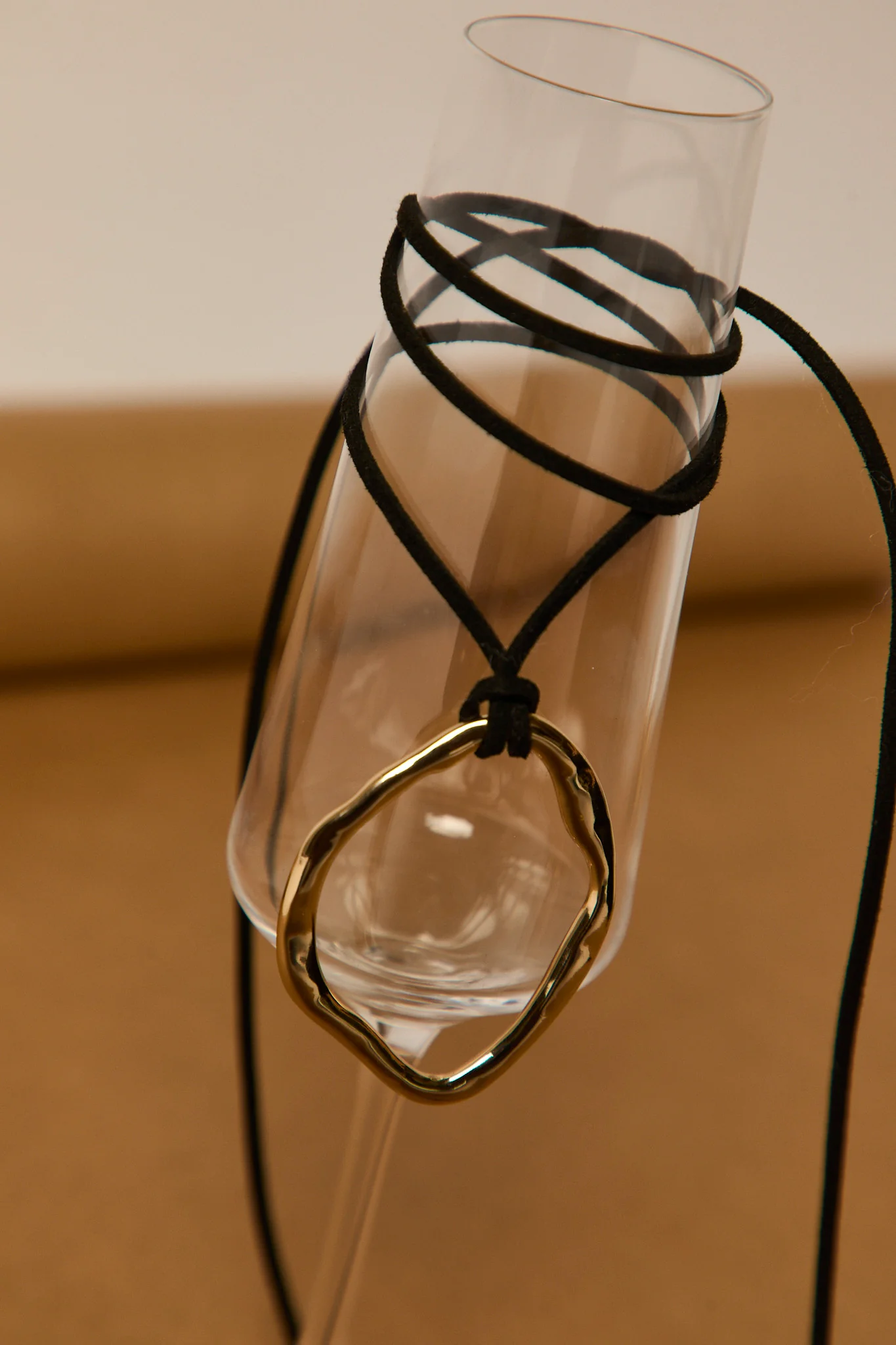 Colgante de cuerda de terciopelo en color negro con círculo dorado.