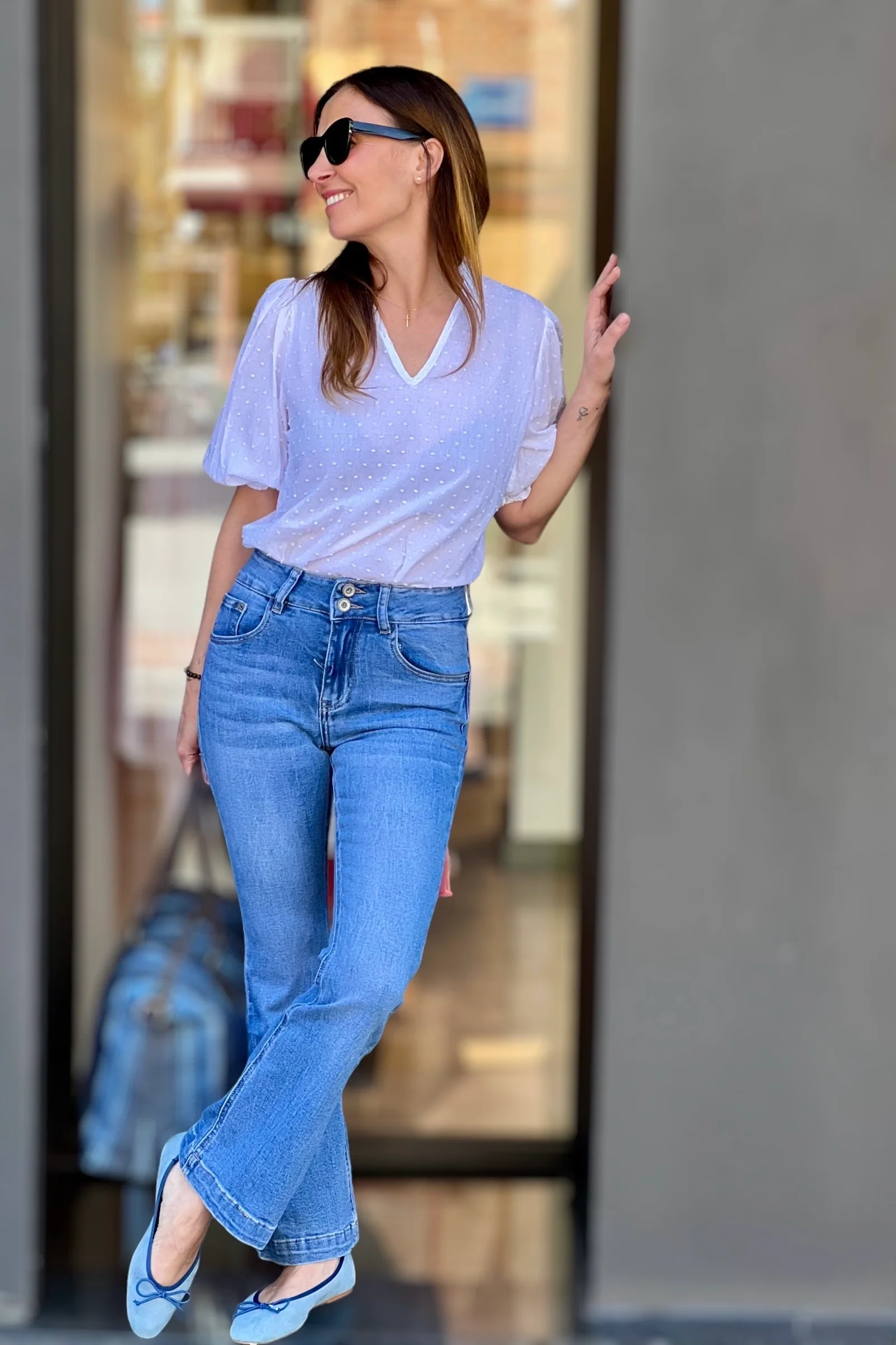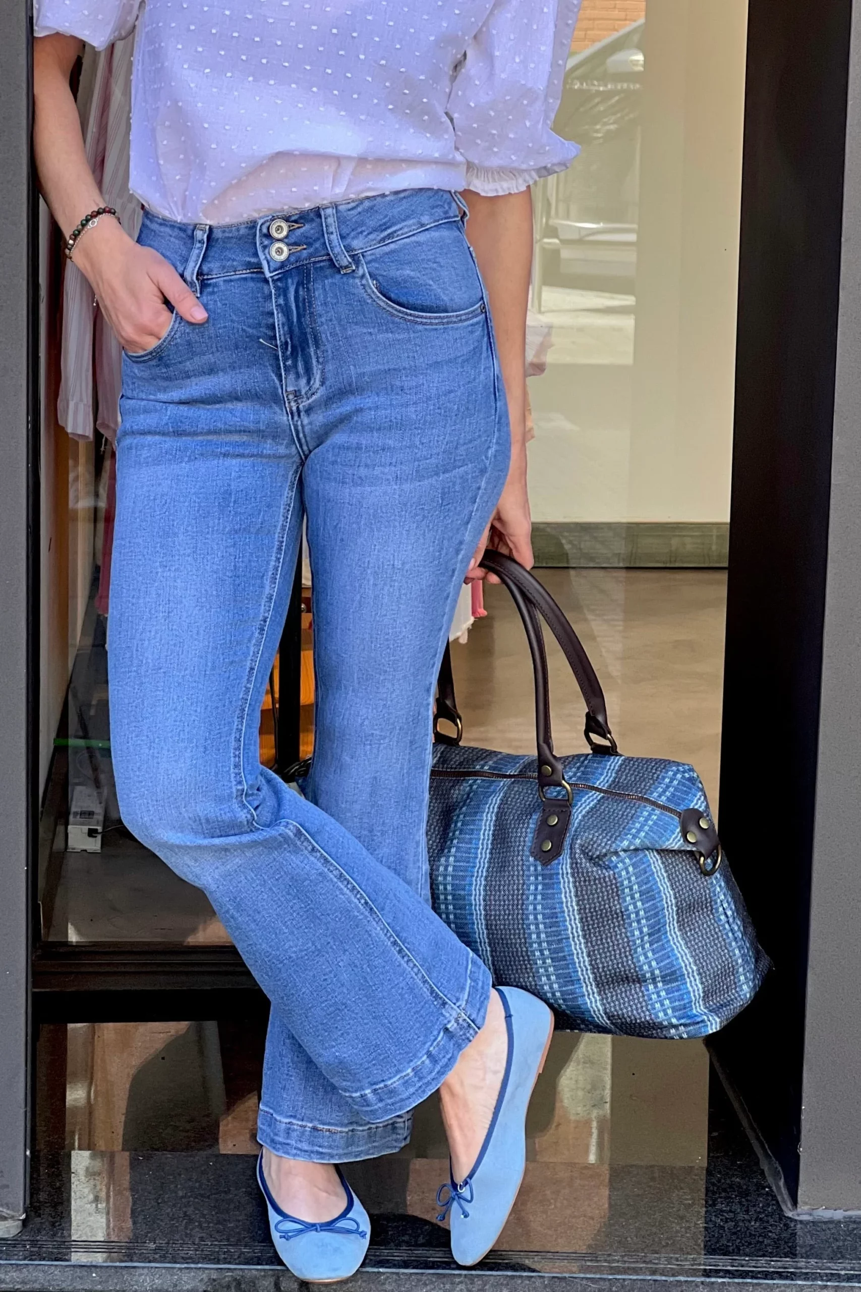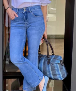Jeans corte flare. Cinturilla con doble botón y cremallera. Cinco Bolsillos. Tono medio lavado. Sienta de maravilla!!