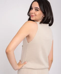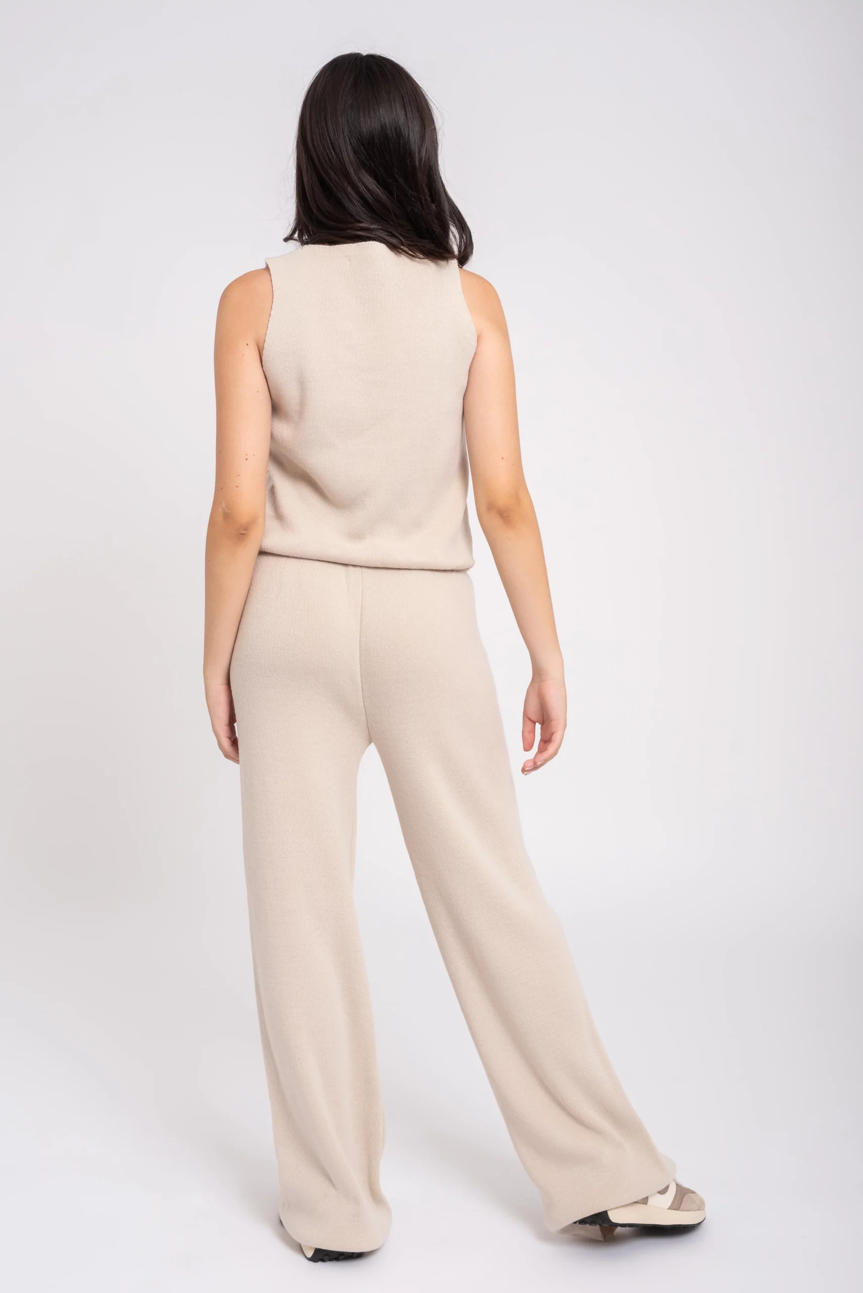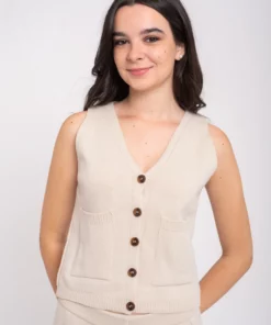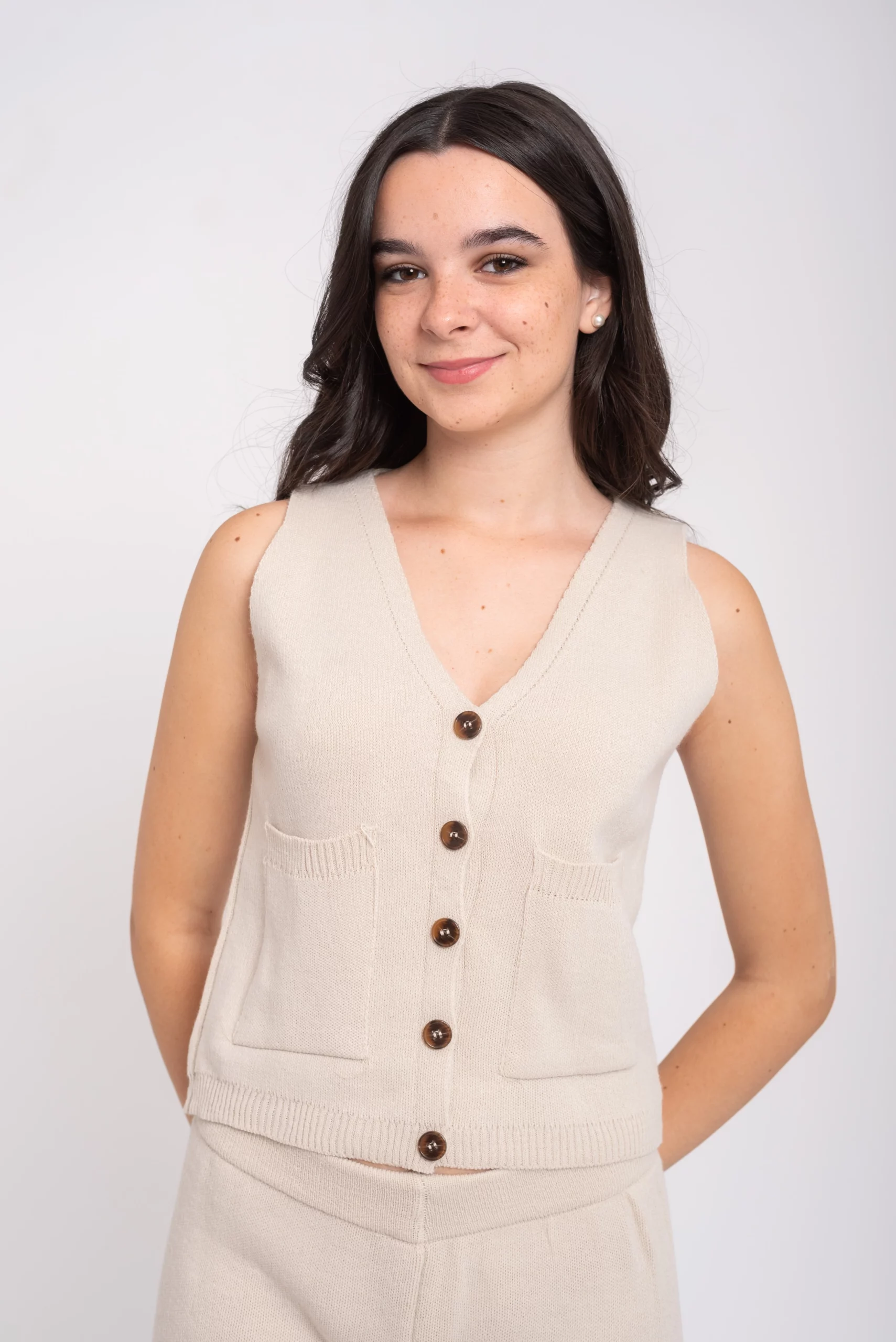 Conjunto de chaleco y pantalón. Chaleco abotonado sobre el pecho y pantalón con goma en cintura. Total look de punto ideal para llevar solo o combinado con una camiseta o camisa. ¡Te va a enamorar!