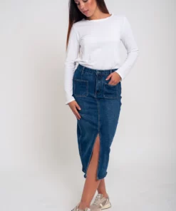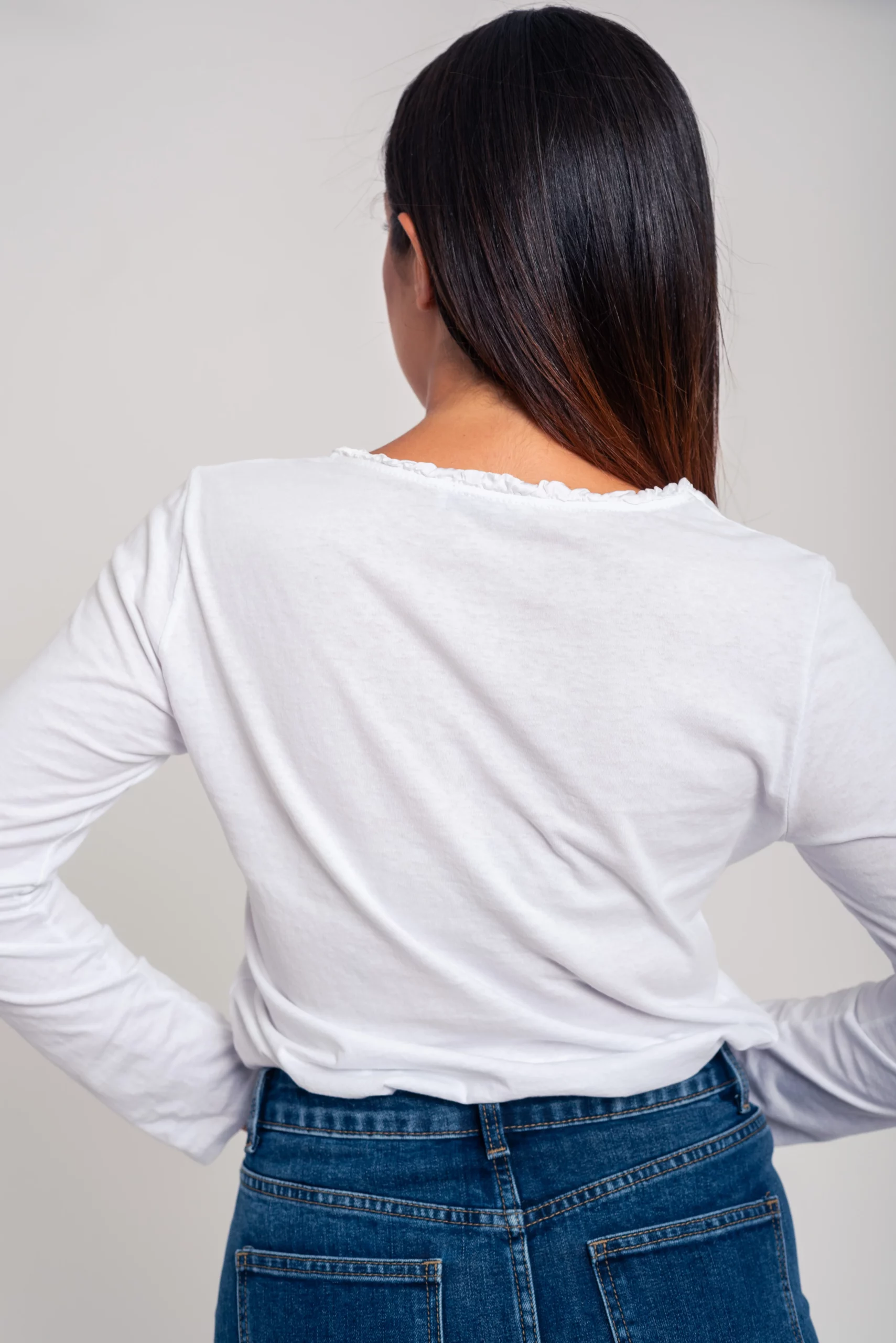 Camiseta básica con nuestro logo bordado al tono. Cuello redondo con detalle de volante tableado. Manga larga. Un fondo de armario imprescindible. Ideal en todos lo colores.