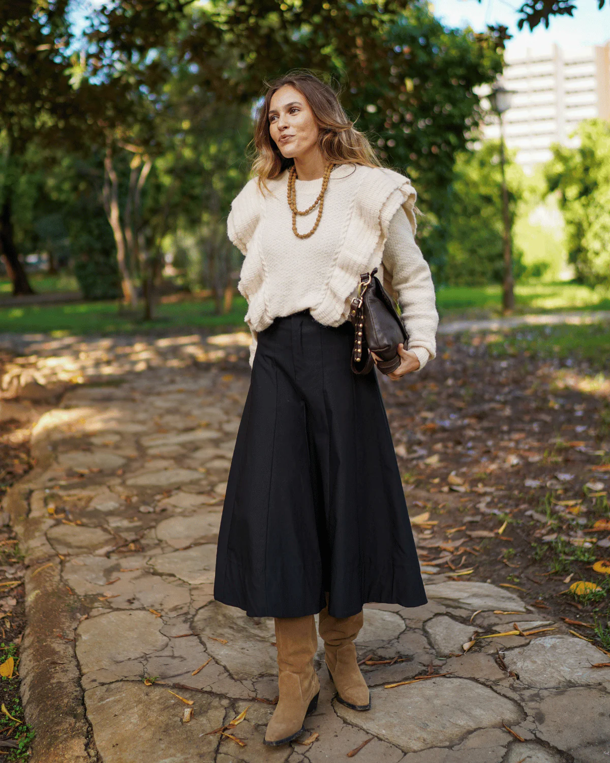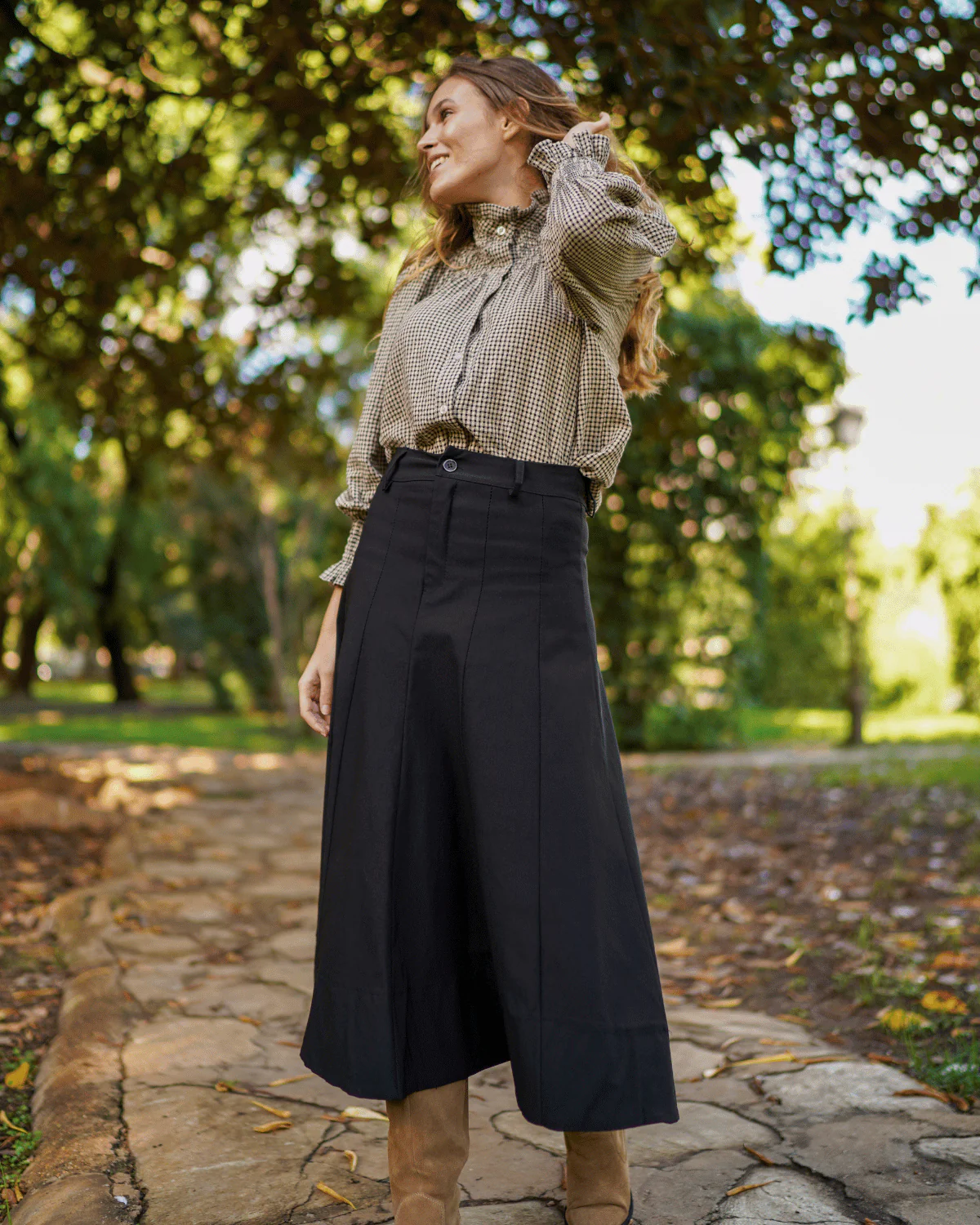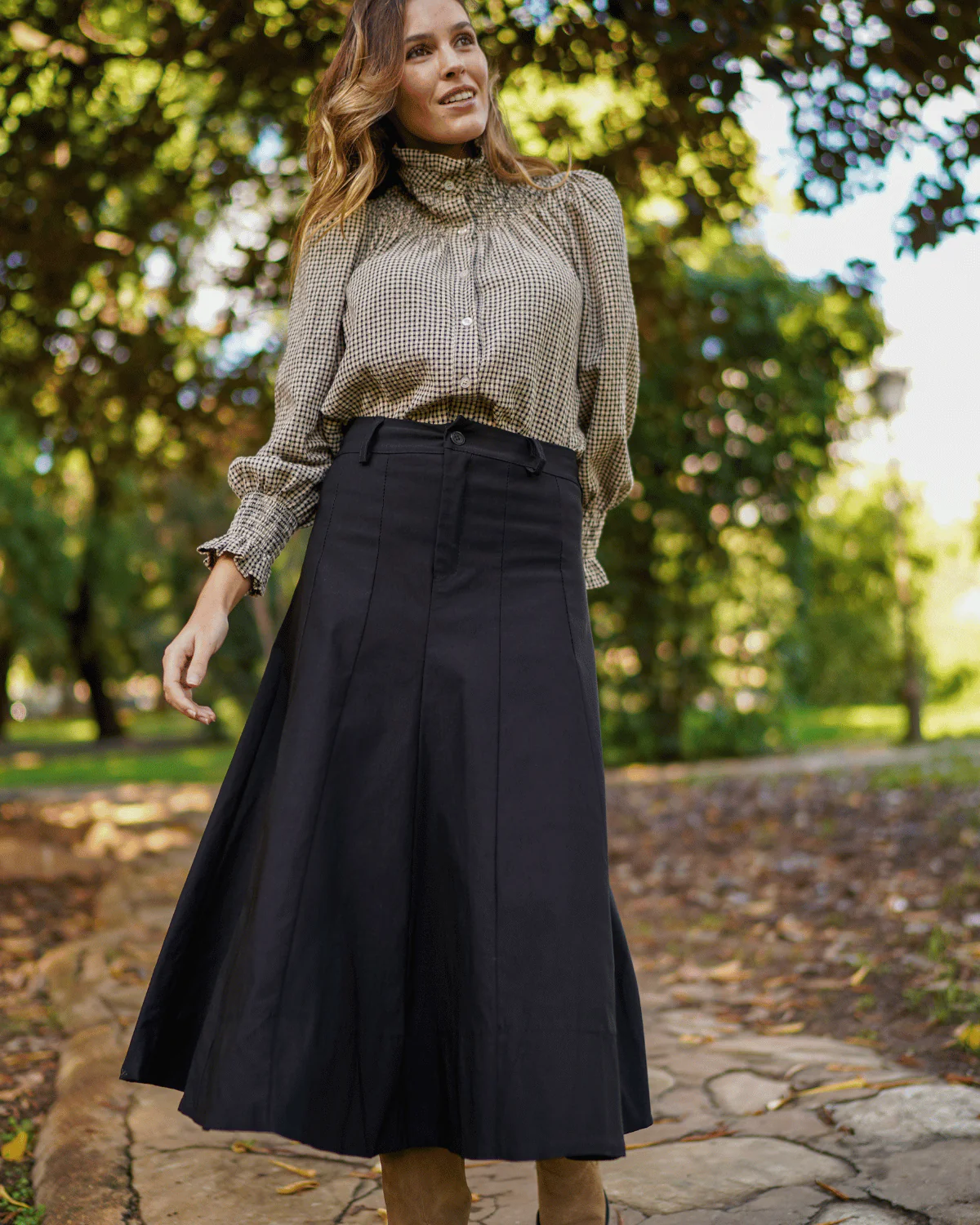 - Falda midi con detalle de costura.