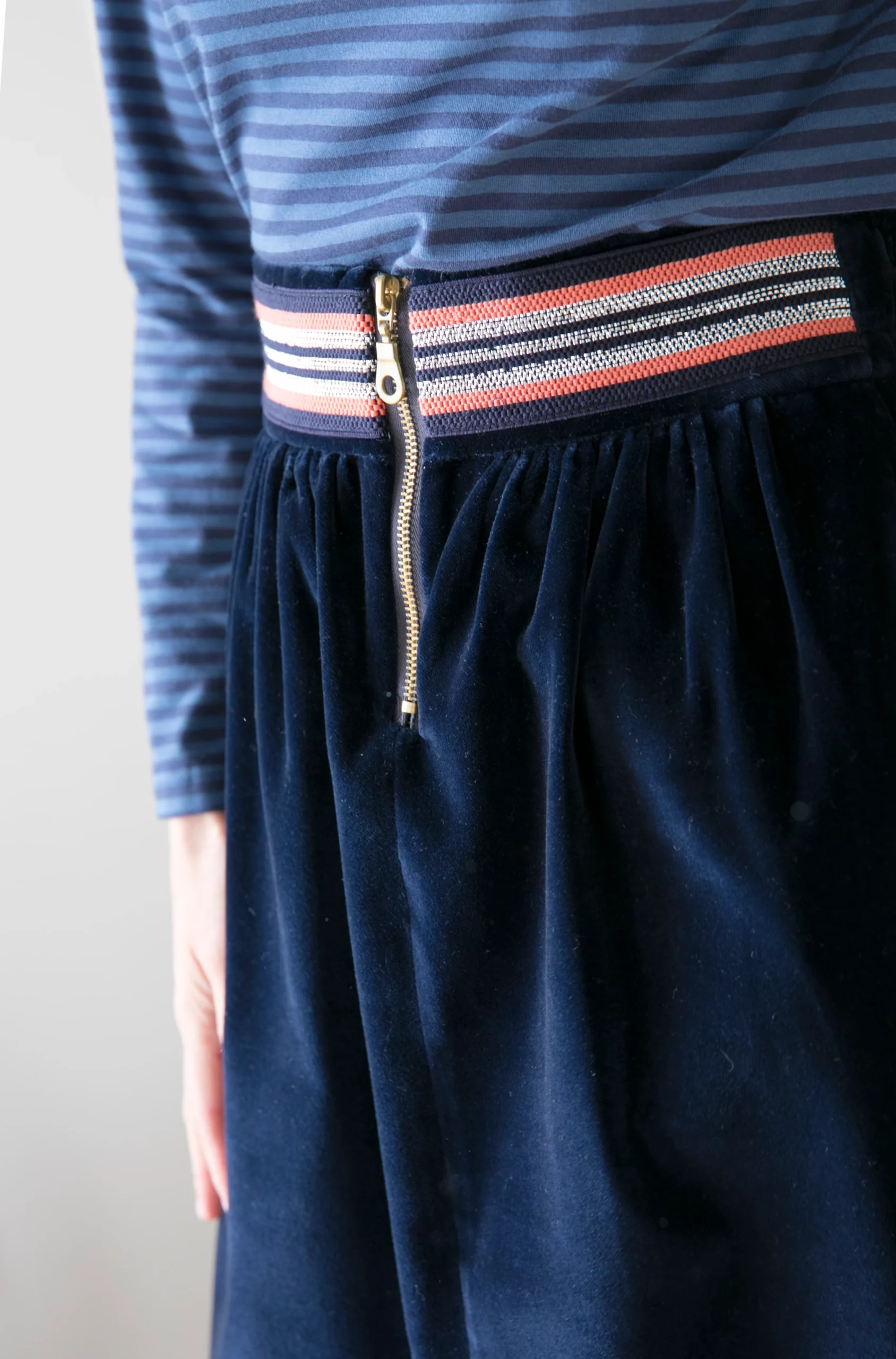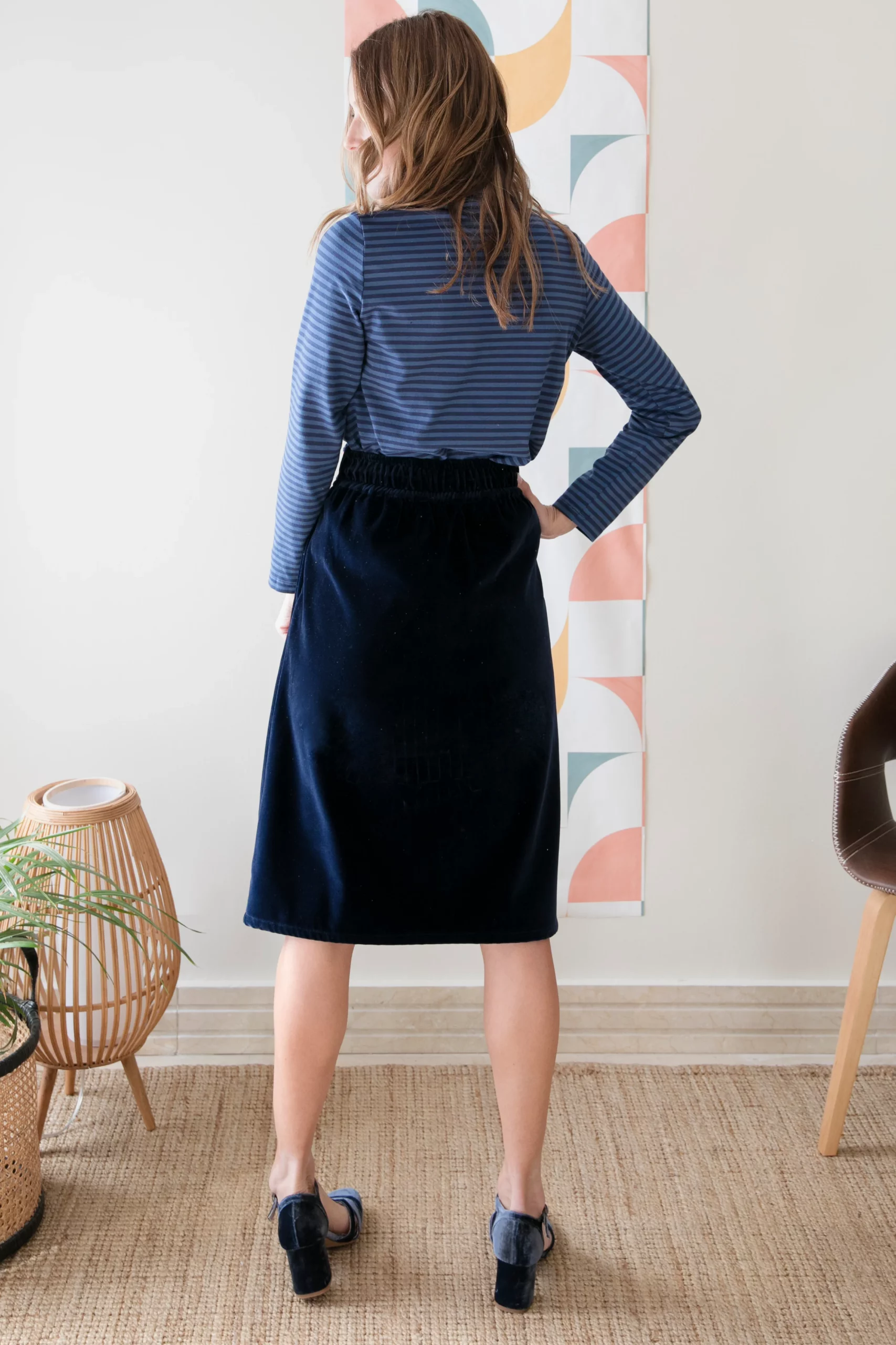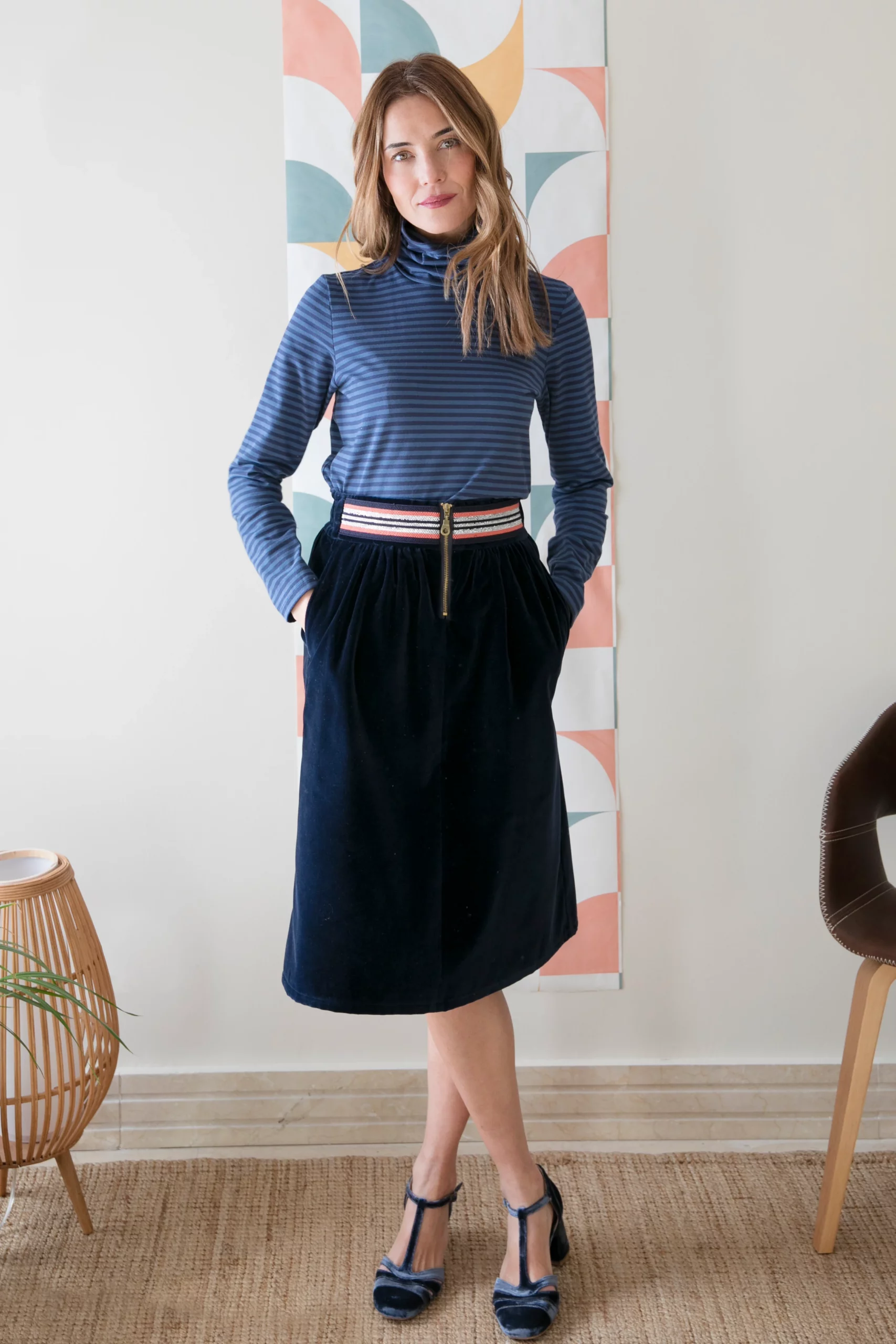 Falda midi en terciopelo azul.