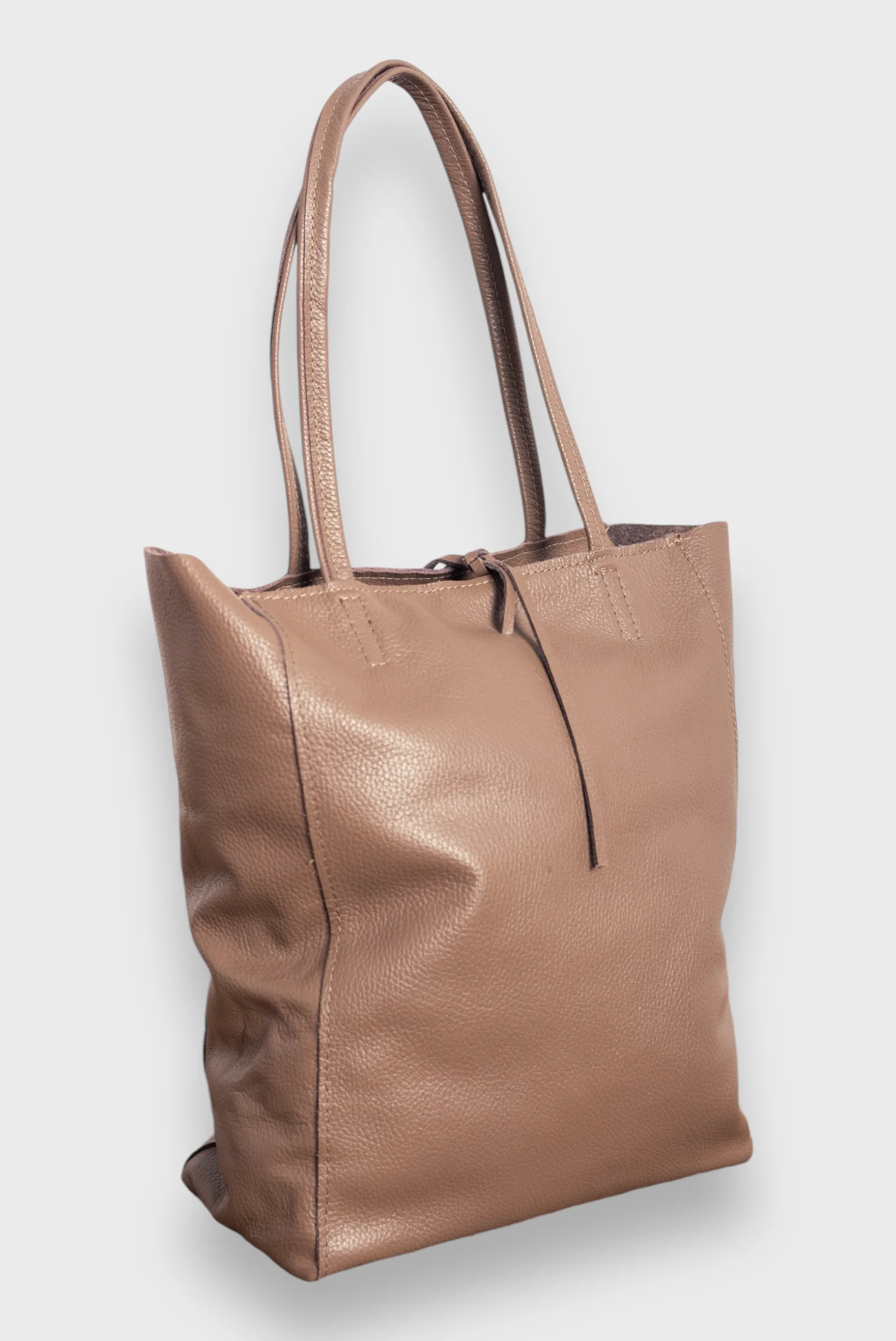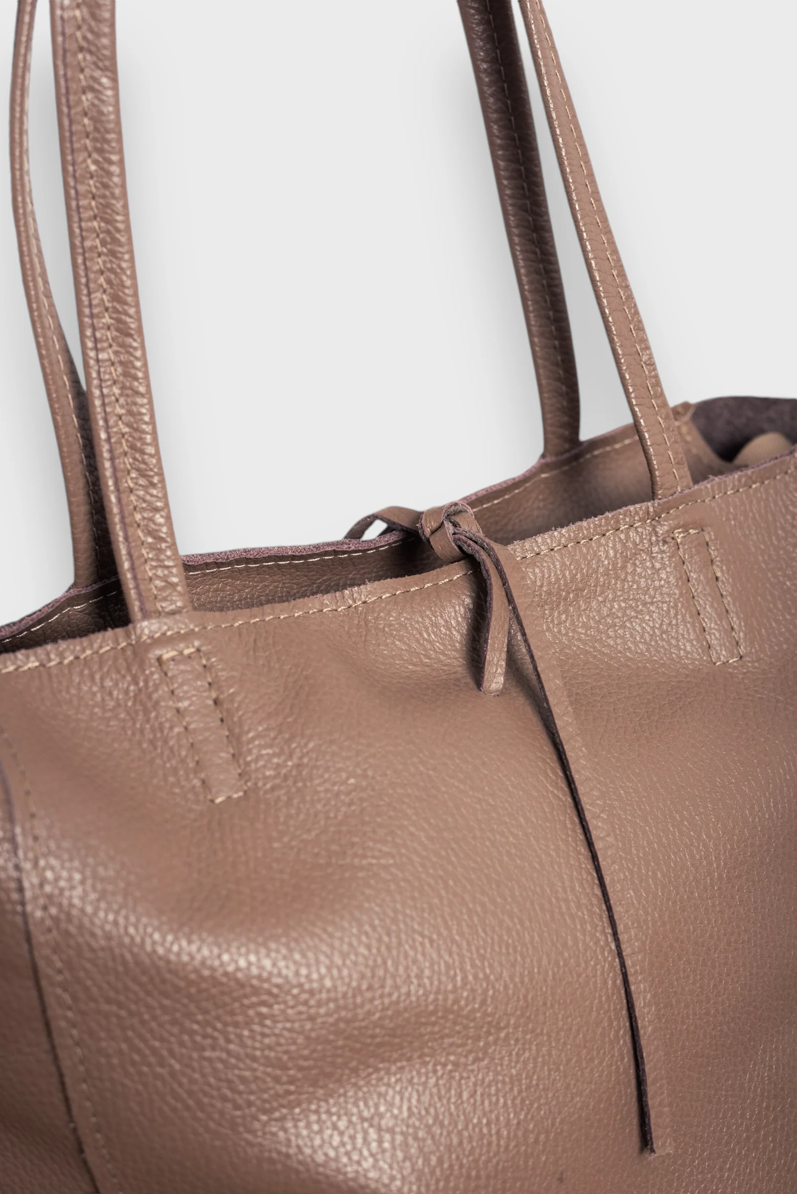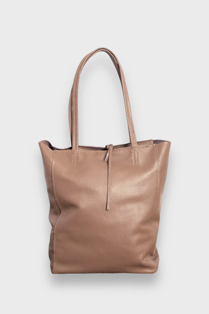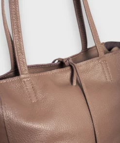 Bolso de piel, estilo saco. Asa para colgar en hombro. Cierre con cremallera y detalle de lazada en piel.
