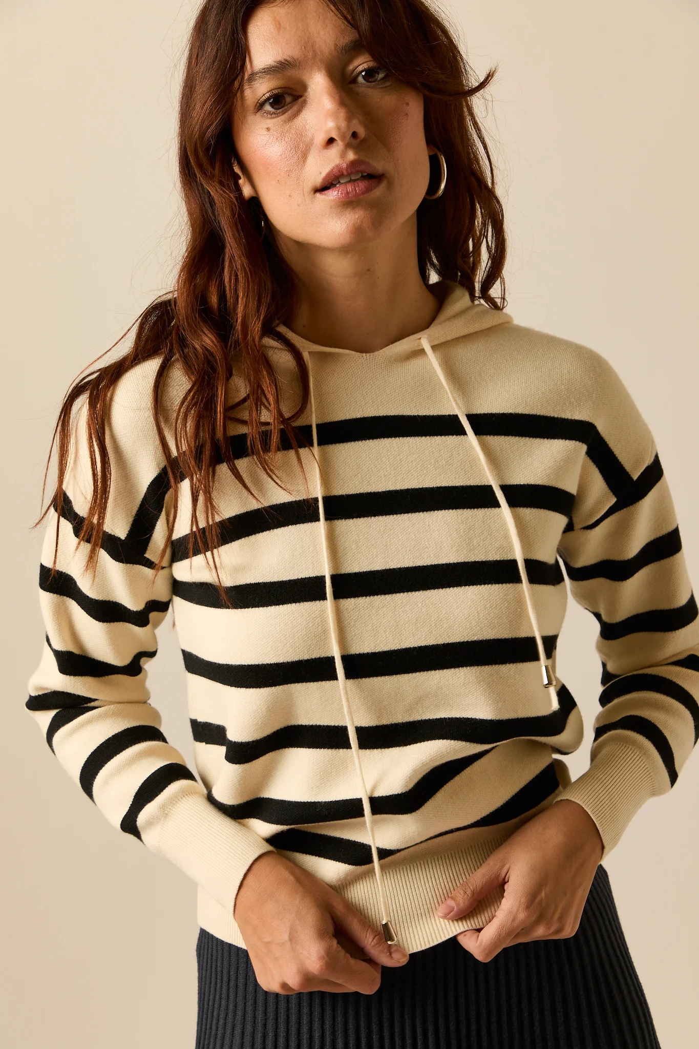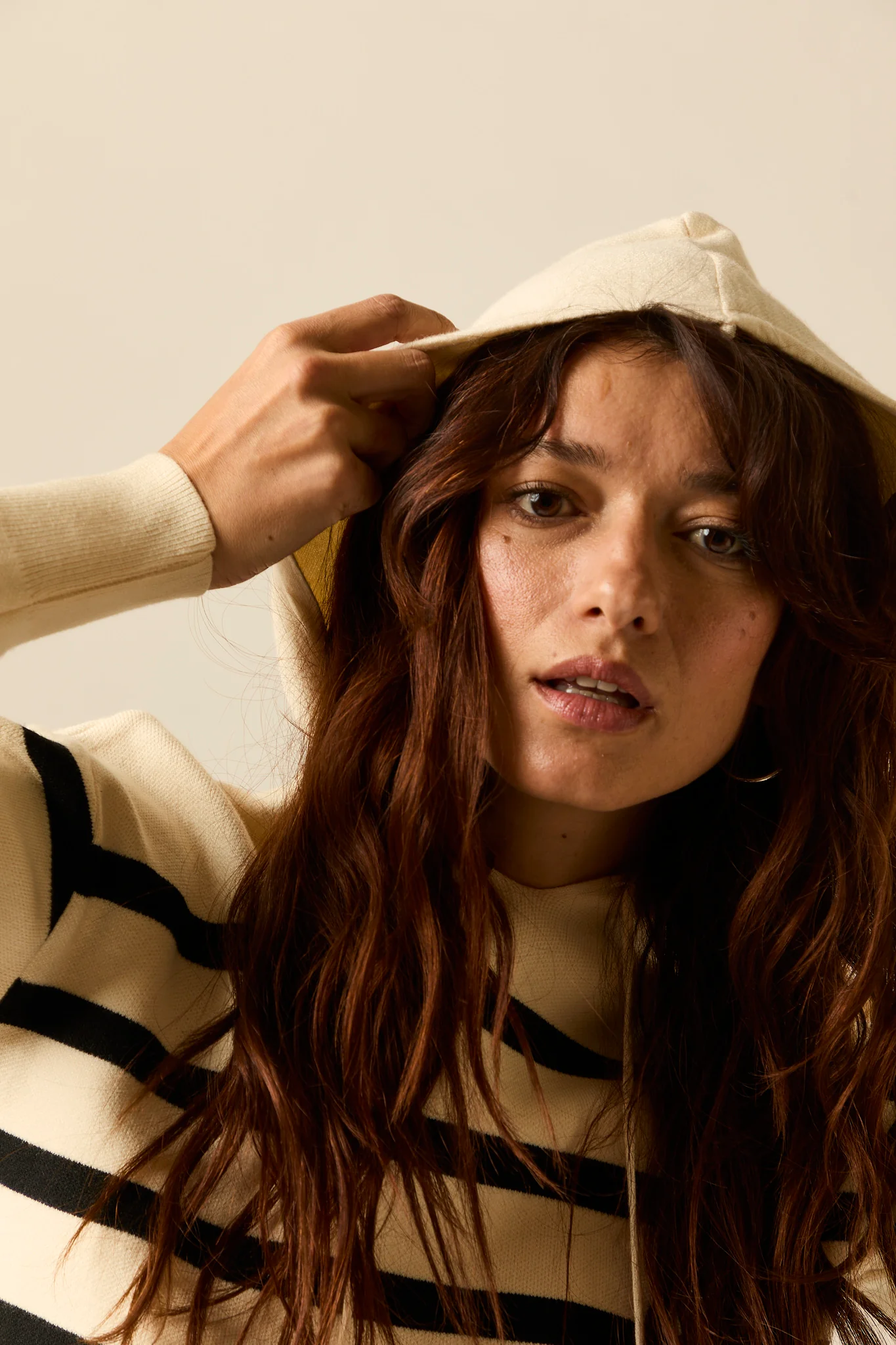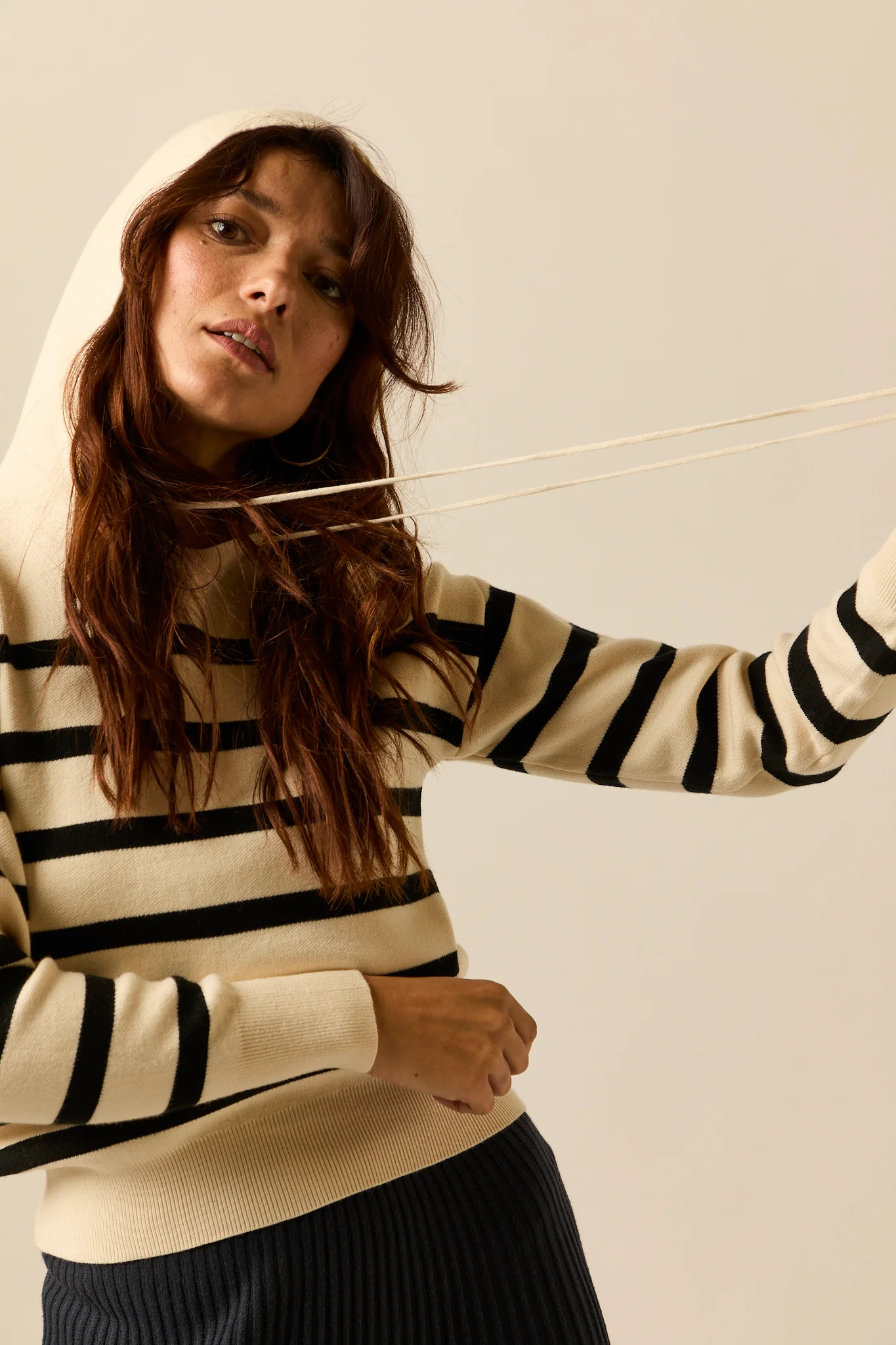 Jersey estilo oversize en color blanco con estampado de rayas en color negro. Capucha con cierre de cordones, manga larga y acabados en rib.