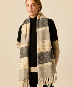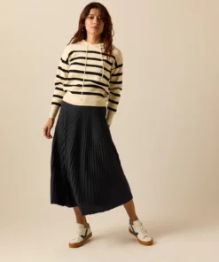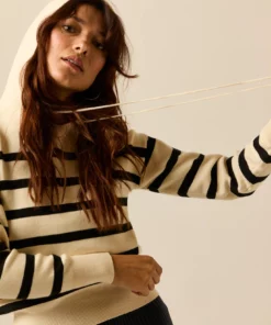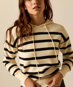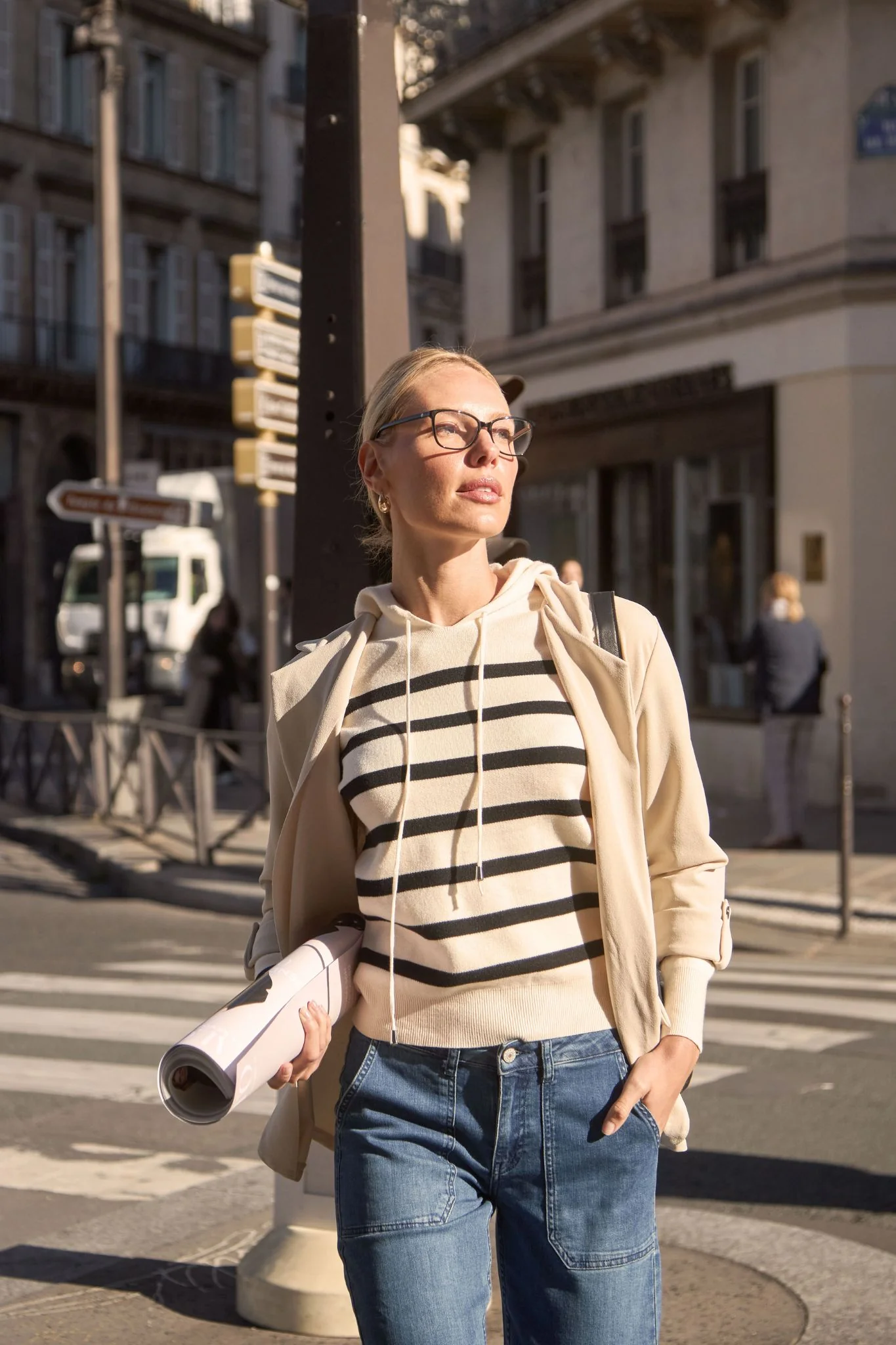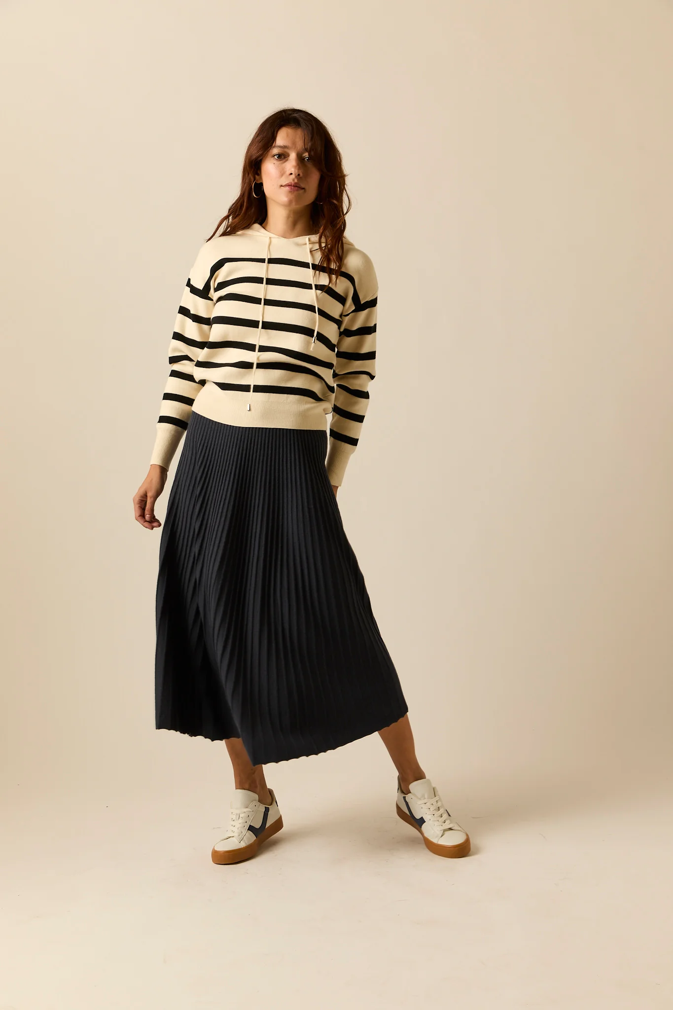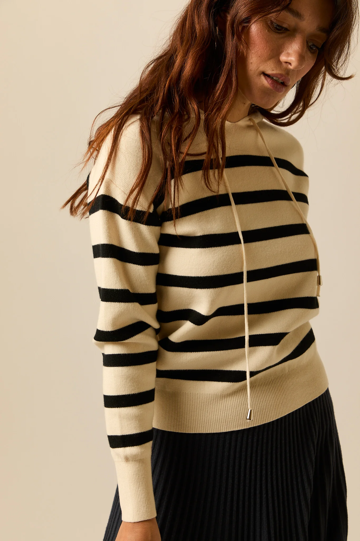Jersey estilo oversize en color blanco con estampado de rayas en color negro. Capucha con cierre de cordones, manga larga y acabados en rib.