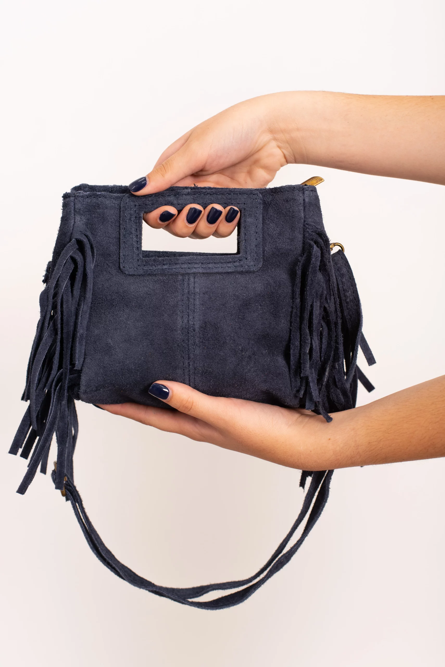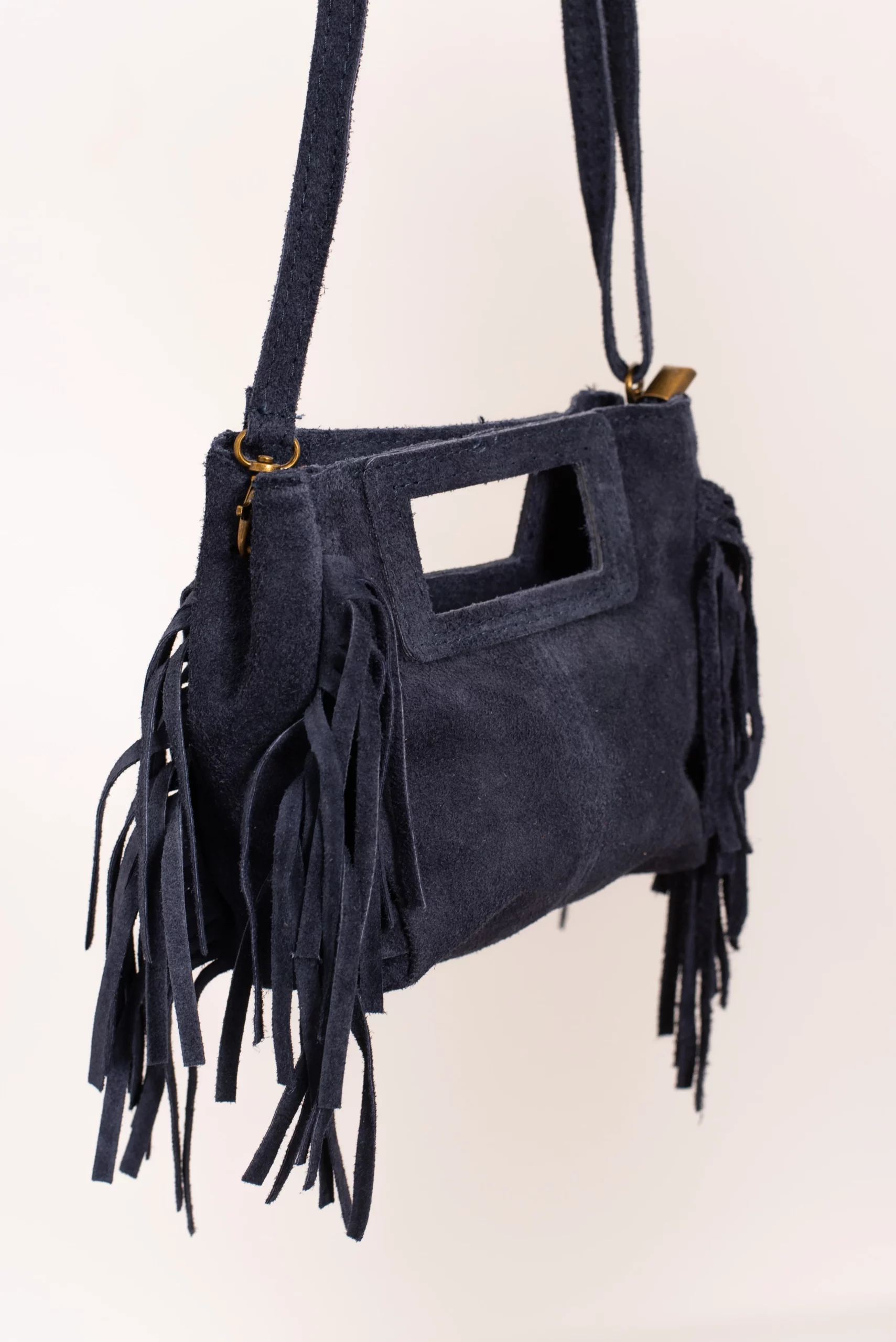 Bolso de piel, serraje. Tamaño mini del bolso Kiowa. Asa corta integrada en el bolso para llevar de mano y larga para bandolera. Flecos en ambos laterales. Cierre con cremallera.