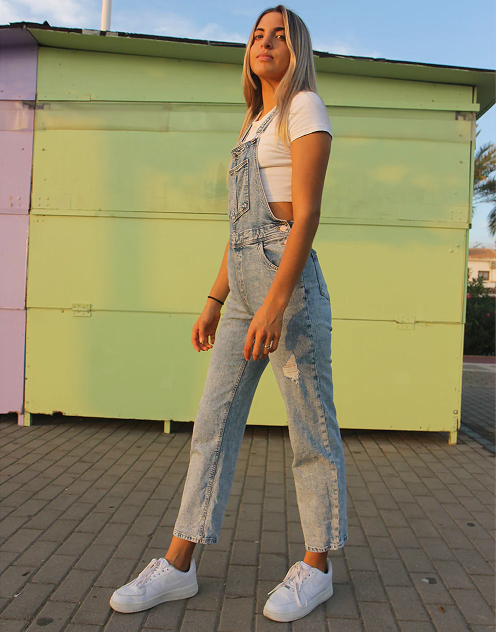 Measurements – 8″(21cm) top of bib – 13″(33cm) bottom of bib – 30″(76cm) waist – 36″(92cm) hips – 29″(74cm) inner leg – 10″(26cm) rise.