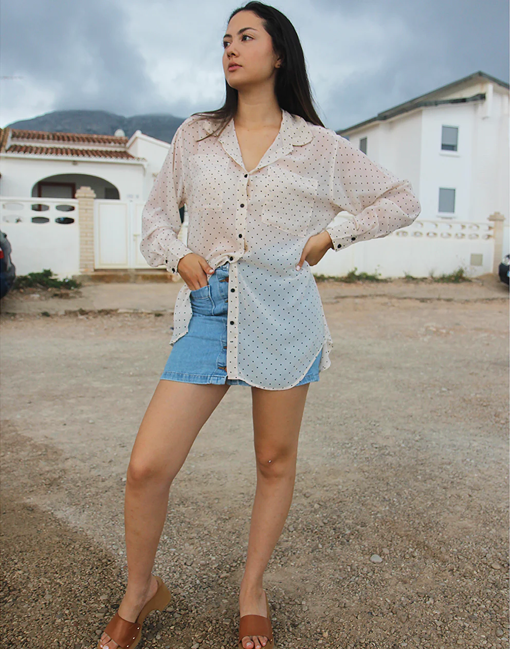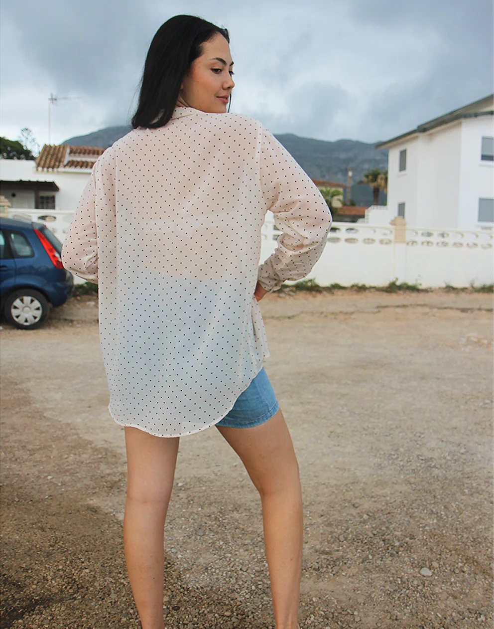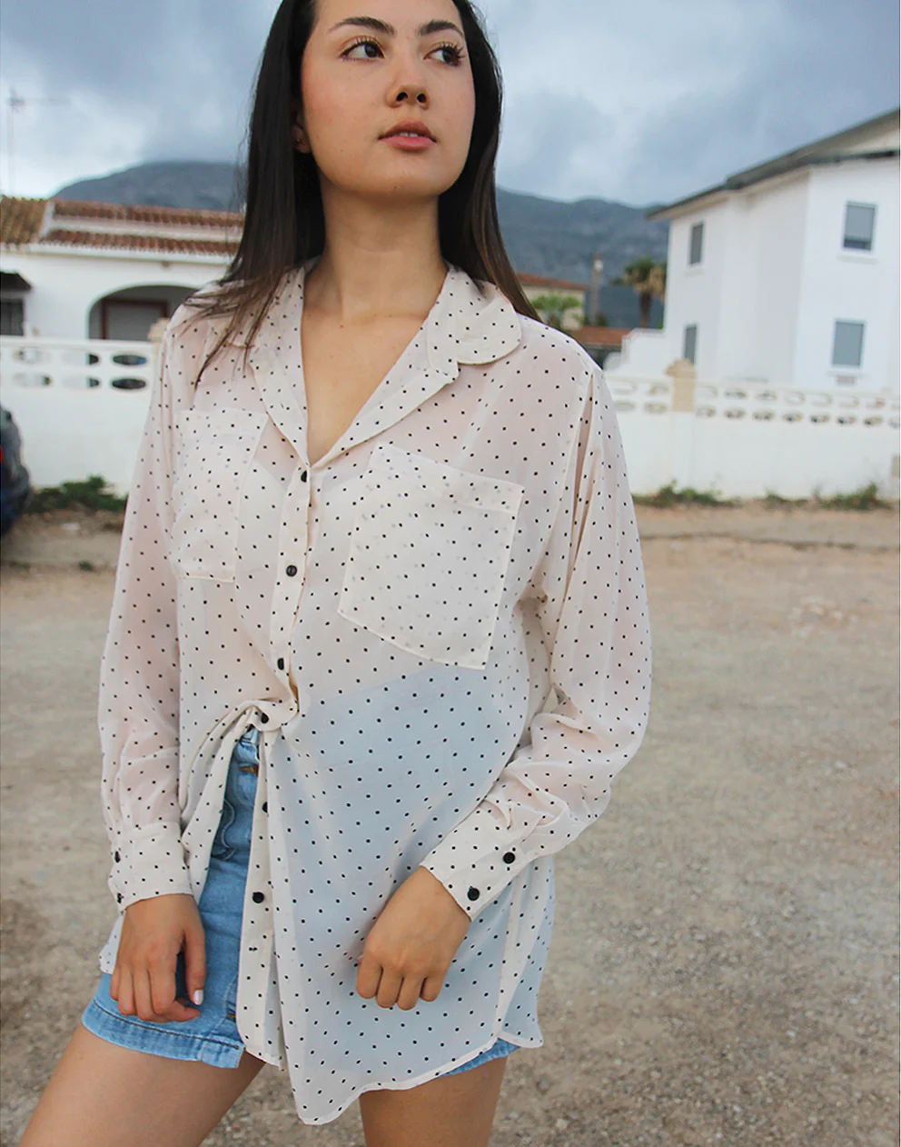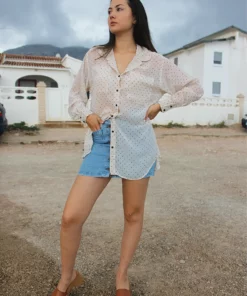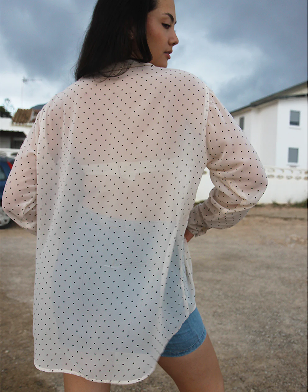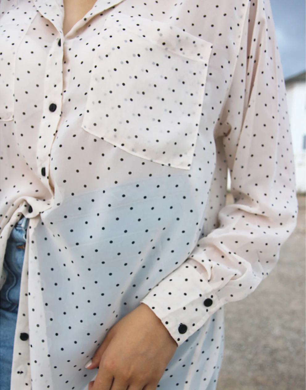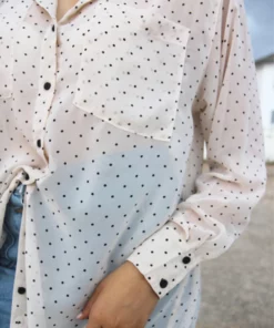 White long sleeve shirt with polkadot print.