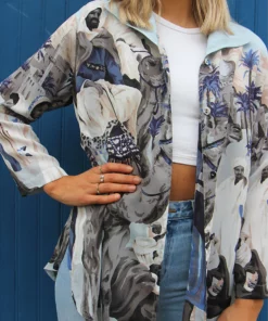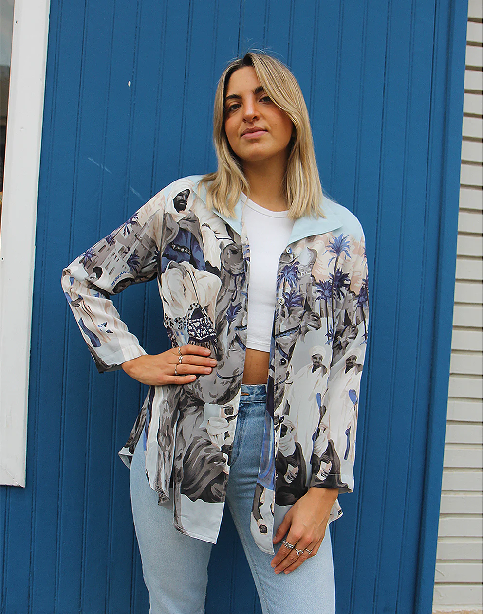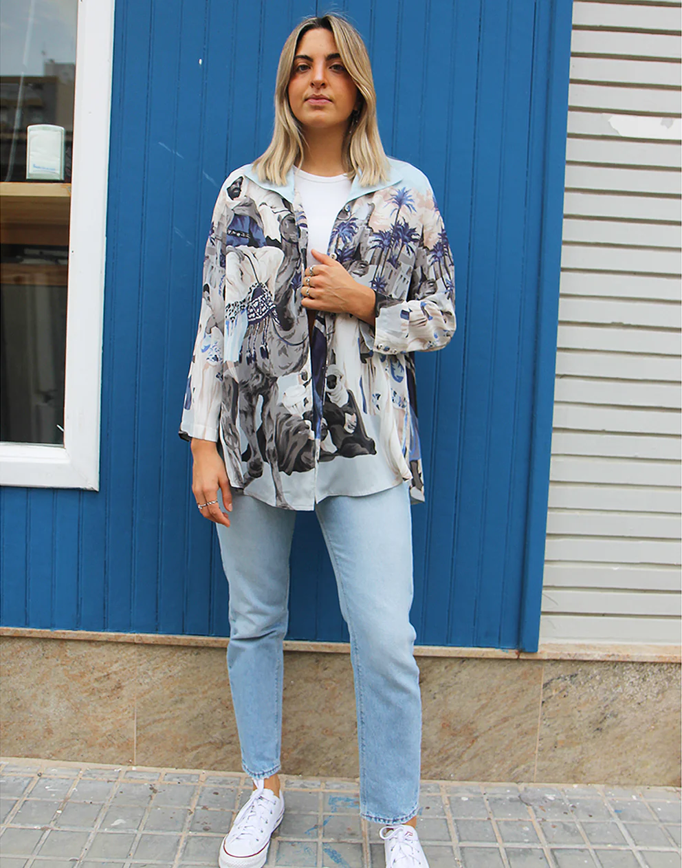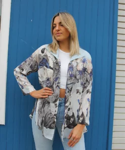 Measurements – 46″/ 117cm bust, 22″/ 56cm sleeve length, 30″/ 76cm shirt length.