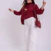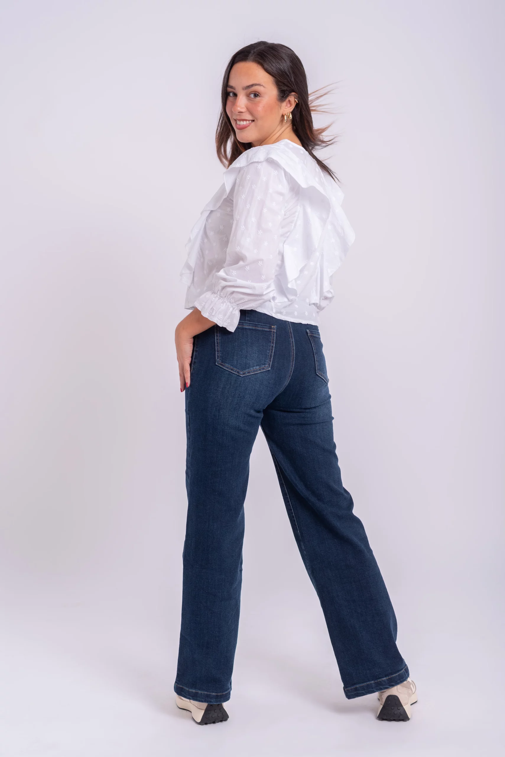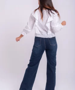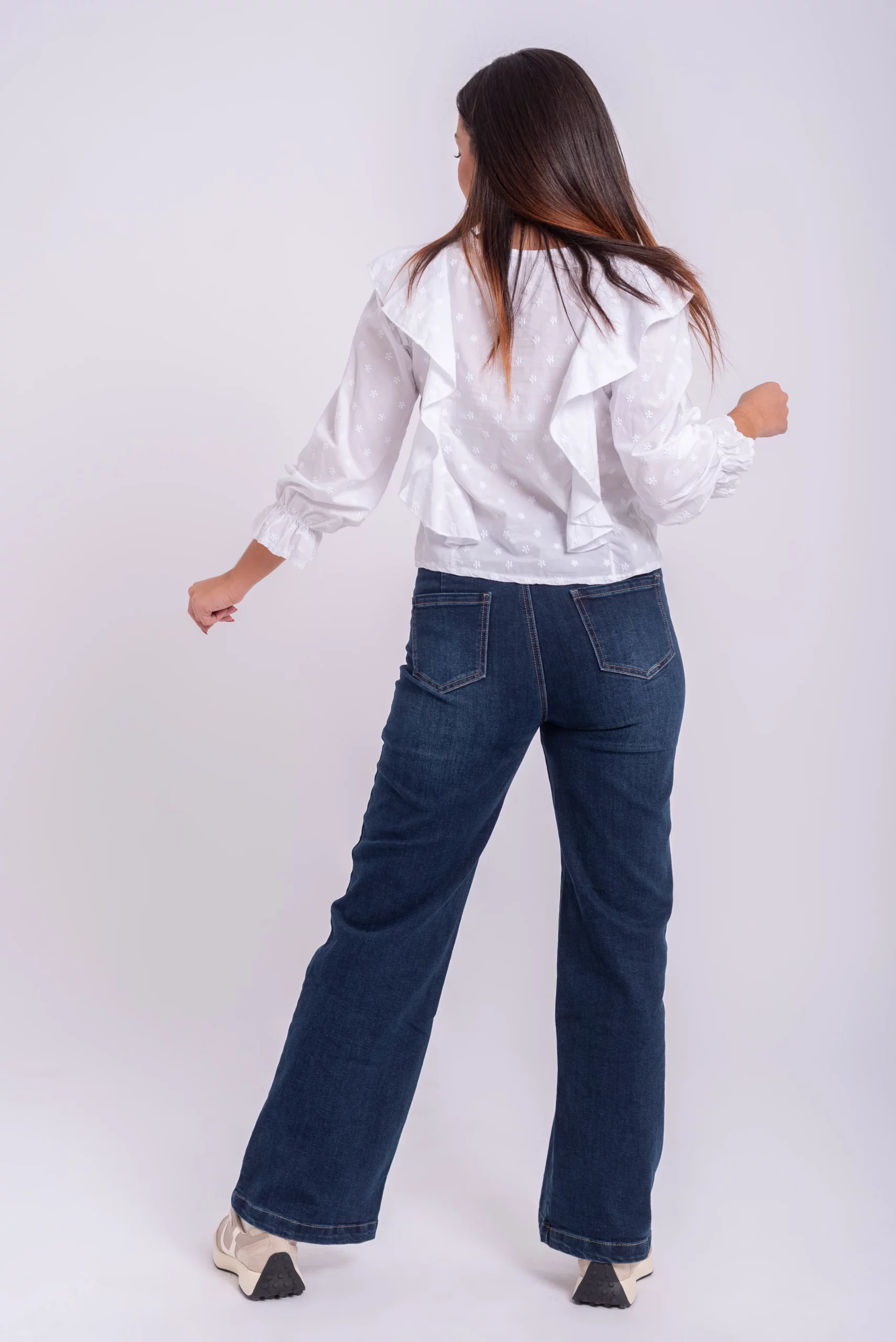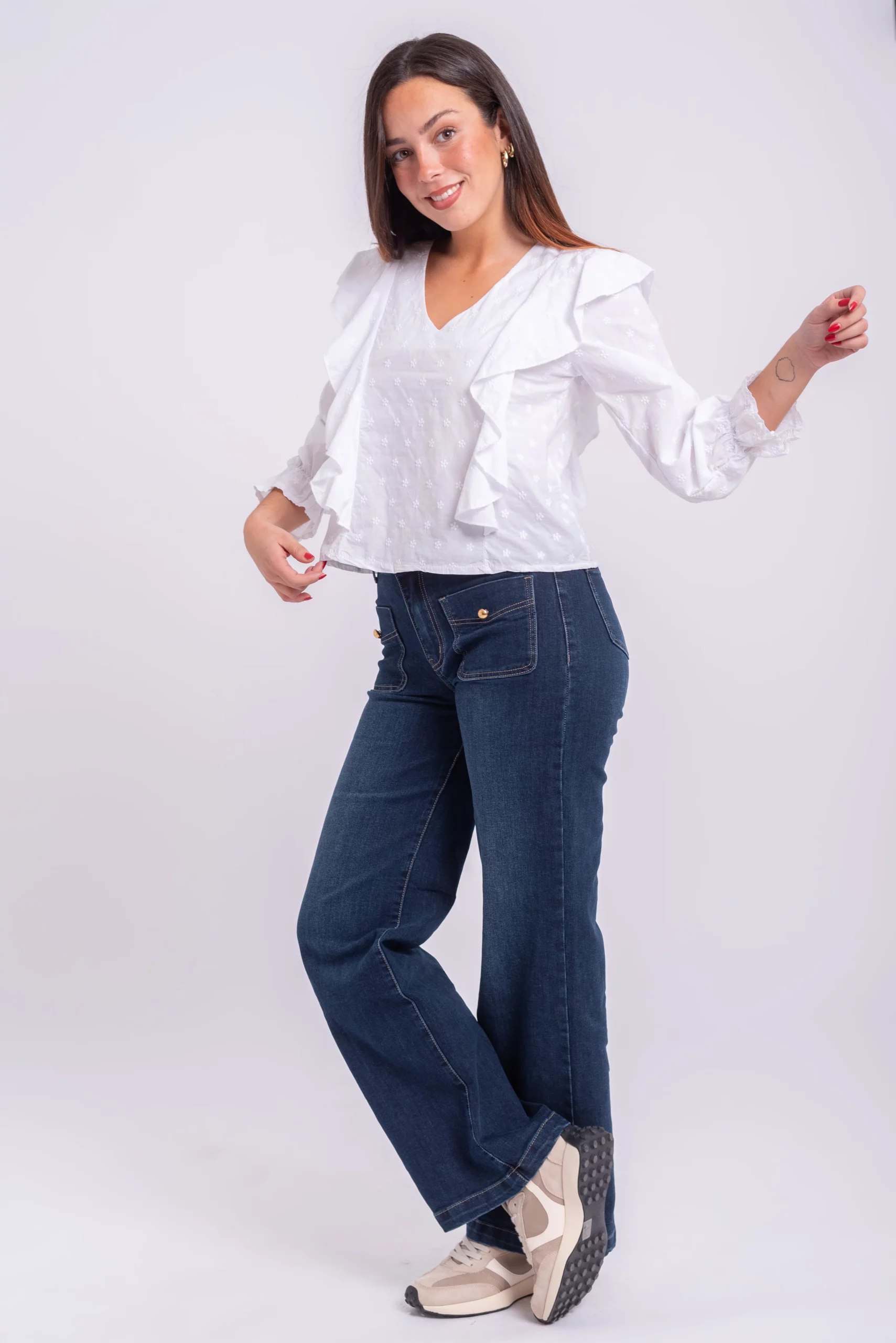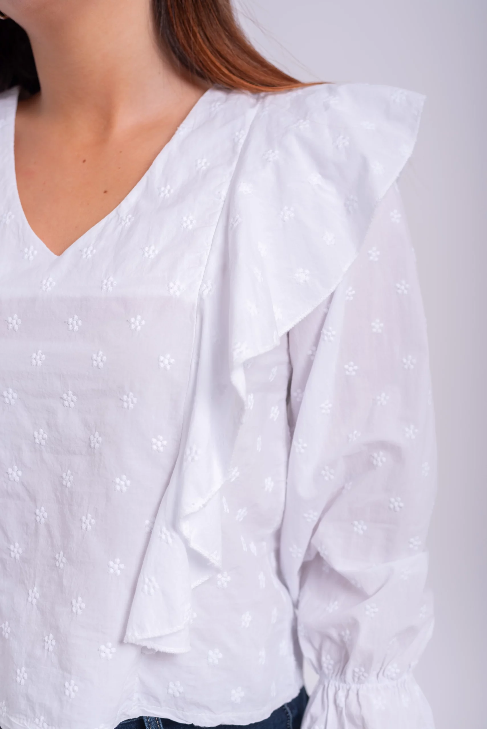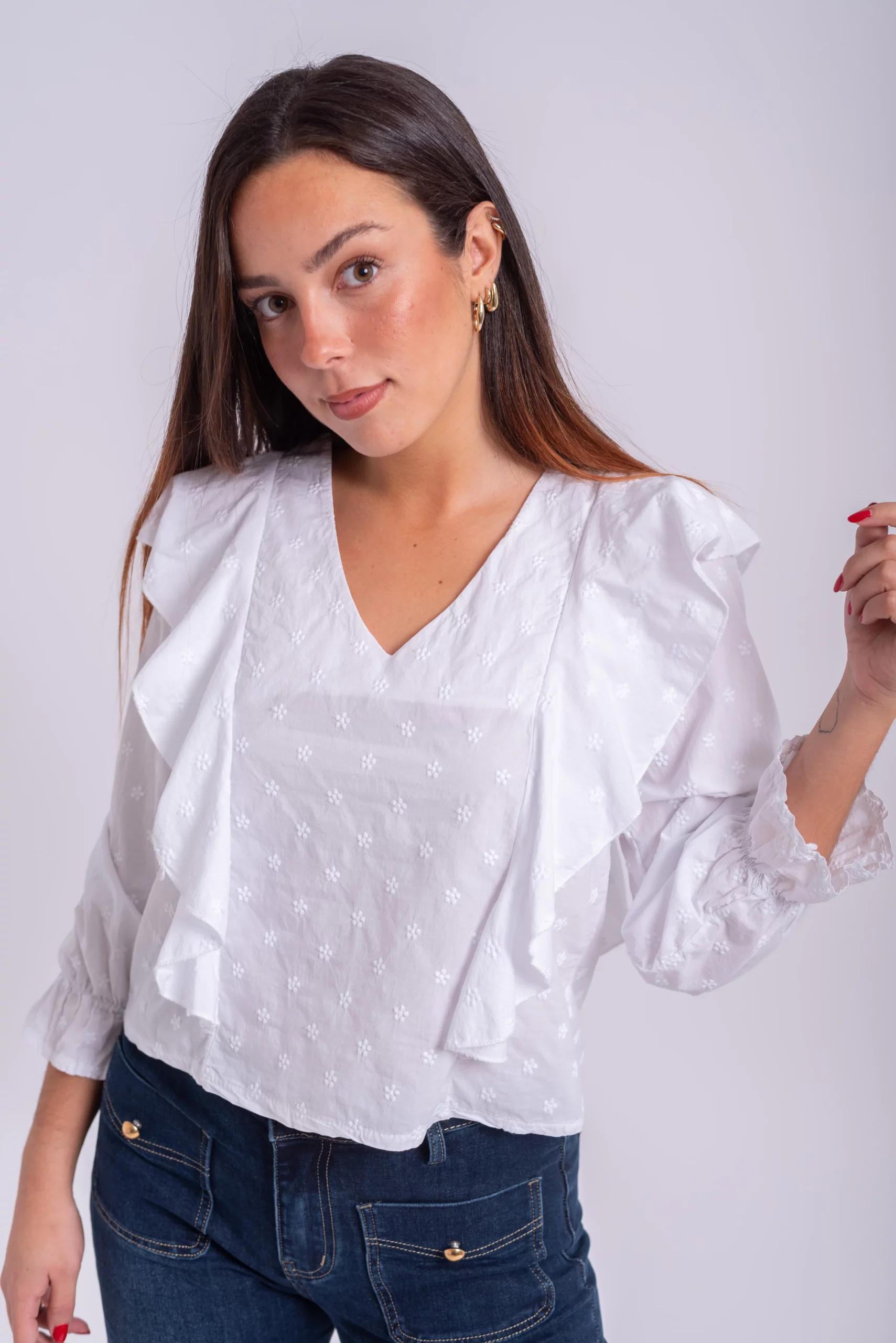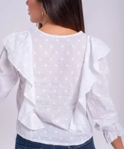 Blusa cuello en pico. Manga larga. Volante sobre los hombros y pecho. Tela con bordado al tono. Ideal en todos los colores.