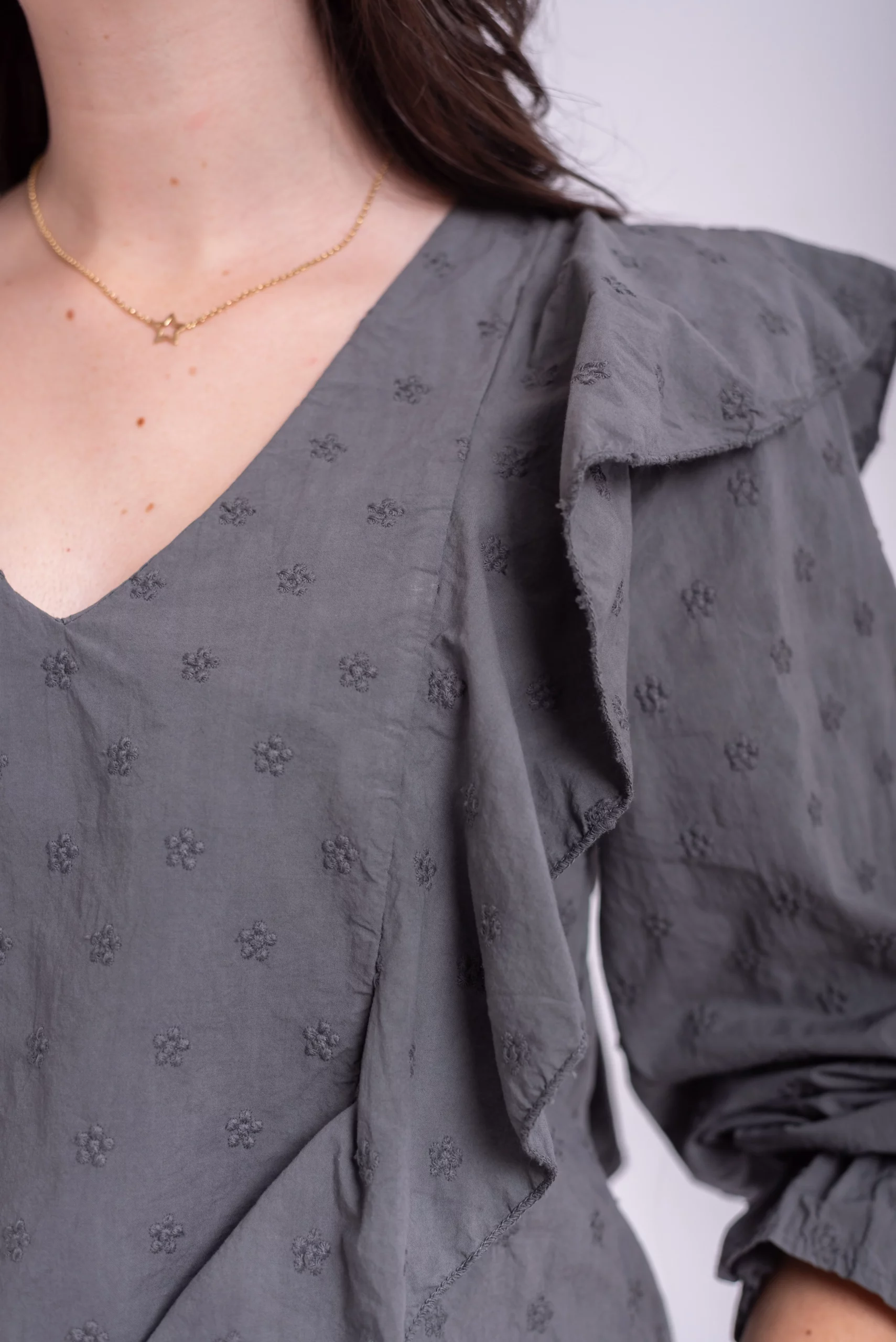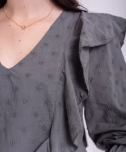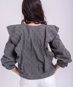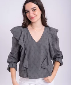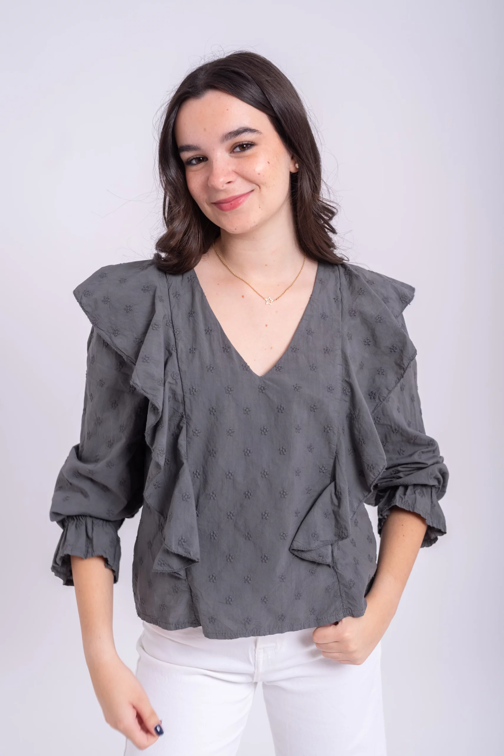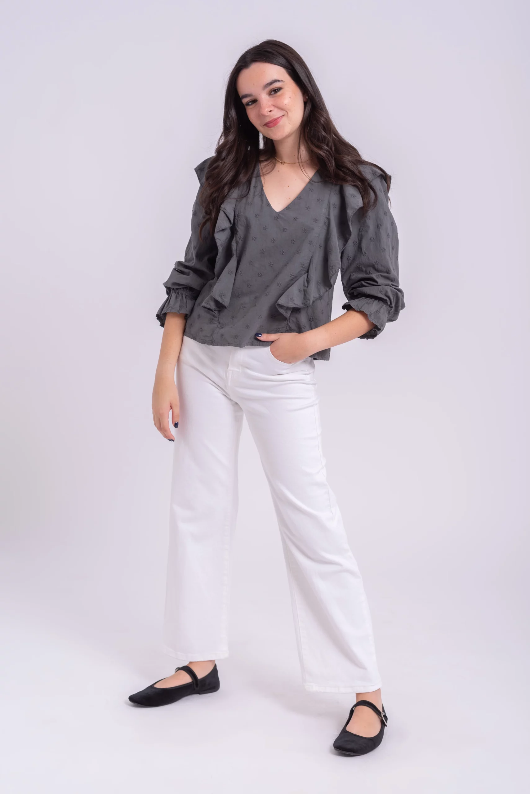 Blusa cuello redondo. Manga larga. Volante sobre los hombros y pecho. Tela con bordado al tono. Ideal en todos los colores.